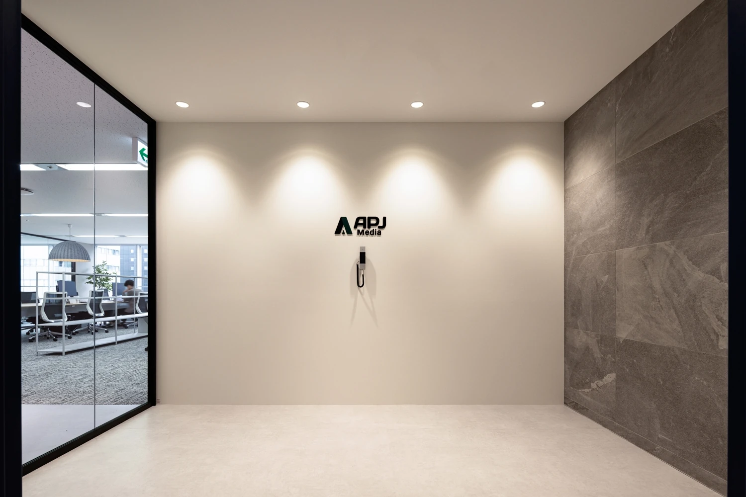 社員のエンゲージメント向上とお客様の信頼感醸成のため、APJ Media様を体現する上質なデザインとしています。ワークスタイルは、ベースワーク+ABWの働き方を実現。コミュニケーションが取りやすくなるよう、すぐに集まり、またベースに戻ることができるエリアを多くつくりました。オフィス中央のフリーエリアには存在感のある本棚を中心に、家具はコーポレートカラーであるグリーンを中心に選定。明るく開放的な雰囲気をベースにしながら、ゴールドのブラケットライトやダークブラウンの木目により親しみやすさと上質さを兼ね備えた空間を構成しています。ABWを基本とし、社内会議などで集まり使用できる場所として計画しました。ベースワークのエリアは開放的な窓面を全面に活かしています。