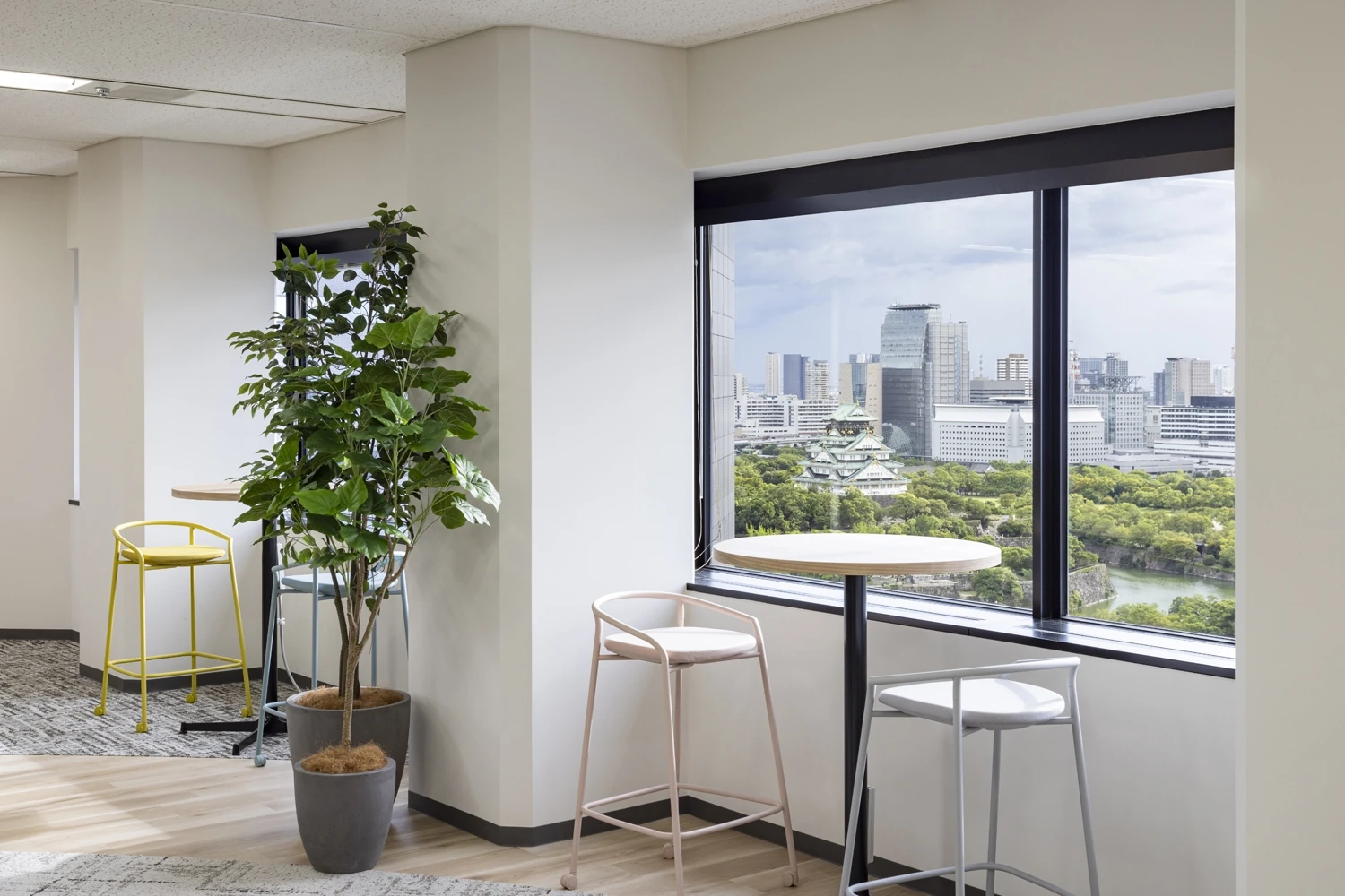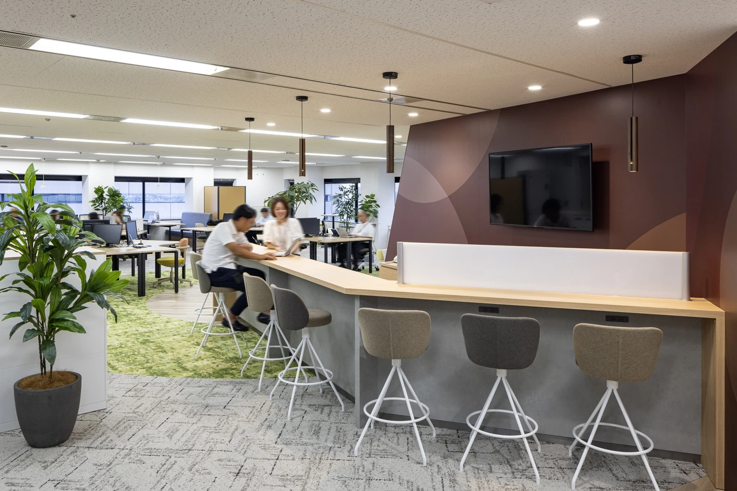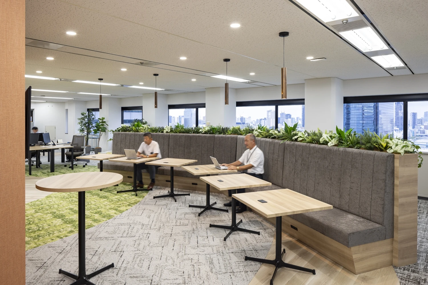 人が行き交い、帰りたくなる“街”をイメージし、コンセプト『WORK TOWN』のもとオフィスを再定義しました。ワークスペース中心のシンボルとなる壁にはコーポレートカラーを取り入れ、床は中心から波紋のようにオフィスの隅々まで広がるデザインとし、オフィスを街のように回遊してほしいという想いを込めました。中心壁の周囲には、カウンターを起点にしたコミュニケーションの場、プレゼンテーションにも使えるソファスペース、しっかりと働くブーメランデスクなど、様々な機能を設け自然な回遊を促します。窓際にはブース席や大阪城を眺めながらタッチダウンミーティングができるハイデスクなど、借景を取り入れたしかけも用いています。