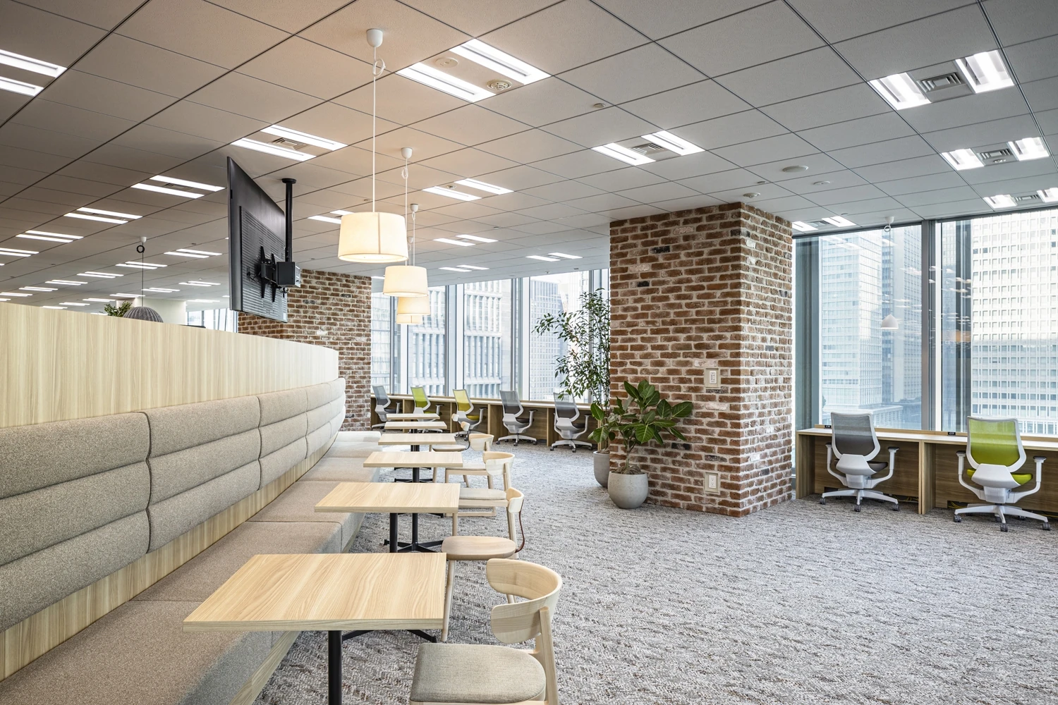 執務エリアは、笑顔であふれるワークスペースを目指し、オフィスのある東京駅の赤レンガから連想したブリックタイルやグリーン柄のカーペットなど楽しさを感じられる色味や素材で構成。エントランスから続く円弧状のメイン動線沿いにベースワークデスクを配置しました。円弧状に配置することで社内の一体感と連続配置した際の単調さを払拭させています。円弧動線の外側には、協業スペース「チームワーク」、さらに外側に集中スペースやリフレッシュ兼コワーキングスペース「リフレッシュワーク」があり、三層のワークスペースで多様な業務に対応できるデザインになっています。