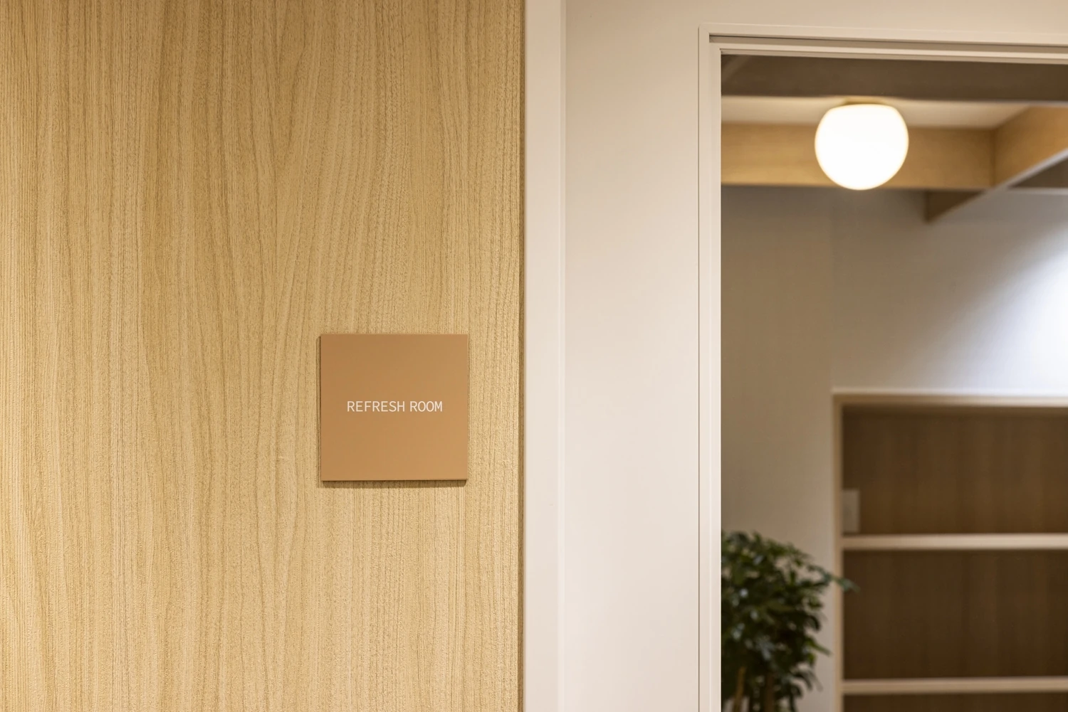 2階執務エリアは、すべての座席を見渡し壁面のモニターも確認できるレイアウトで、スムーズにコミュニケーションが取れる仕組みにしています。コールセンターという業務上、休憩時にはしっかりリフレッシュできるよう、執務エリアから離れた場所に照度を抑えた仮眠室やコミュニケーションが取りやすいリフレッシュルームを設けました。