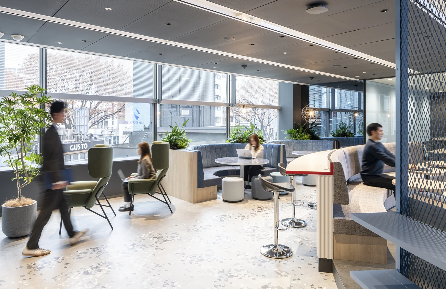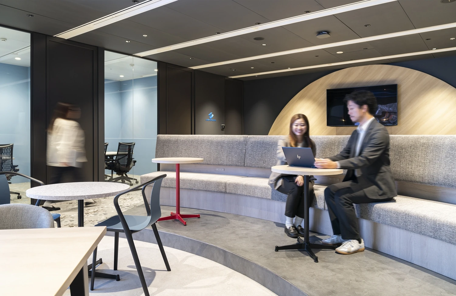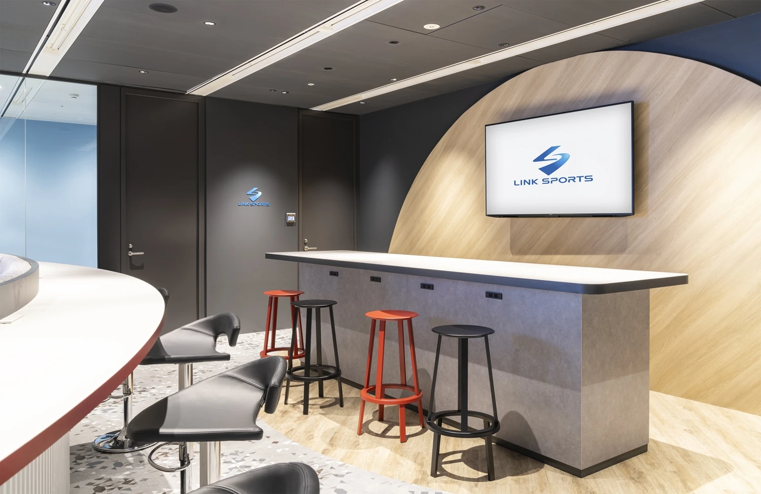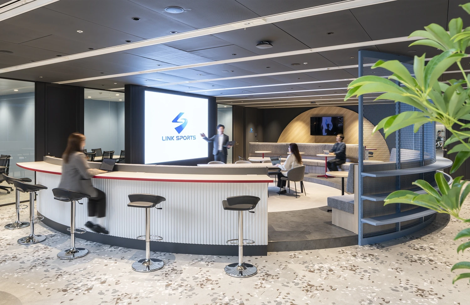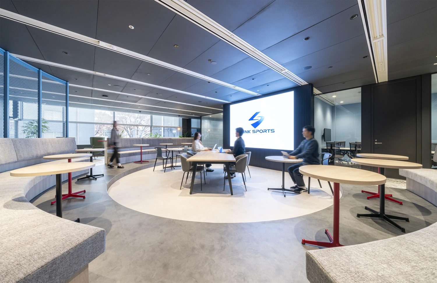 イノベーションスペースは、スポーツが行われるスタジアムからイメージし、円状の空間の中央にLEDビジョンを配置。スポーツバーのように一体感を醸成し、高いモチベーションを生む空間となっています。周囲には、円の形状に合わせた曲線のソファやビックテーブル、集中できる1人用ソファやパントリーカウンターなど多様なはたらき方ができる家具を中心に配置しました。