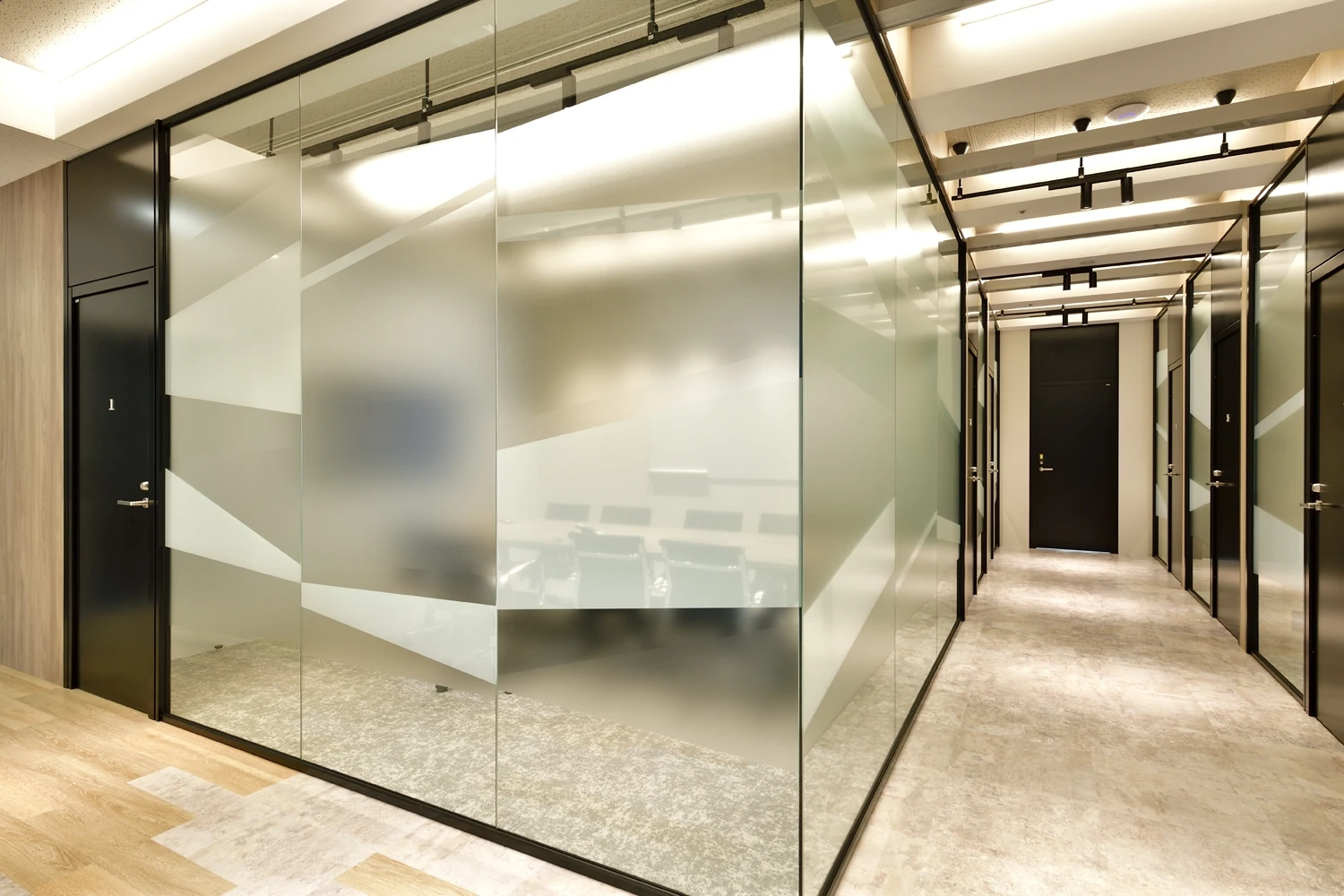 オフィスは固定席運用で、将来的な増員計画も見越したレイアウトにしました。オンラインミーティングが多いため、オンラインブースも多数設置しています。デザインテーマは『Beating Port』。受付カウンターや会議室のガラスシートに凹凸やエッジを効かせたデザインを取り入れビートを表現しました。ビートで気持ちを高め、訪れた方が安心して面談や打合せができるよう、木目や暖色系の照明を取り入れています。