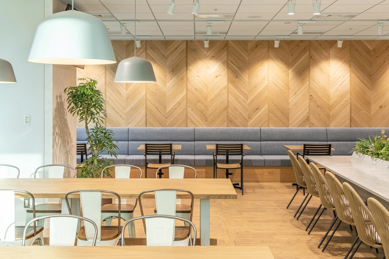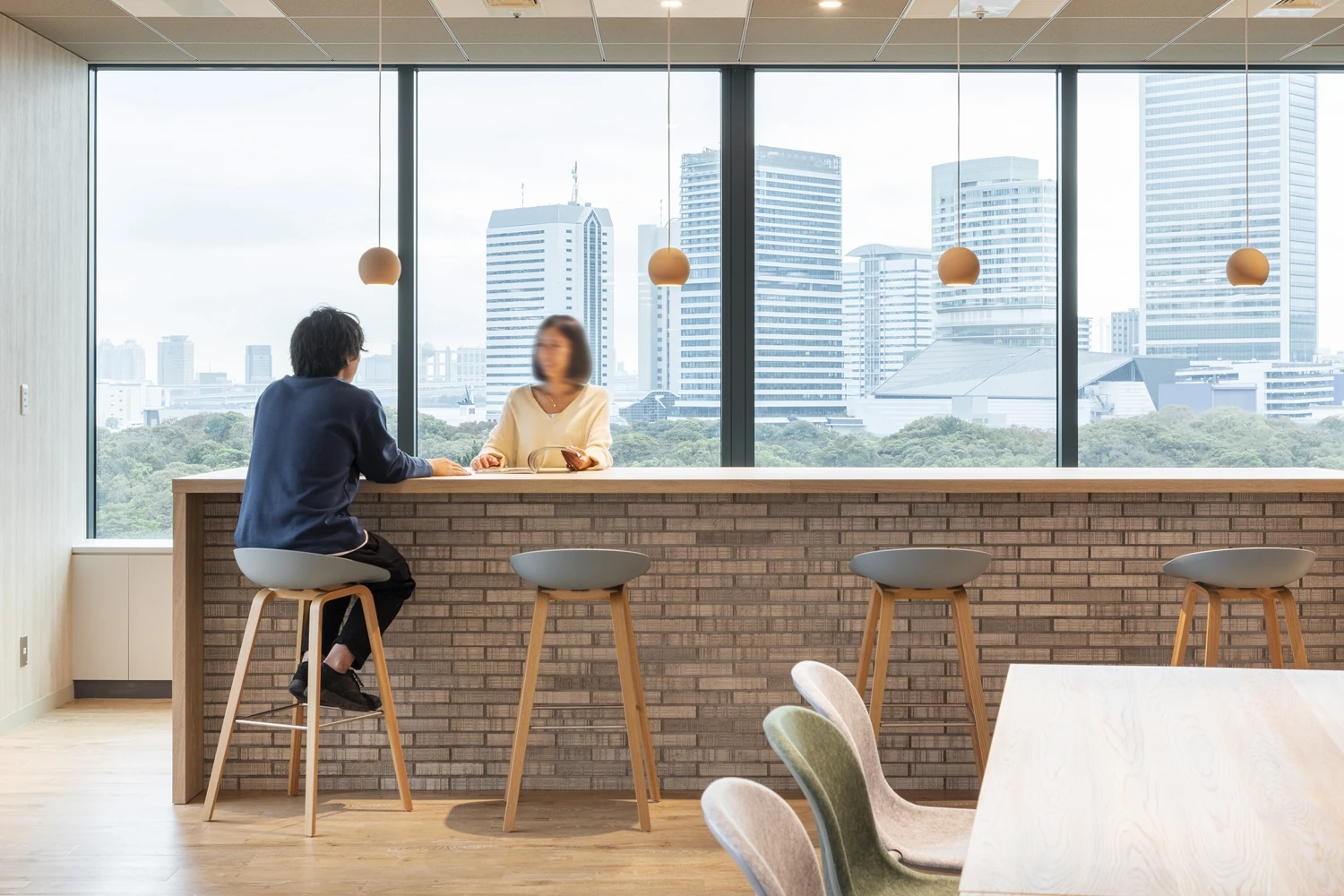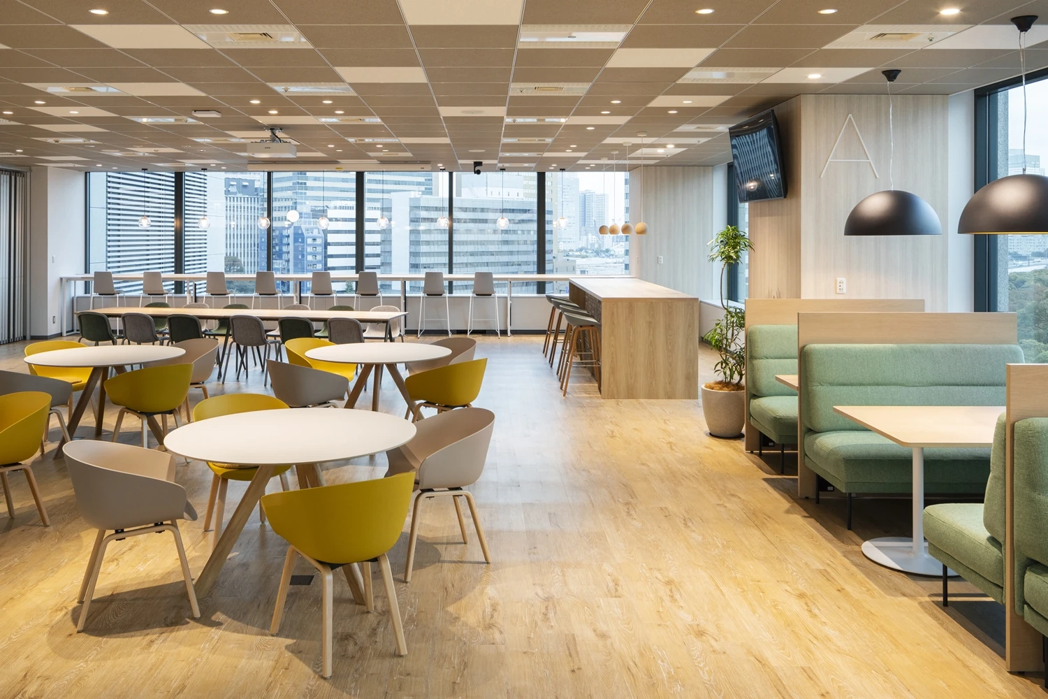 新オフィスは「流れを変える」第一歩として、デザインコンセプト『MACHI』のもと設計しました。街を歩くと、さまざまなヒトやモノからインスピレーションを受け、感性が磨かれ、新しいアイデアや発想を生み出していくことができることから、このコンセプトを導きました。バルブメーカーから港町をイメージし、エントランスをPORT(玄関口となる港)、飲食エリアをCANTEEN(港近くの食堂)としてデザイン。複数フロアから1フロアになることもあり、より一体感を醸成できるようプランニングしました。フリーアドレスを導入し、どの席に座っていてもクイックに打ち合わせができるようミーティングスペースを点在させています。