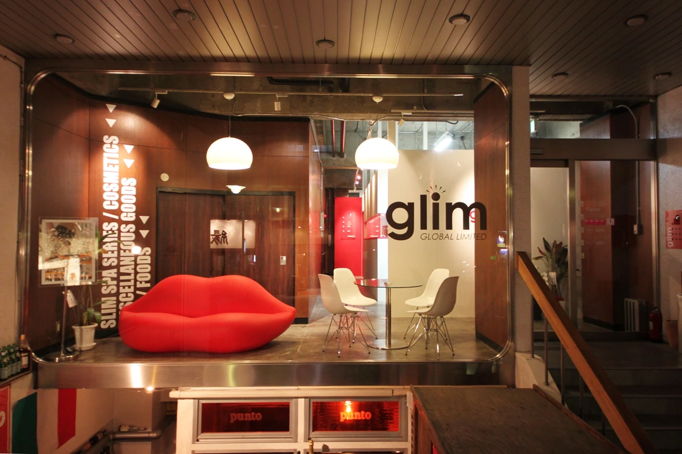 古き良きと新しさを融合した、斬新なオフィス。1階通路には商品が飾られ、コーポレートカラーの赤が素敵に演出しています。2階ワークスペースはまるでオフィスとは思えない、わくわくする空間となりました。外からのアプローチもまるでどこかの店舗のような印象を与えます。夜には照明がよく映え、とてもロマンチックです。