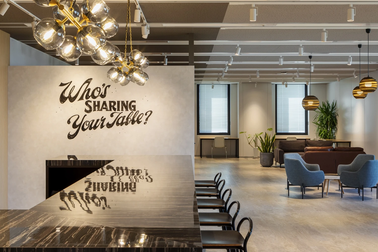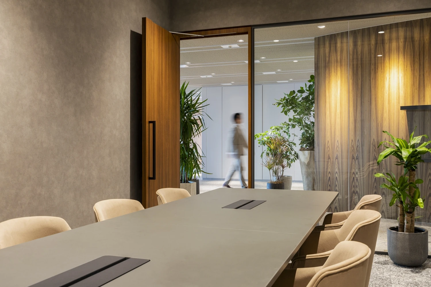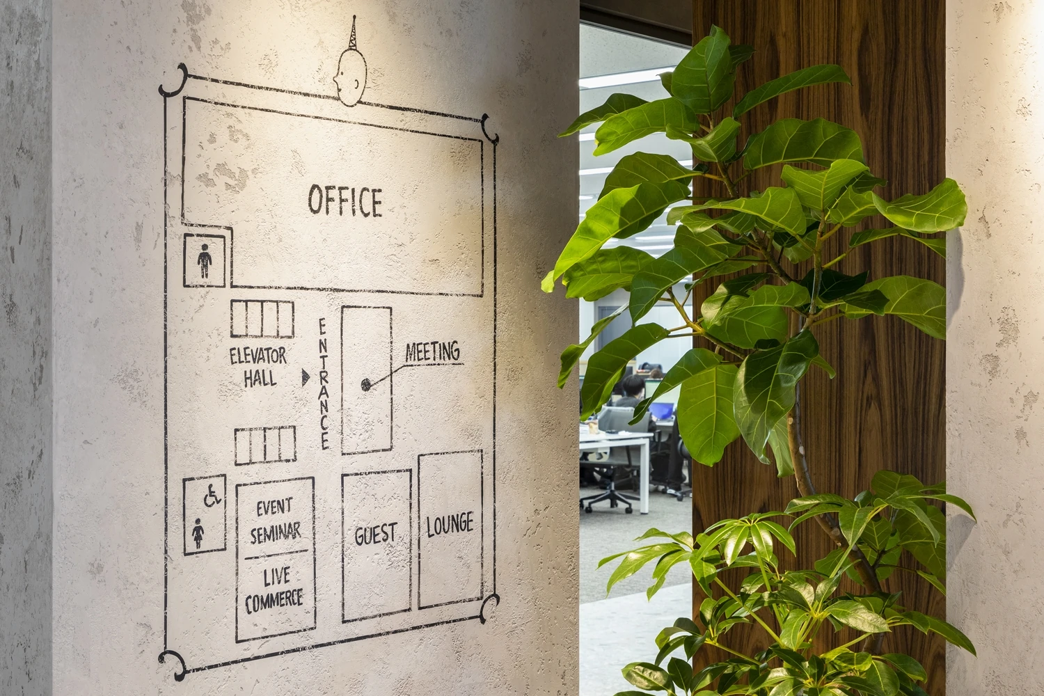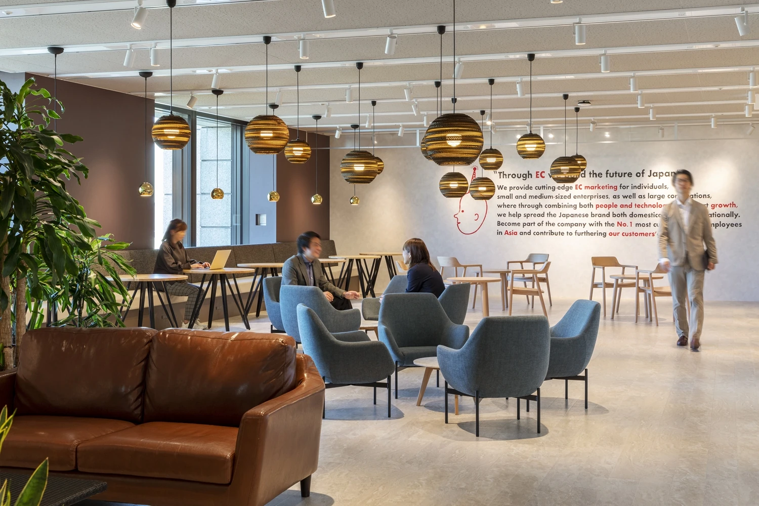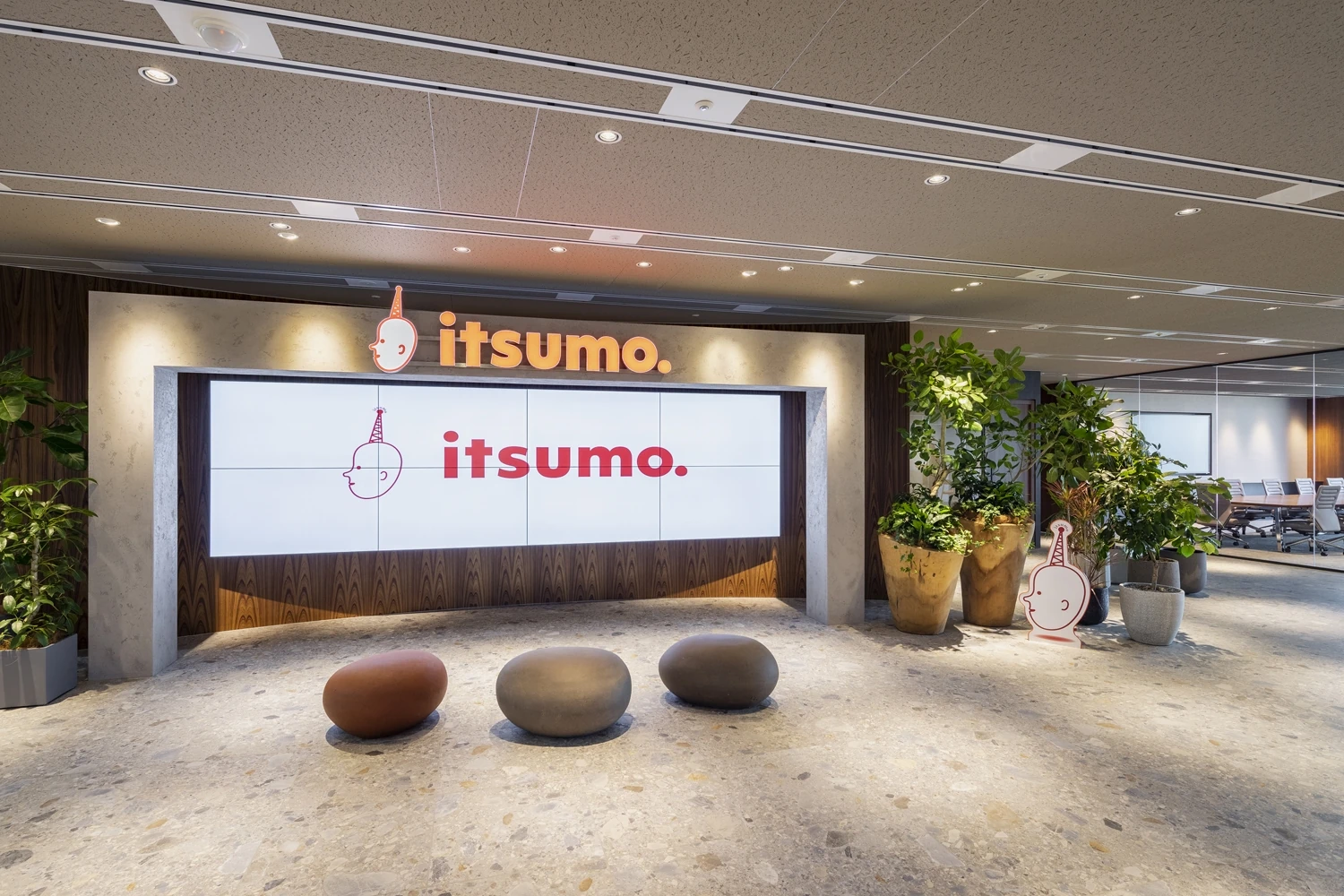 エントランスにロゴを大きくデザインした象徴的なゲートを計画し、来訪者にワクワク感とインパクトを与えられる演出をしています。セミナーやイベントの頻度が多いいつも様に見合うようなマルチパーパススペースも構築しました。エントランスのデザインの延長線上で計画し、一体感とブランディングを感じさせることができます。床材にはエリアに応じてタイルやパーケットを使用したり、アースカラーを中心としてファニチャープランを計画するなど、一つひとつのマテリアルやアイテムにもこだわりました。また、日比谷公園と皇居を一望できるビル特性を活かし、間仕切りは必要最低限にして奥への広がりと抜け感を演出できるようゾーニングを行いました。