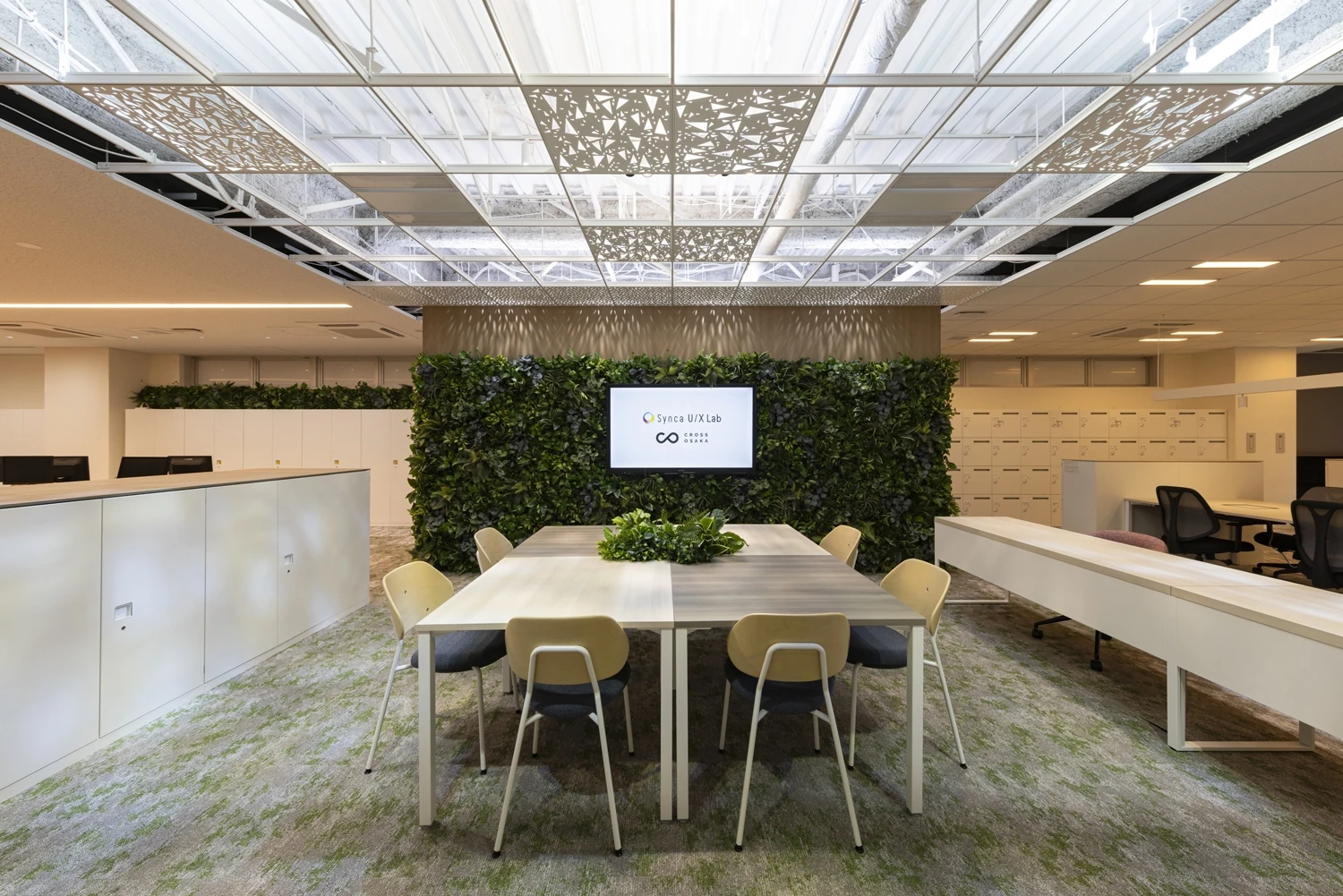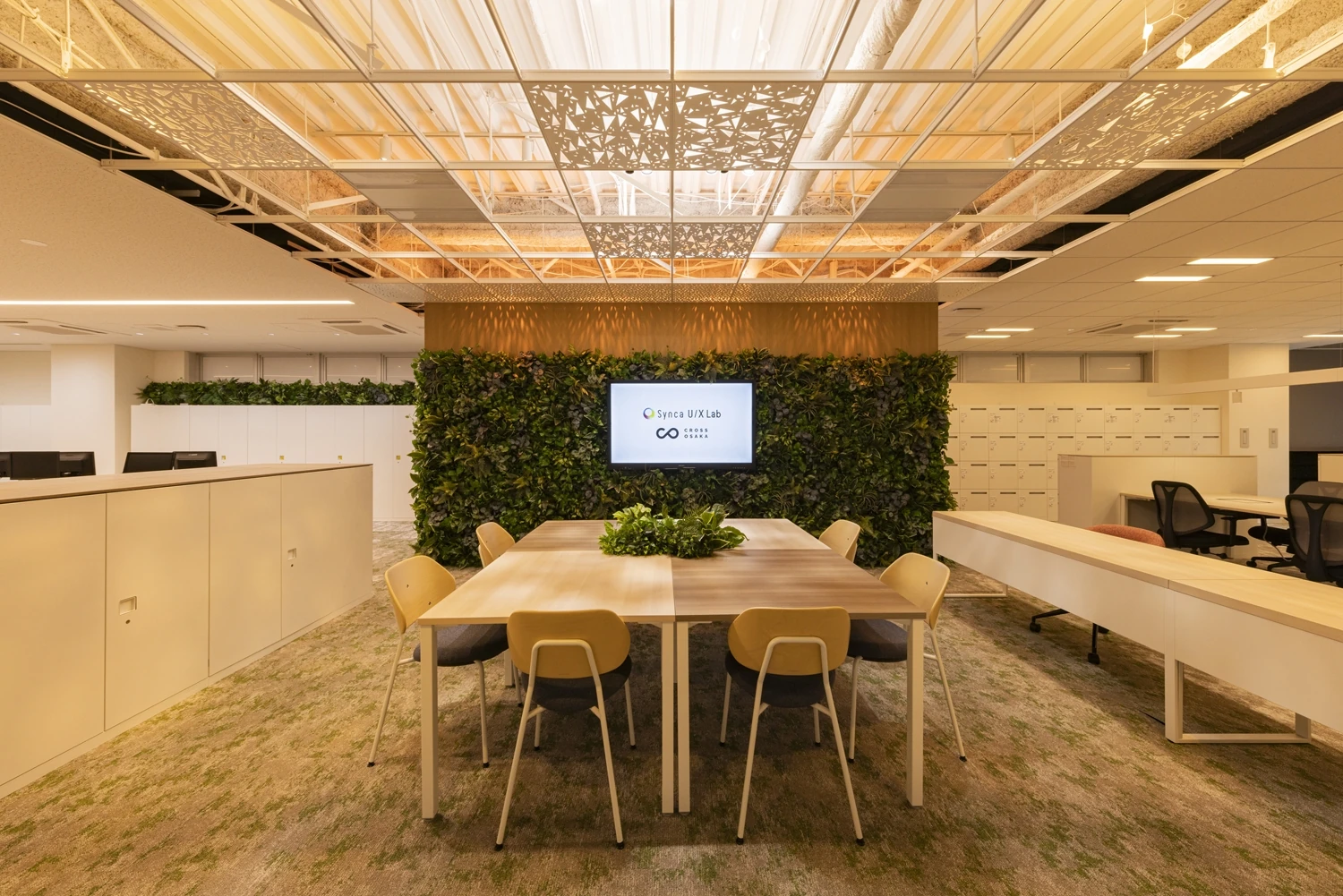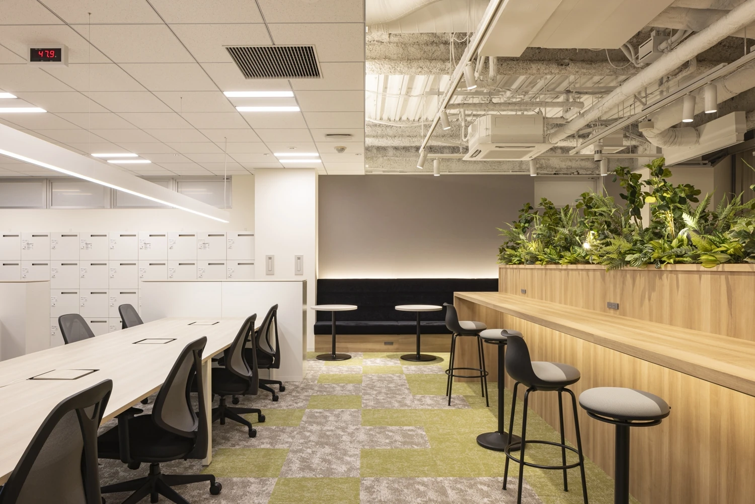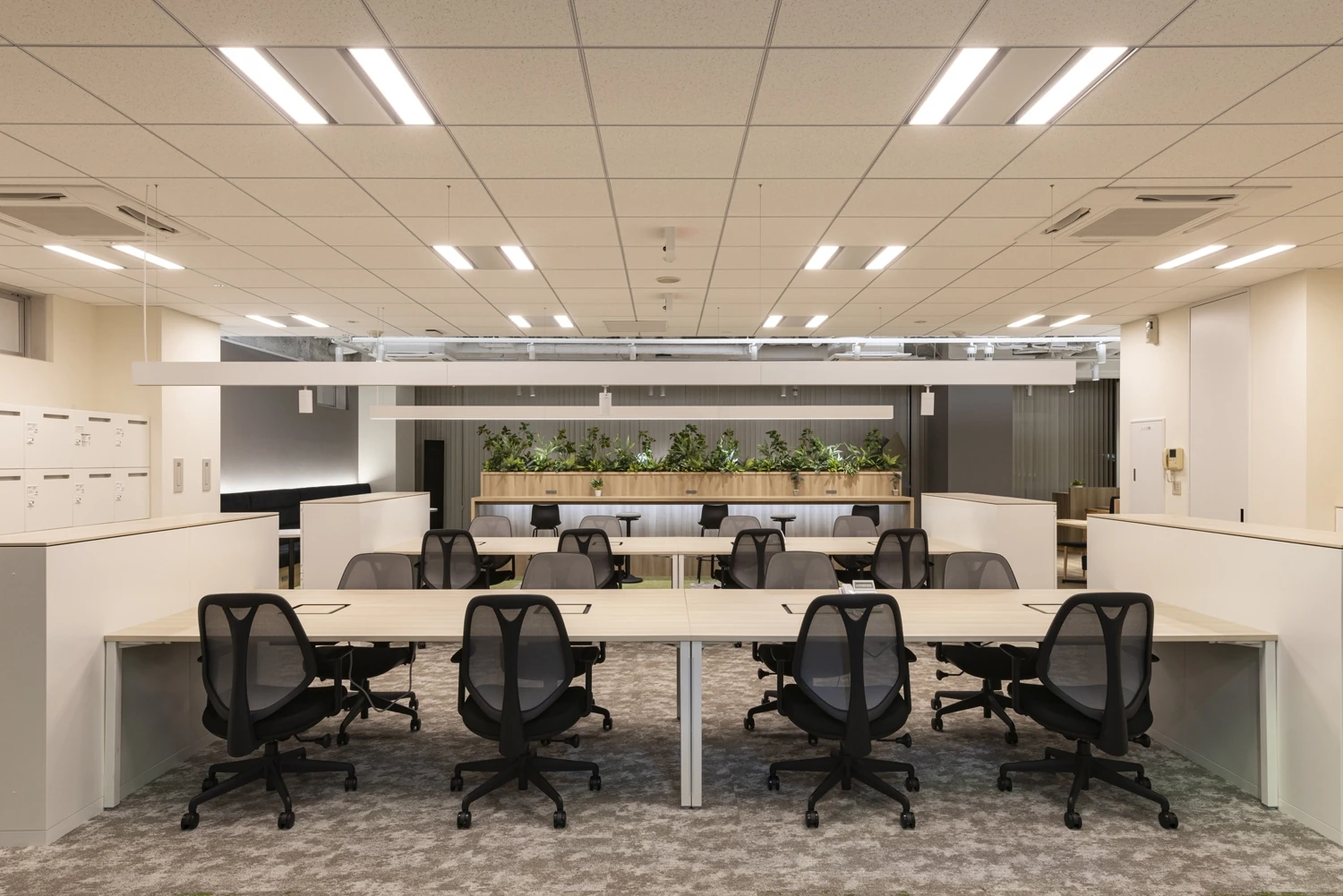 オフィスのテーマとして「X-cross OSAKA」を掲げ、照明とはたらきやすさを融合させ、クロス(コミュニケーション)を生み出す空間を実現しました。1フロア内に在来天井、パネルなしグリッド天井、パネルありグリッド天井、スケルトン天井の4種類の天井を混在させ、ゾーンごとに選択できるワークスタイルを提供しています。さらに、4種類の天井ごとに異なる照明を活用し、照明器具だけでなく、照明のもとで生み出される人の動きや空間を感じられるライブオフィスとなりました。自社商品の照明による空間の変化や心身の感じ方を実感できるライブオフィス空間を手に入れ、遠藤照明様の営業促進にもつながっています。
