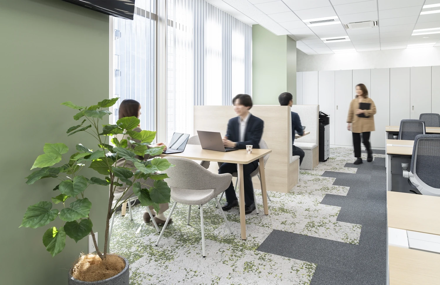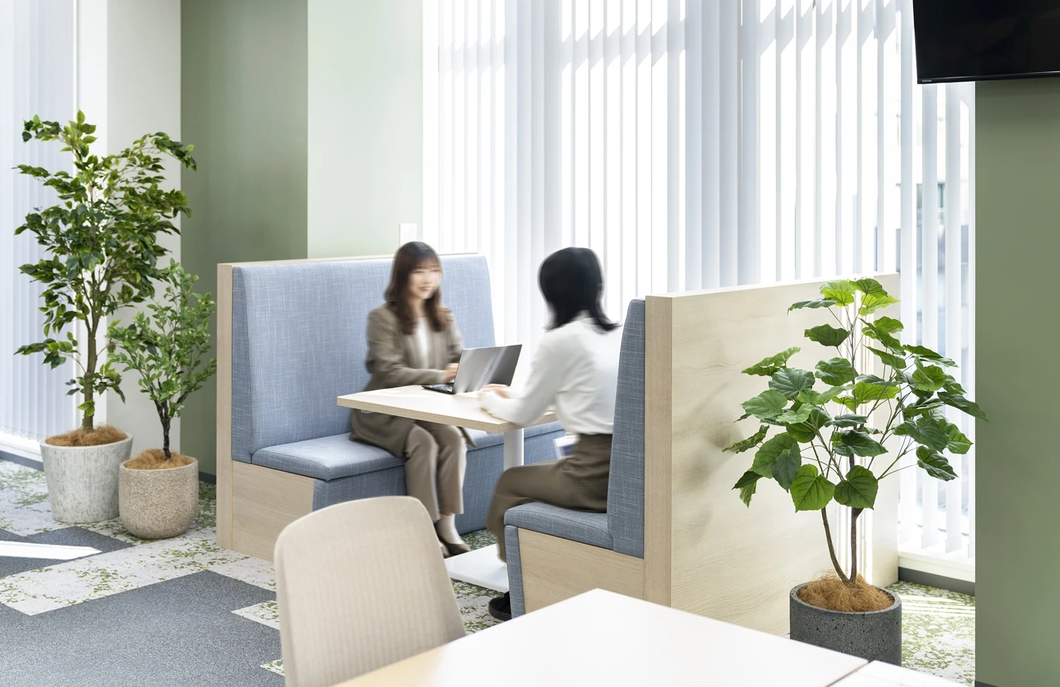 前回に引き続き人員増加に伴う新拠点の開設プロジェクト。他拠点同様、幅広い年代の方がはたらかれるオフィスになるため、コミュニケーションを重視し、執務エリア内のオープンミーティングスペースやファミレスブースの設置をご要望いただきました。 -