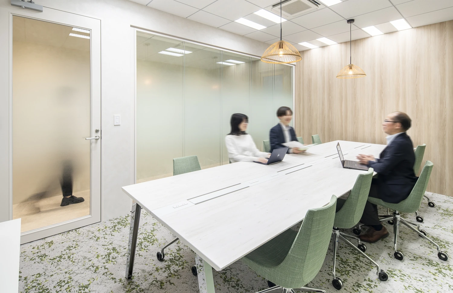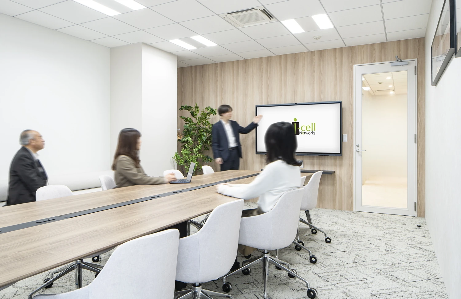 窓からの採光が非常にとれる物件であったため、明るく開放的なオフィスとなるよう木目とアースカラーを中心にインテリアを構成しています。家具は実際にアイセルネットワークス様とショールームに足を運び選定したもので愛着をもって使用いただいています。執務エリアにはオープンミーティングスペース、リフレッシュエリア、集中ブース、ファミレスブースをもれなく完備。コミュニケーション活性化と業務効率、生産性の向上に寄与しています。