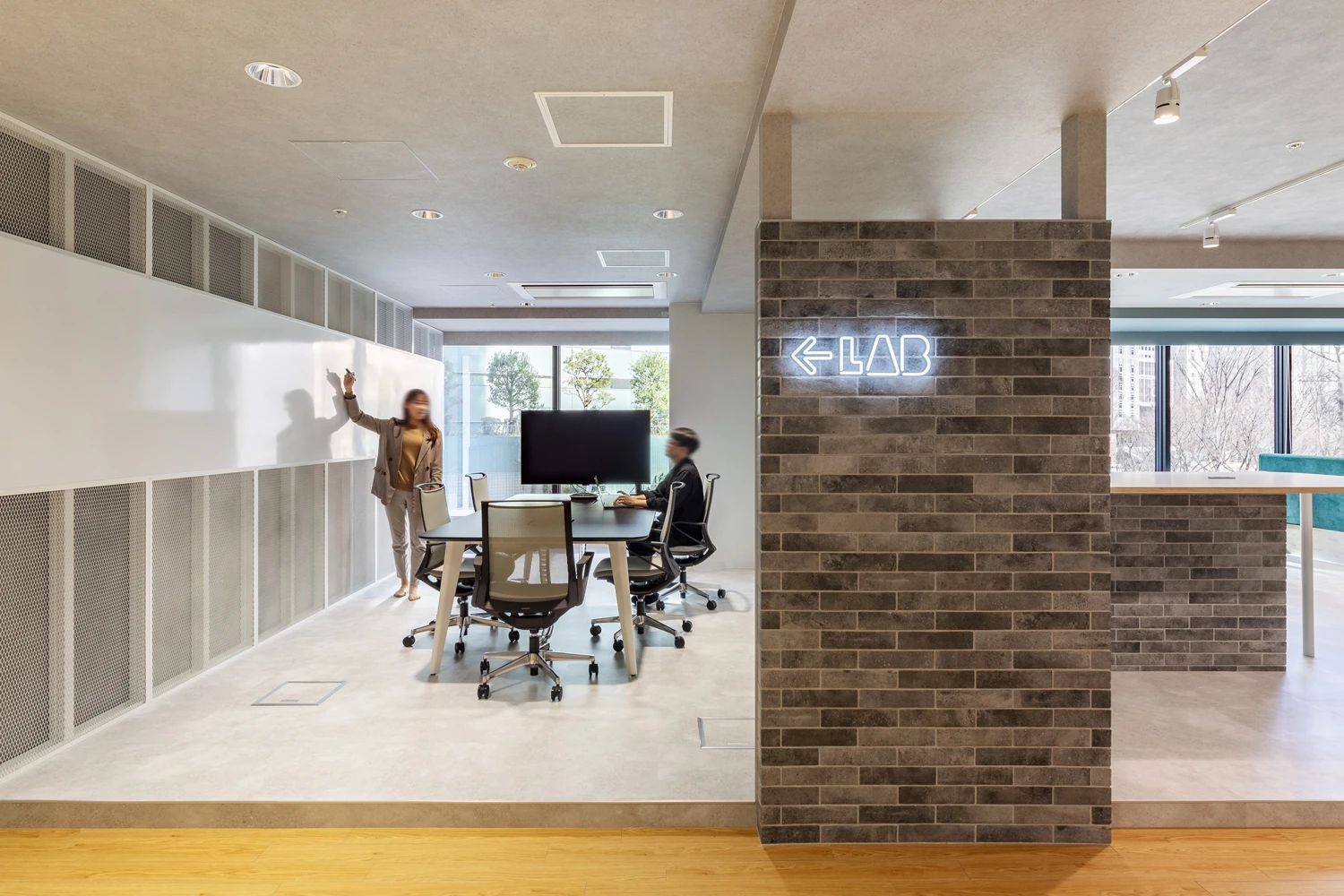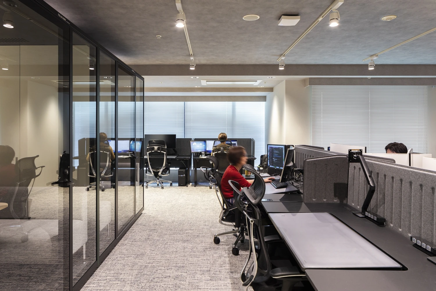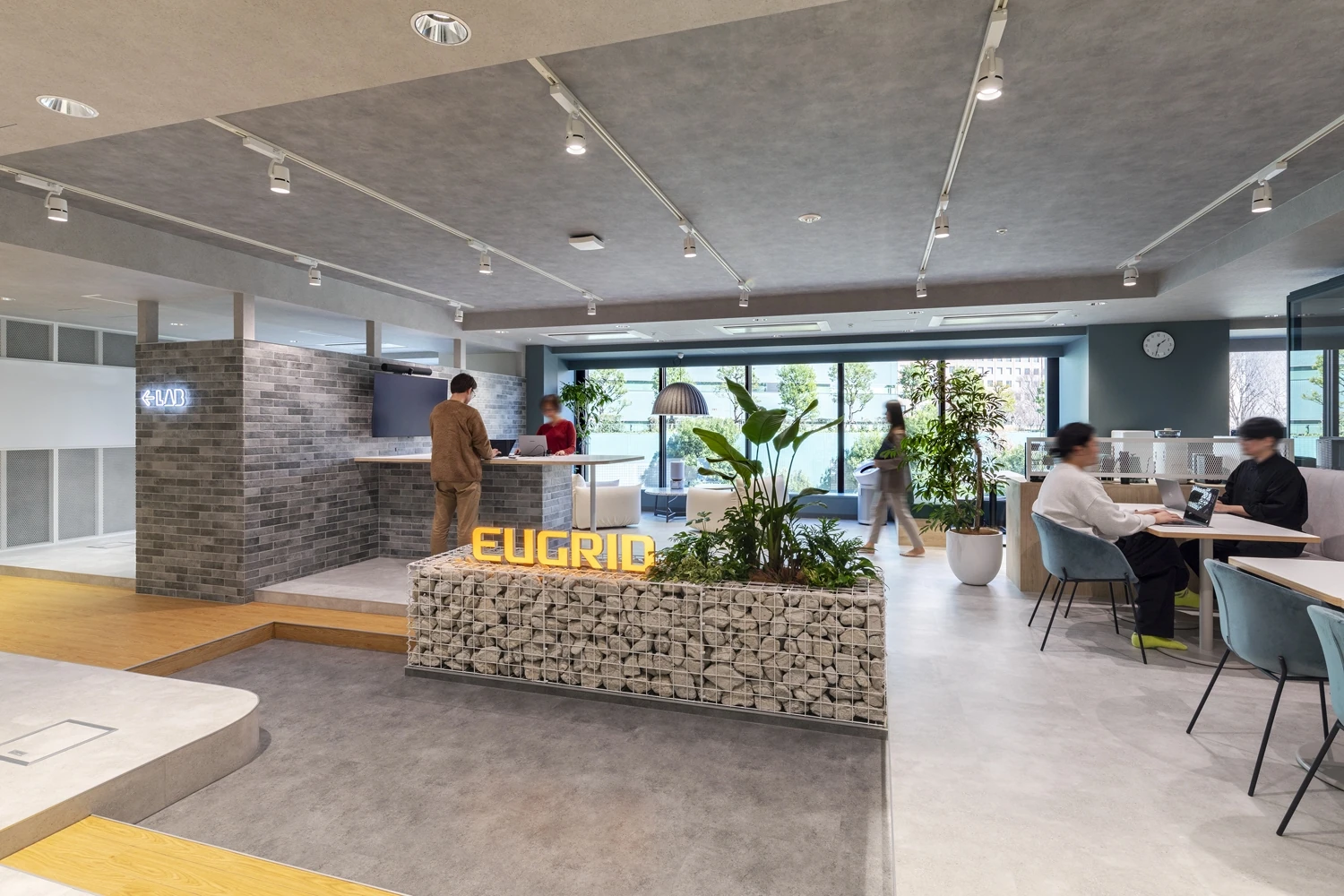 固定席スペースとそれ以外のスペースを適切に分け、ON/OFFの切り替えをしやすくしています。オフィス全体を壁ではなく高低差をつけた家具を中心に柔らかく区切り、空間全体をひとつながりにしました。デザインは、企業名になぞらえグリッドを意識した直線的なデザインでフレームを作り、植栽や光を交えて柔らかい印象を与えています。リモートワーク中心だったチームがプロジェクト後は自然に出社率が増加し、コミュニケーションが活発になりました。