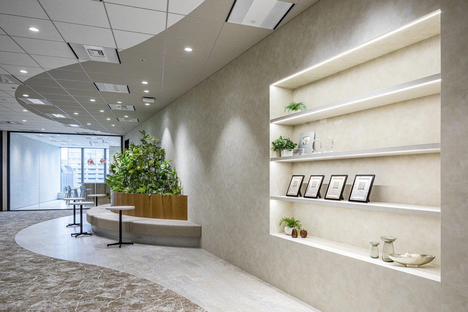 コンセプトは『NEW SALONE』。オフィスに来る→新しい出会いが生まれる→コミュニケーションの活性化につながると考え、社員はもちろんのこと、外部の来訪者に対しても、オフィス体験を高め来社を促すデザインと仕組みを取り入れました。全体的なデザインは、社内メンバーや来訪者は女性が多いことから、柔らかく温かみのある丸みをベースにしています。レイアウトは余白をあえてもたせ、ECサイト業務で必要な撮影スペースや将来的な増員のためのスペースとなっています。