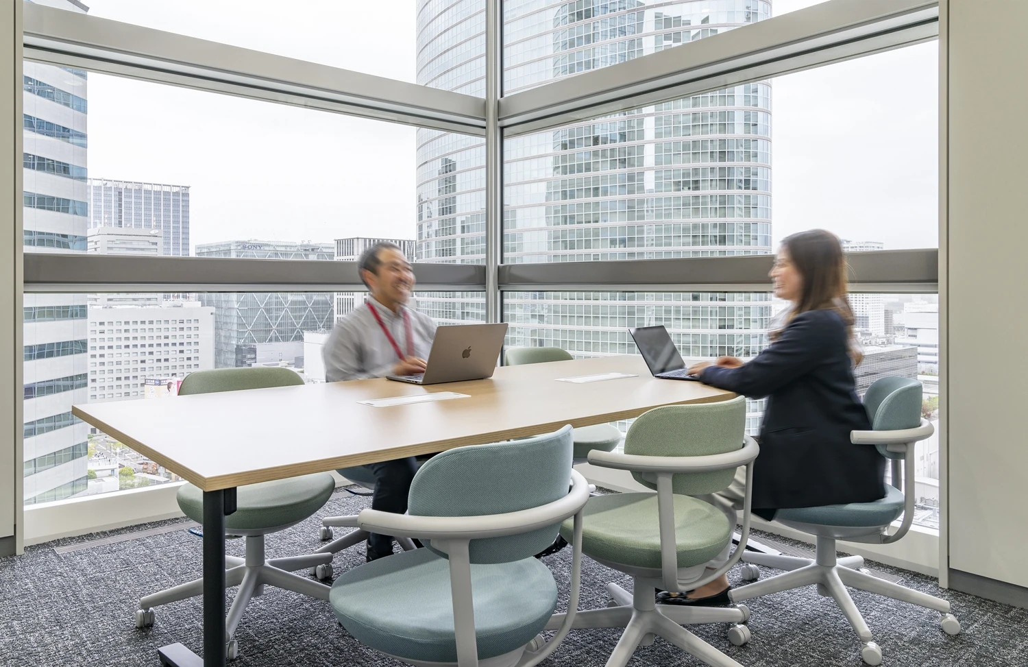 フリーアドレスの導入により、社員一人ひとりが最適な場所ではたらける環境を提供。中央の「スマイルライン」を軸に、コミュニケーションと集中のバランスを取りながら、自然な動線を生み出しました。デザイン面では、透明感のあるガラス張りの正面と、リフレッシュエリアに配置された緑が、明るく開放的な空間を演出。什器の色彩も工夫し、内装と調和しながら多様な色を取り入れることで、視覚的にも活気あふれるオフィスを実現しました。
