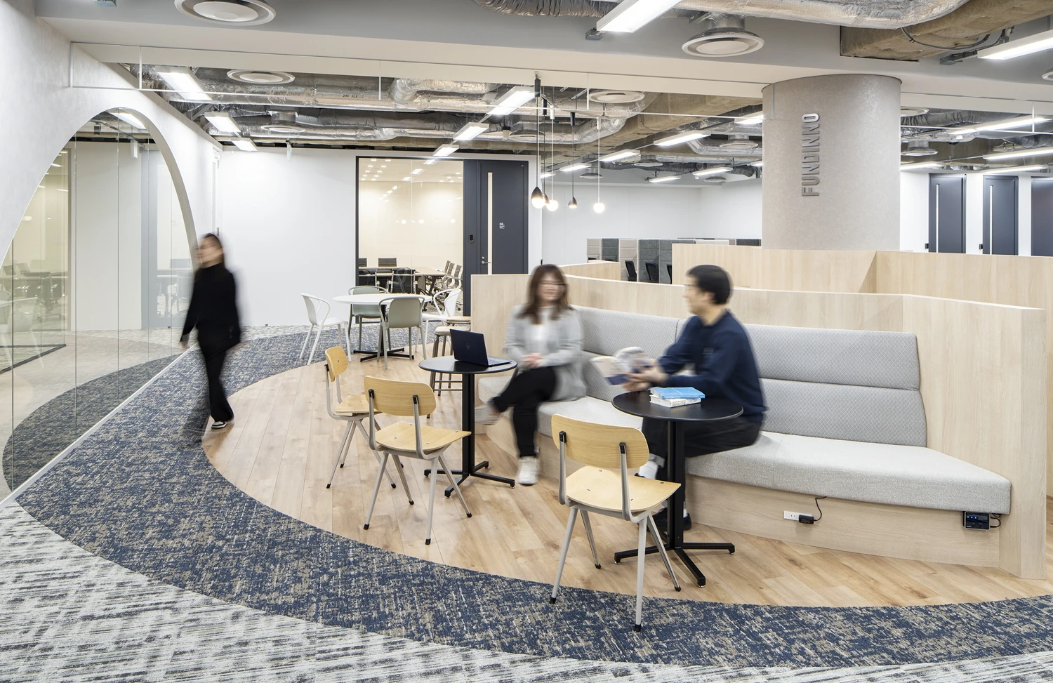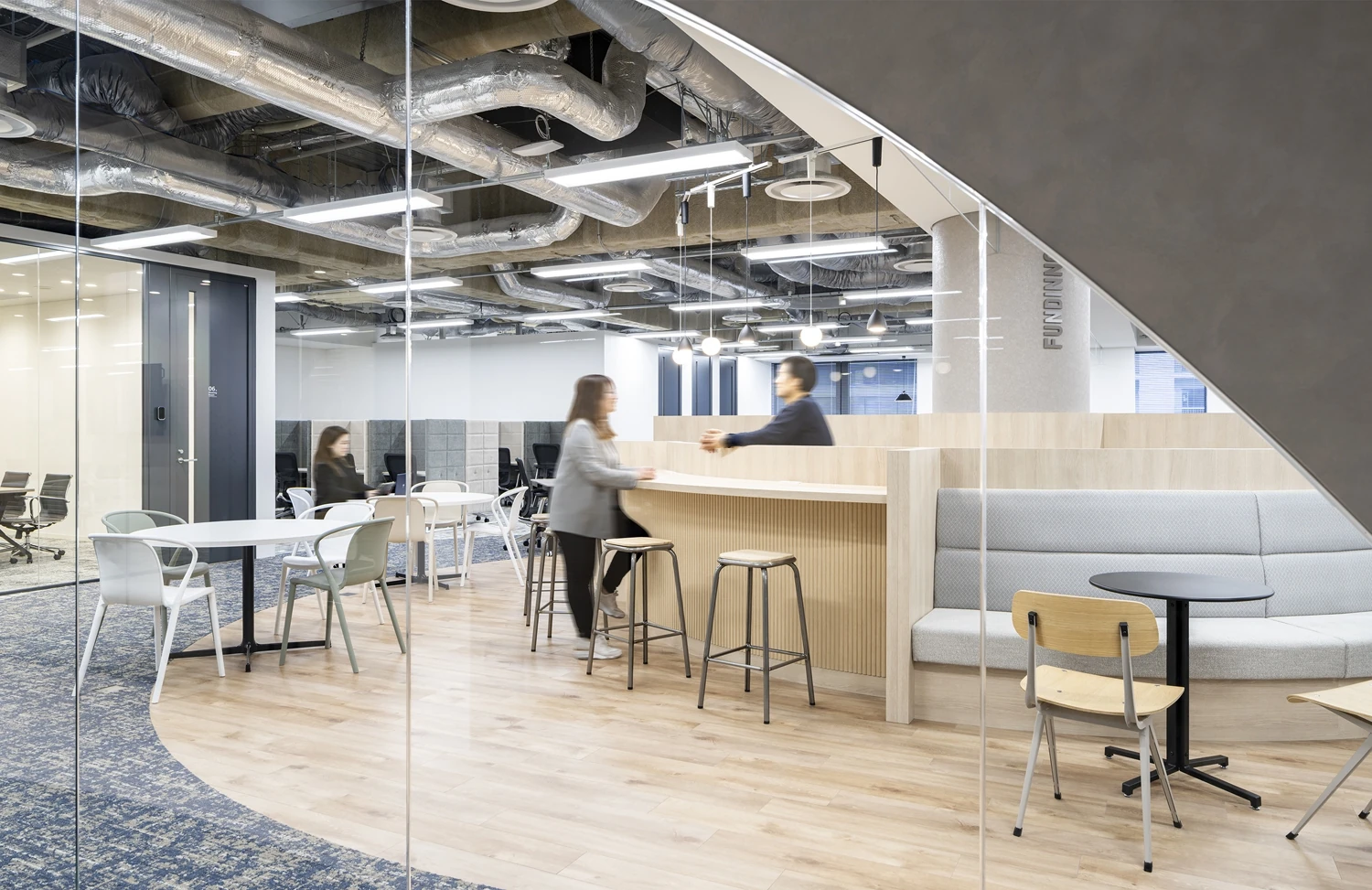 企業と投資家、社員同士、さまざまな人の架け橋となるようなオフィスを目指し、デザインコンセプトは『ARCH』とし、エントランスや執務エリアと繋がる通路にアーチ状のデザインを取り入れています。業務をする場としてのオフィスではなく、自然と集まりたくなるオフィスを目指し、執務エリアの中心にアーチ状のカフェスペースを設置。業務時以外のコミュニケーションの場としても活用されています。ワークスタイルは引き続きテレワークも交えたハイブリッドワークを採用。今後も増えていく多種多様なはたらき方に合わせ、オフィスやファシリティ設備もアップデートができるような余白をもたせています。