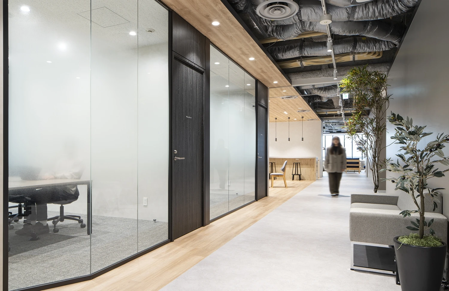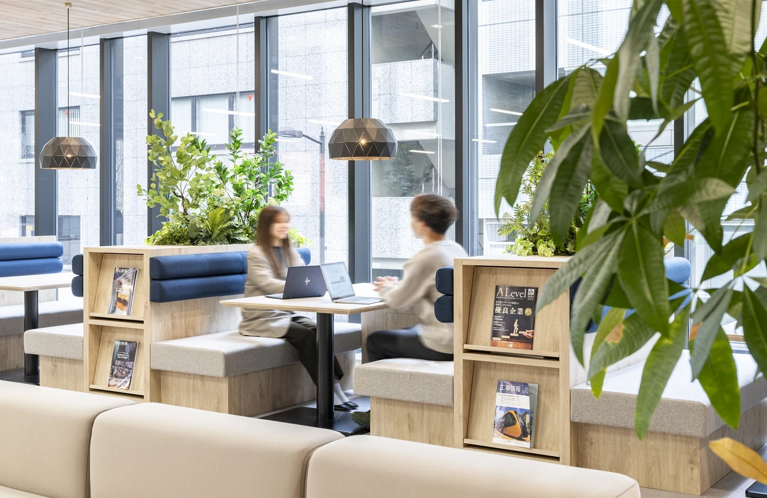 『結ぶ』というコンセプトのもと、採用候補者がオフィスの雰囲気とそこではたらく人の姿を一望できるような回遊動線を設計。また、コミュニケーションスペースを増やすことで、社員同士、さらには社外の人々との結びつきを強化しました。中央に配置されたリフレッシュスペースは、社員がリラックスして交流できる場となり、固定席を主としながらも、ABW(Activity Based Working)を取り入れることができる家具を導入し、将来のはたらき方への適応を模索しています。デザイン面では、クライアントであるエール様の建築技術サポートという専門性を反映し、インダストリアルな要素を取り入れつつも、洗練されたラインで上品さを表現することに注力しました。