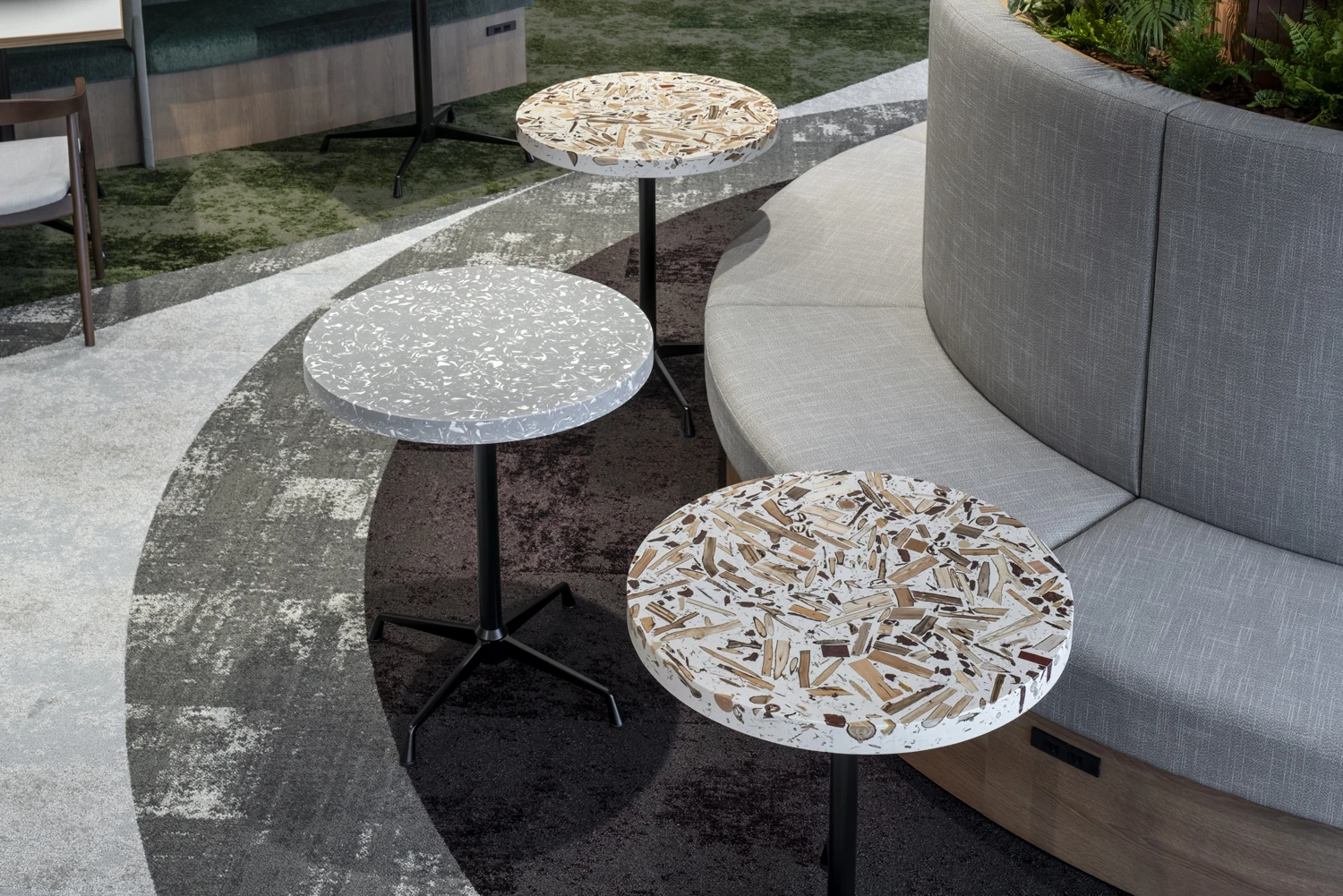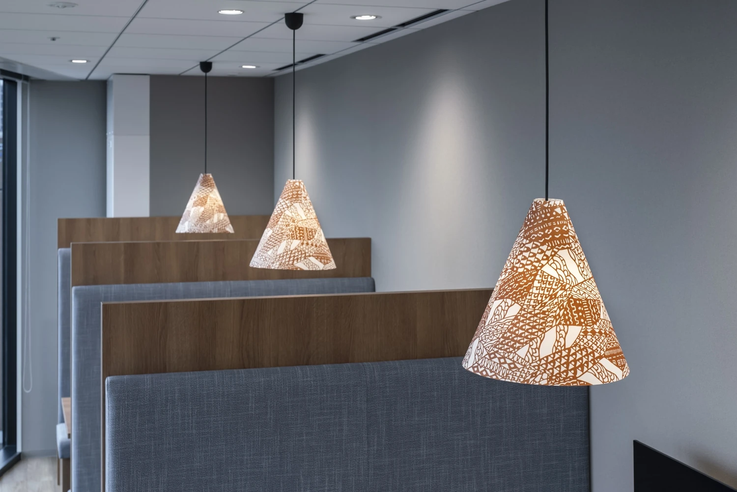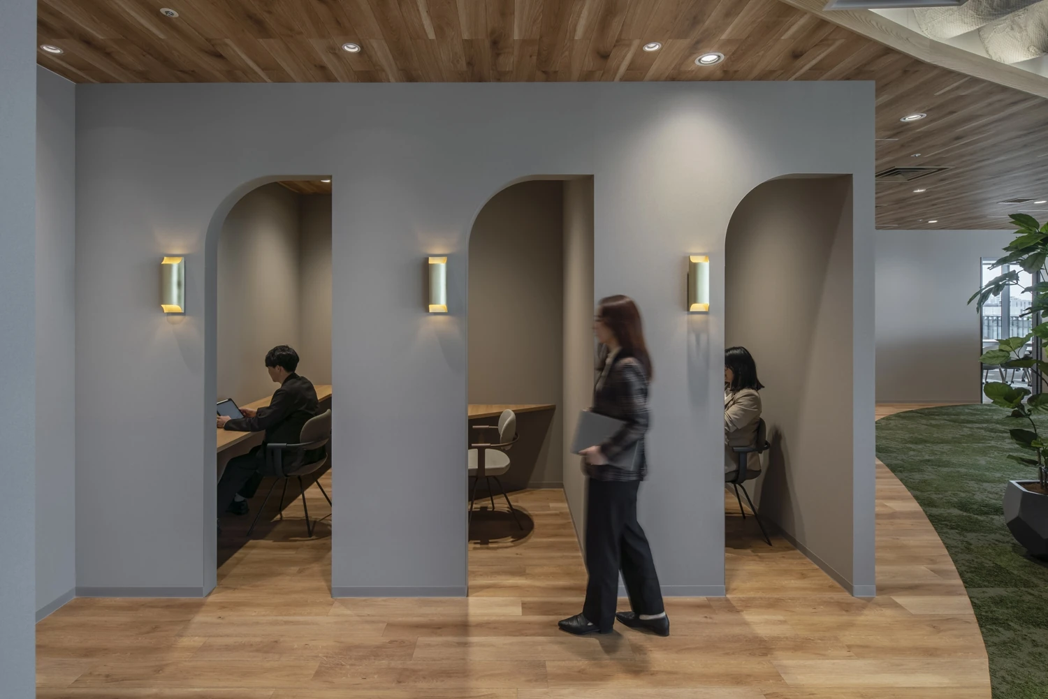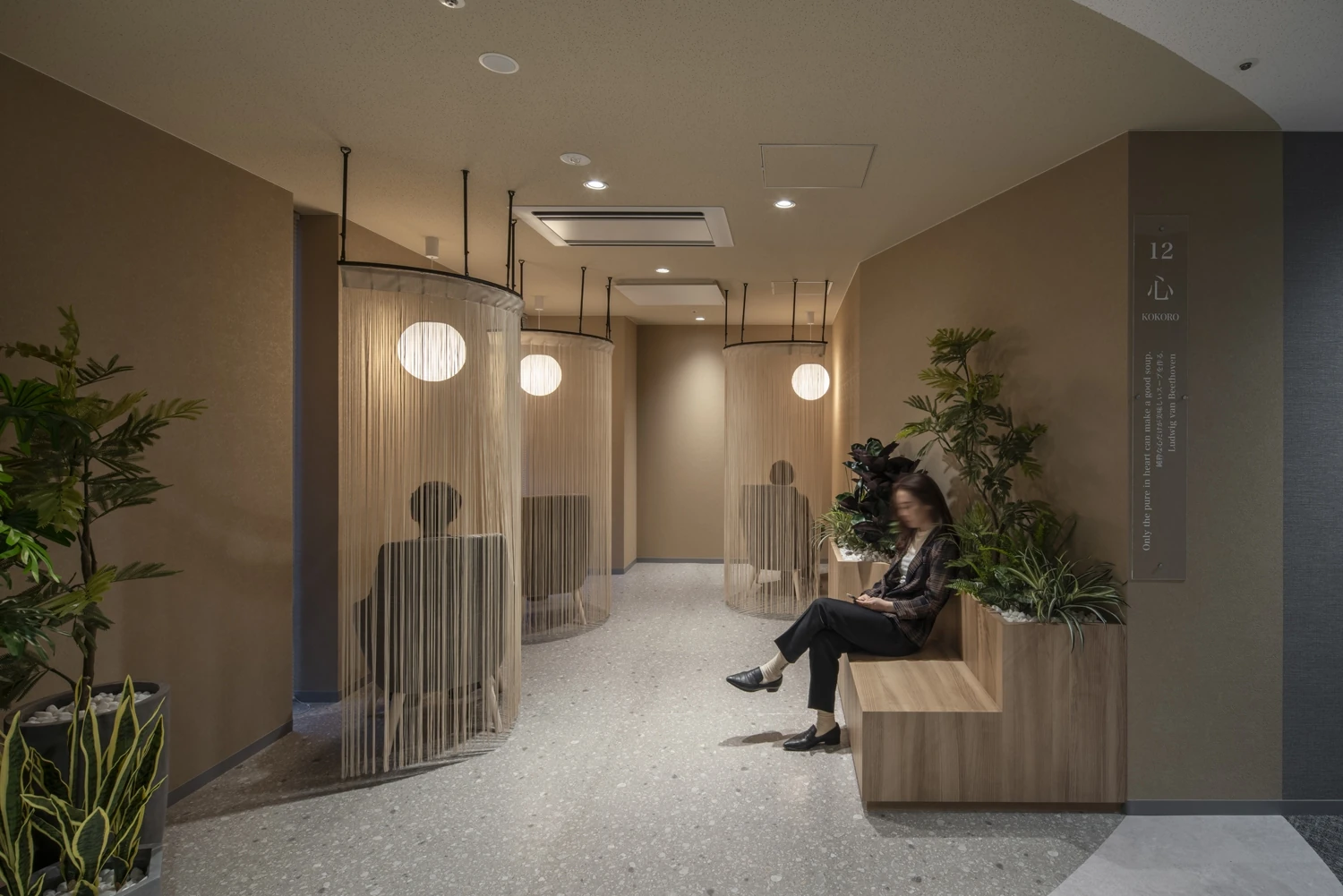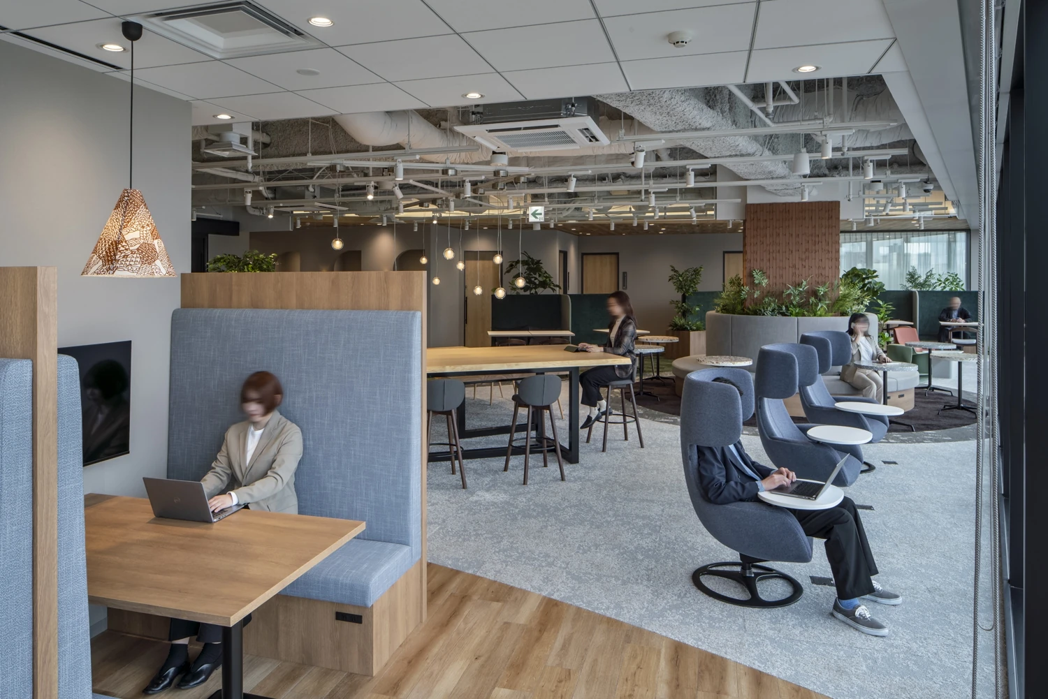 植栽を随所に設けることで、緑視率を高めると同時に、空間にほどよい仕切りをもたらしています。また、三重県産材を使用したForestBank®テーブルや伊勢型紙のランプシェード、伊勢木綿を使用した衝立など、三交不動産様の地元素材を活かしたデザインが特徴です。