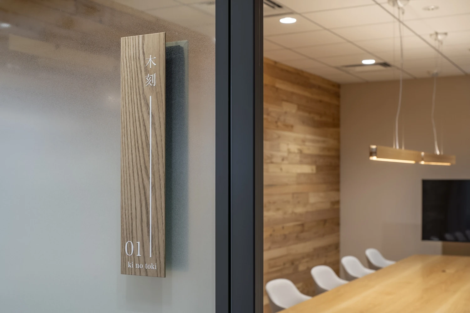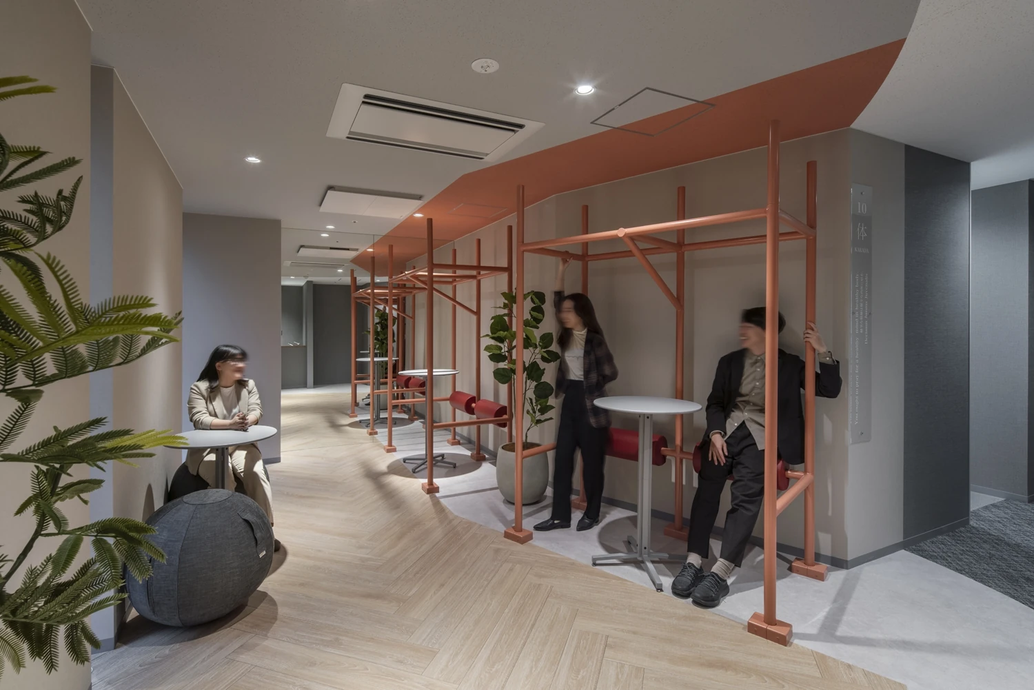 2階から14階にわたり、共有部に仕事の合間にリフレッシュできるスペースを設け、10階には会議前後の場面やソロワークに適したラウンジを配置しました。10階に配置した貸会議室は、それぞれ自然を感じさせる「土」「木」「水」「石」のテーマでデザインされ、各フロアのリフレッシュスペースは「頭」「心」「体」をリフレッシュするコンセプトで構築されています。