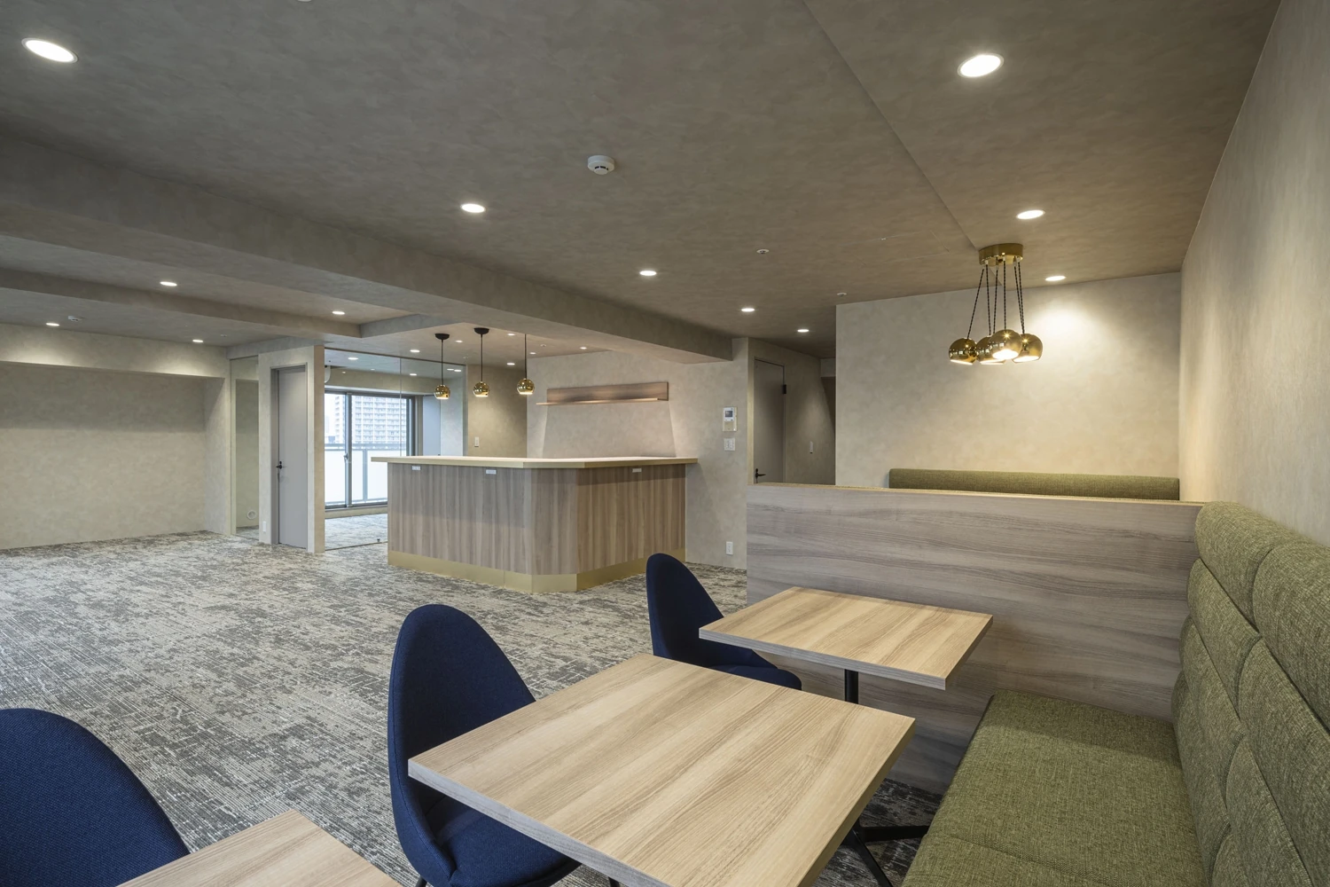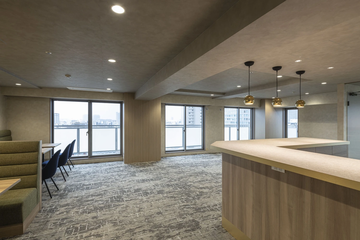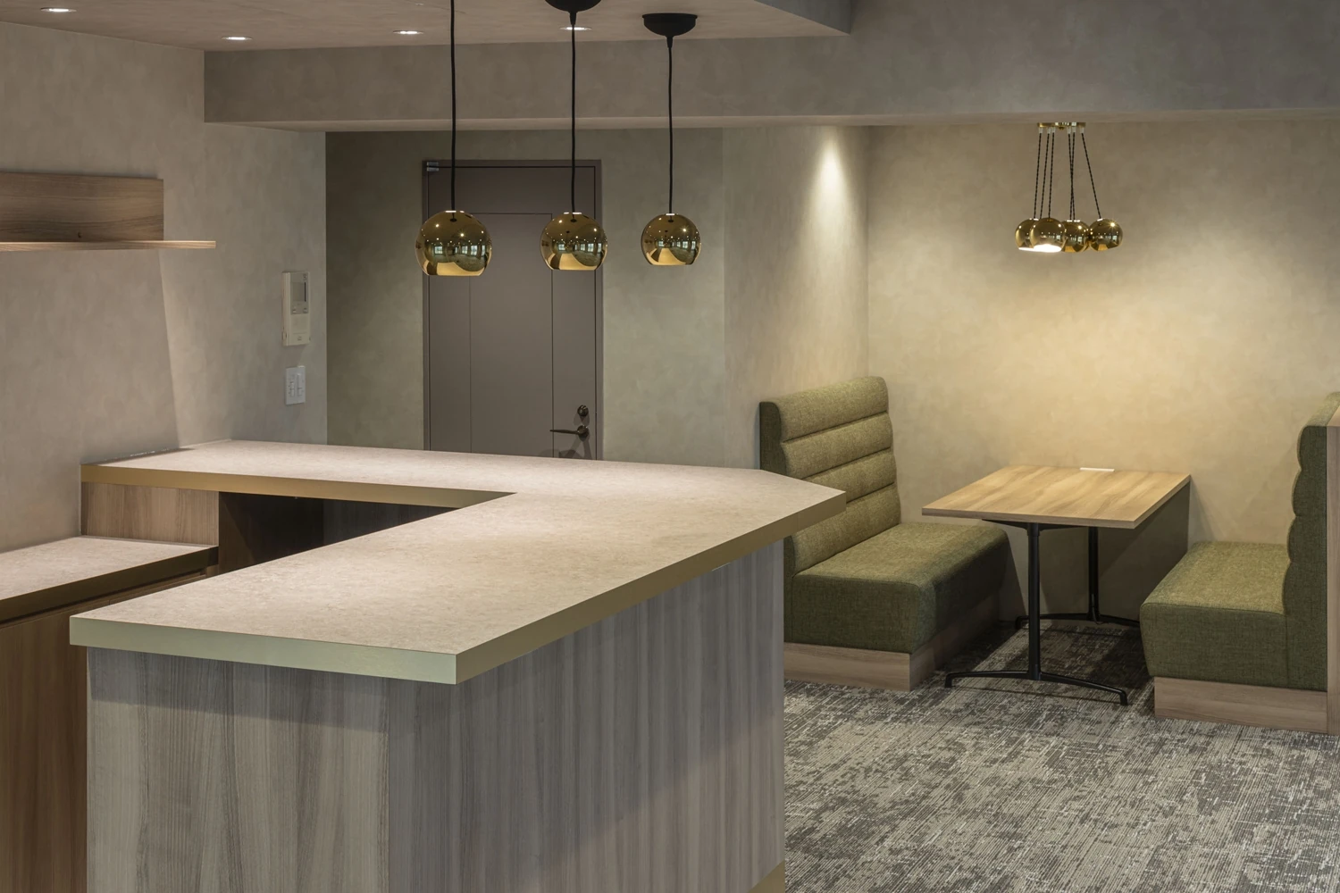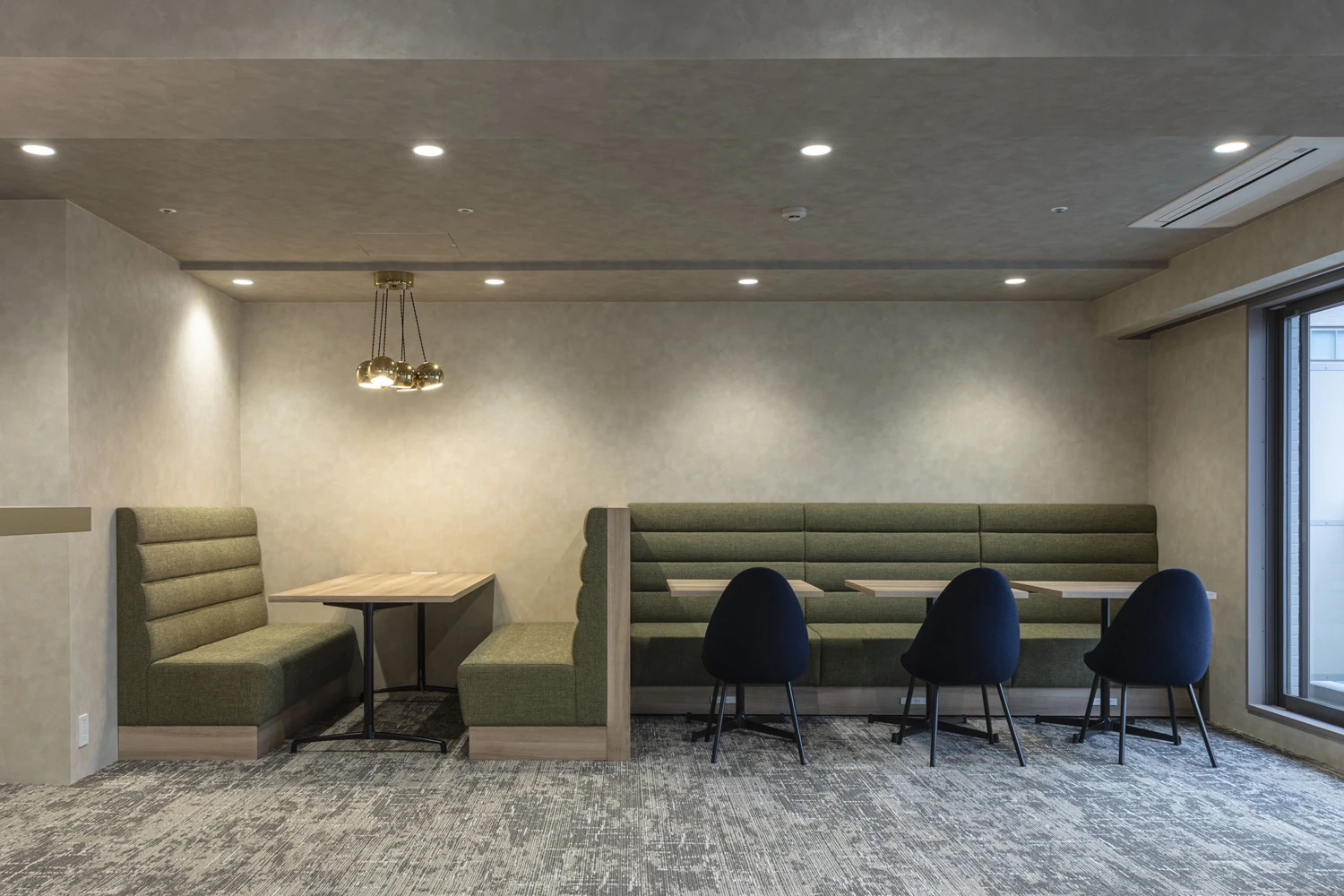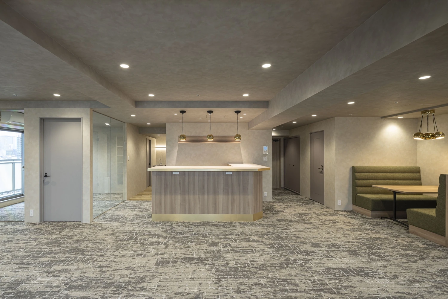 「Secret Base」をコンセプトに据えた本プロジェクト。従来のオフィスフロアとは異なるアプローチもプラスに捉え、ラグジュアリーかつ「大人の隠れ家」の雰囲気を創出しました。専有部では、窓外への視線が抜ける配置と、空間を広く見せるガラス会議室を採用。共用部では、落ち着いた色合いの壁や床、間接照明を施したEVホールで、ホテルのような落ち着きある空間を演出しました。また、会議室やWEBブースなどの打ち合わせスペースに加え、カフェカウンターやファミレスブース、ベンチソファーなどを設けることで、内覧時にお客様がワクワクしながらはたらくイメージを持てるような空間を実現しています。