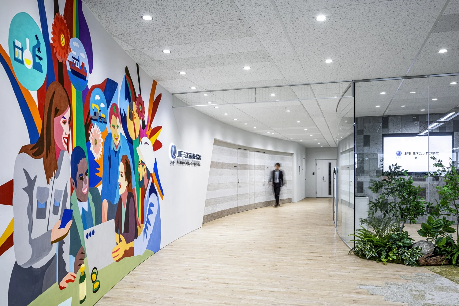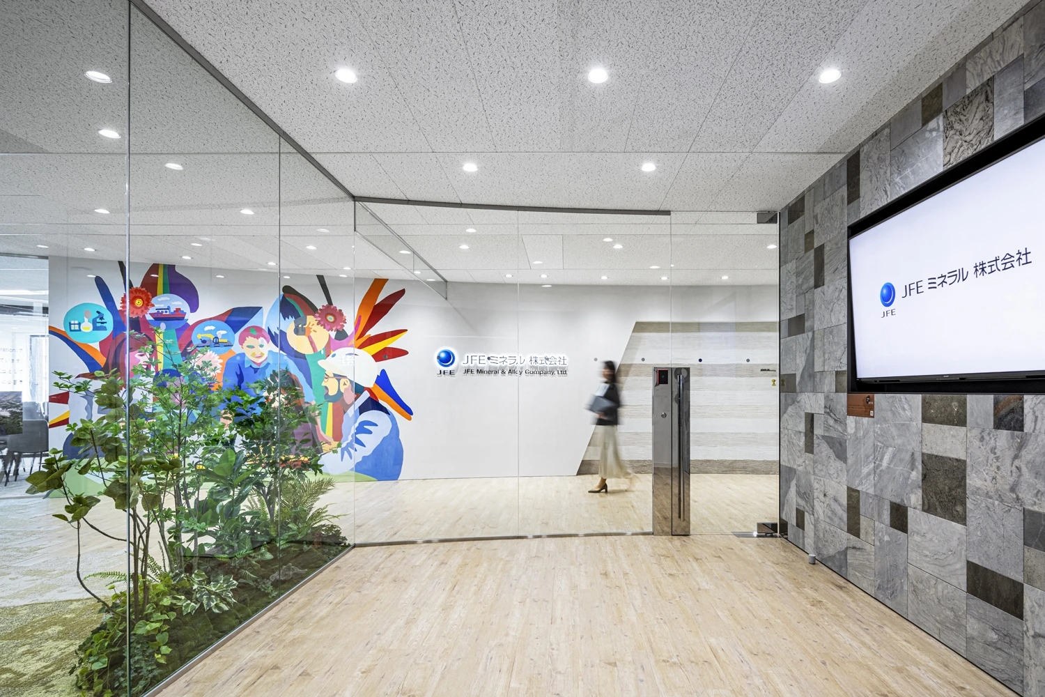 マテリアルは、JFEミネラルの事業やブランディングを表現するために、塗り版築で地層を表現したり、鉱産品・原料製品を使用。エントランスにはビジョンを表現したアート制作をアーティストに依頼しました。実際の制作には12名以上の社員が参加し、ワークショップのもとJFEミネラルの目指す姿を表現しています。随所に散りばめられた「JFEミネラルらしさ」は訪れる人だけでなく従業員のエクスペリエンスを向上させました。