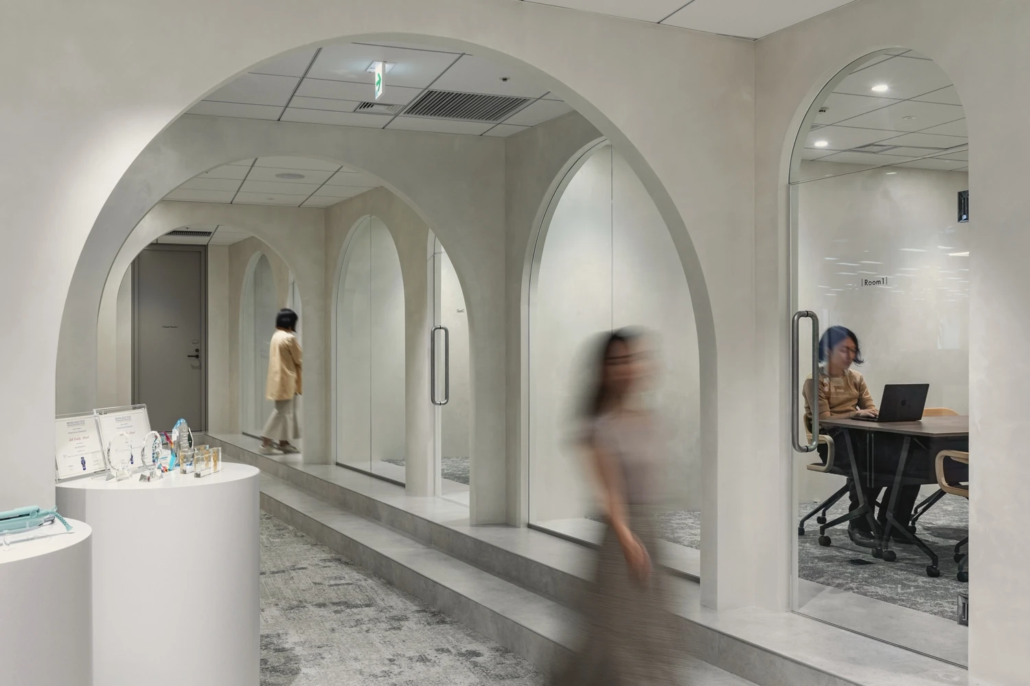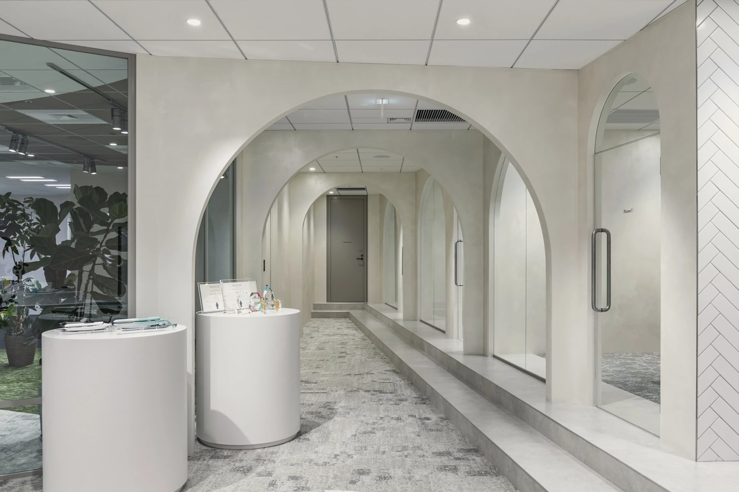 白を基調とした空間の中に、アーチ型の意匠や温かみのある木材を採用することで、