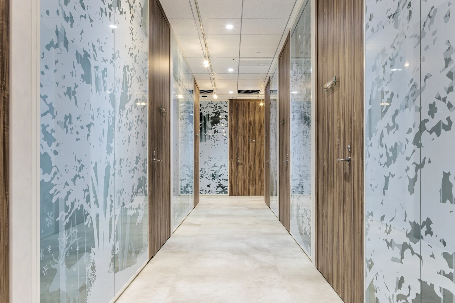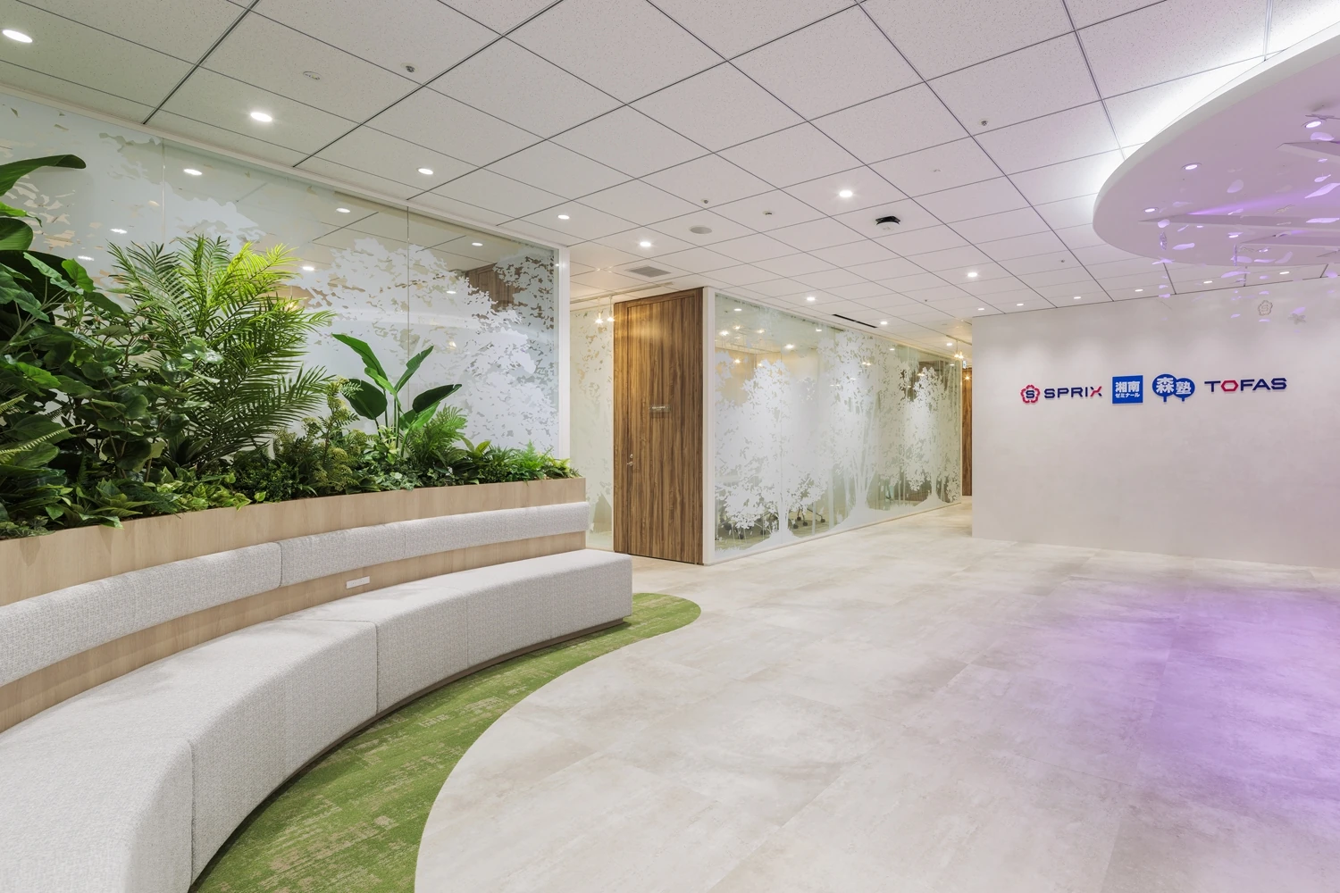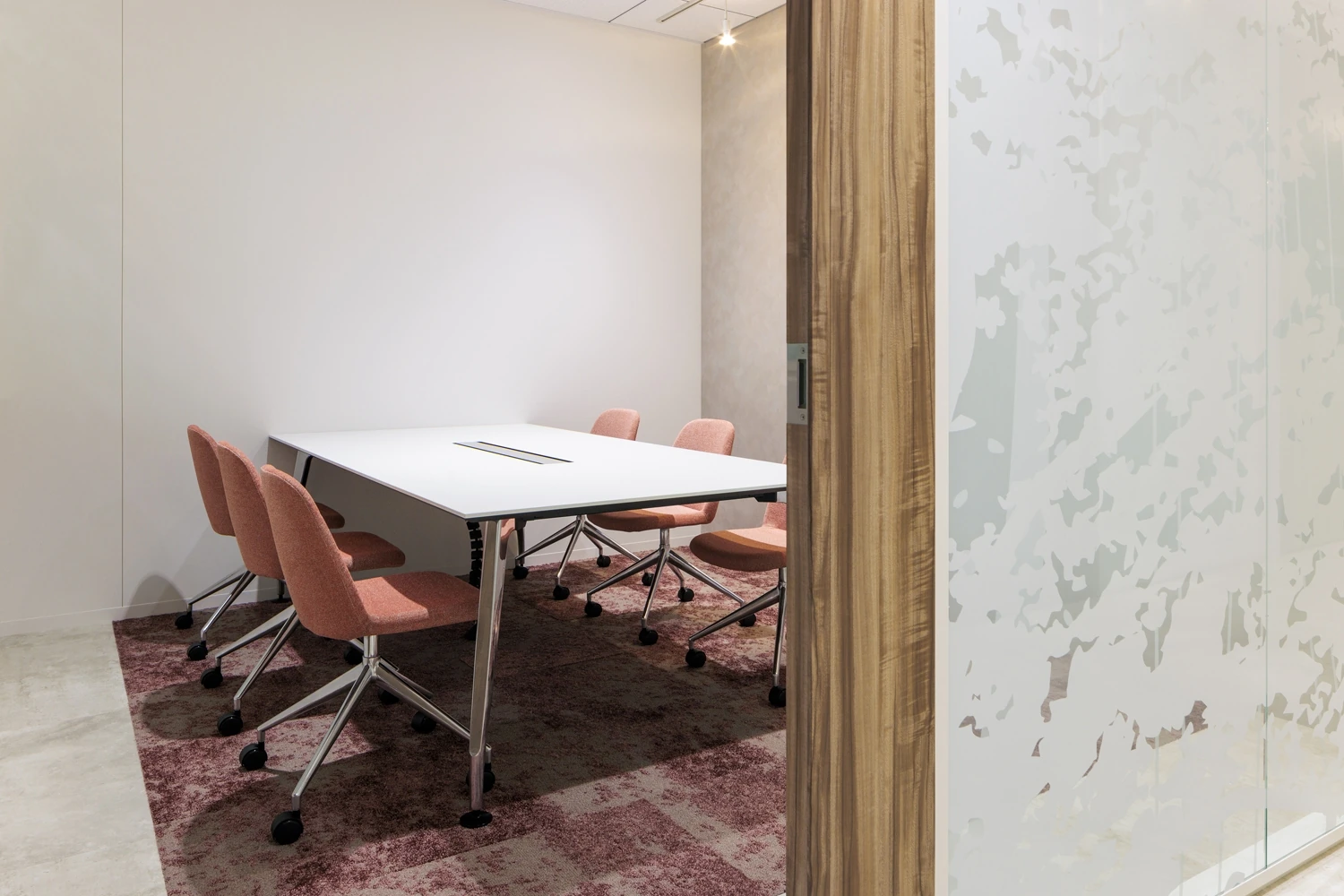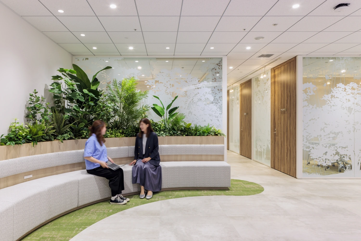 「春を感じるオフィス」をコンセプトに、希望に満ちた春の訪れを表現しています。エントランスには桜のシンボルツリーを造作し、来客や社員が自然と交流できる空間を提供しています。執務エリアにはファミレスブースを導入し、リフレッシュやオープンミーティングが可能な環境を整えました。また、21室ある会議エリアは日本の四季をテーマにマテリアルや家具を選定し、オリジナルグラフィックもデザインしました。