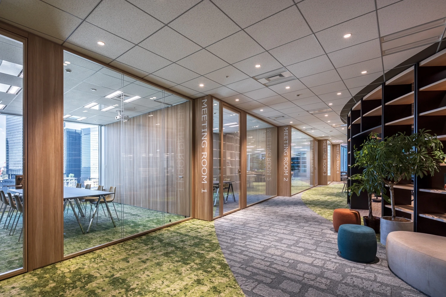 ブランディングの刷新とホールディングス化に伴い、企業としてワンランク上のステージに上がるため、2023年竣工の東京ミッドタウン八重洲というハイグレードビルに移転を決めました。新しいワークプレイスで新しいメンバー、新しい顧客、新しい風に出会い、たくさんのコミュニケーションを生み出すため、人が集うようなオフィスの構築を目指しました。 -