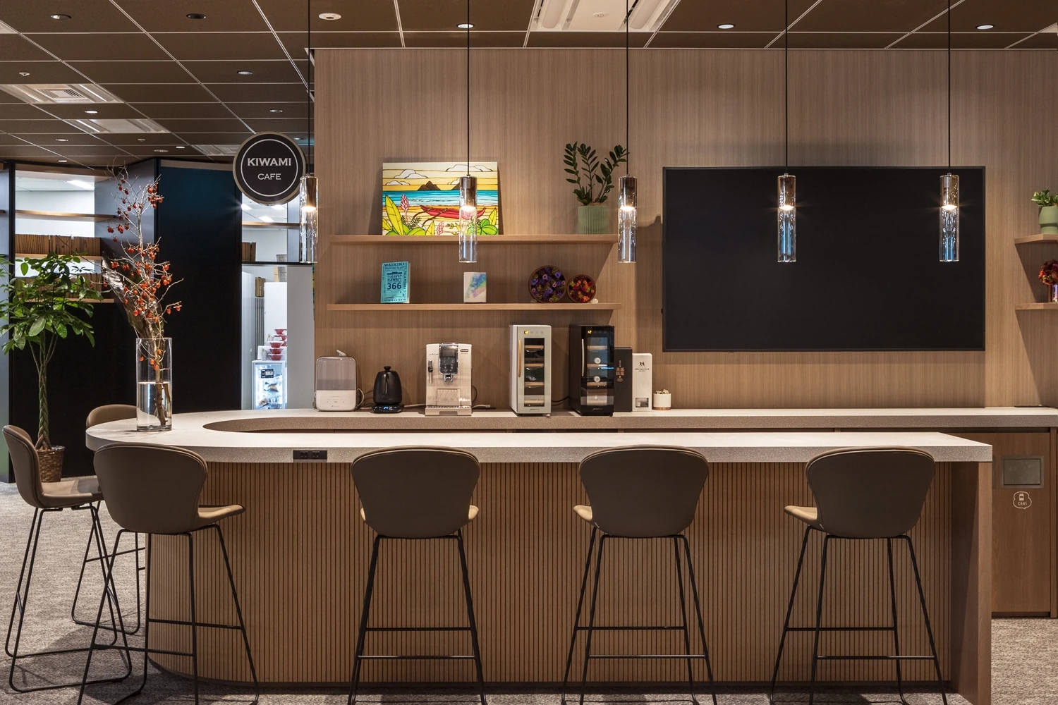 デザインコンセプトは『KIWAMI TERRACE』。区画全体をテラスに見立て、中心に本棚で囲われたライブラリーを設けました。カフェ空間のようなライブラリーは、社内外の人々とのコミュニケーションの場としてさまざまなアクティビティが行われる空間としています。ライブラリーを囲うように、自然の中にある明るいテラスをイメージした執務エリアや来客エリアを配置しました。本棚は視線が抜ける構造にすることで、2つの空間を緩やかに繋ぎ、スムーズな人の流れを生み出しながら、クリエイティブな発想を生む装置として、ディスプレイ・ミーティングスペース・ワークスペースの機能を内包しています。