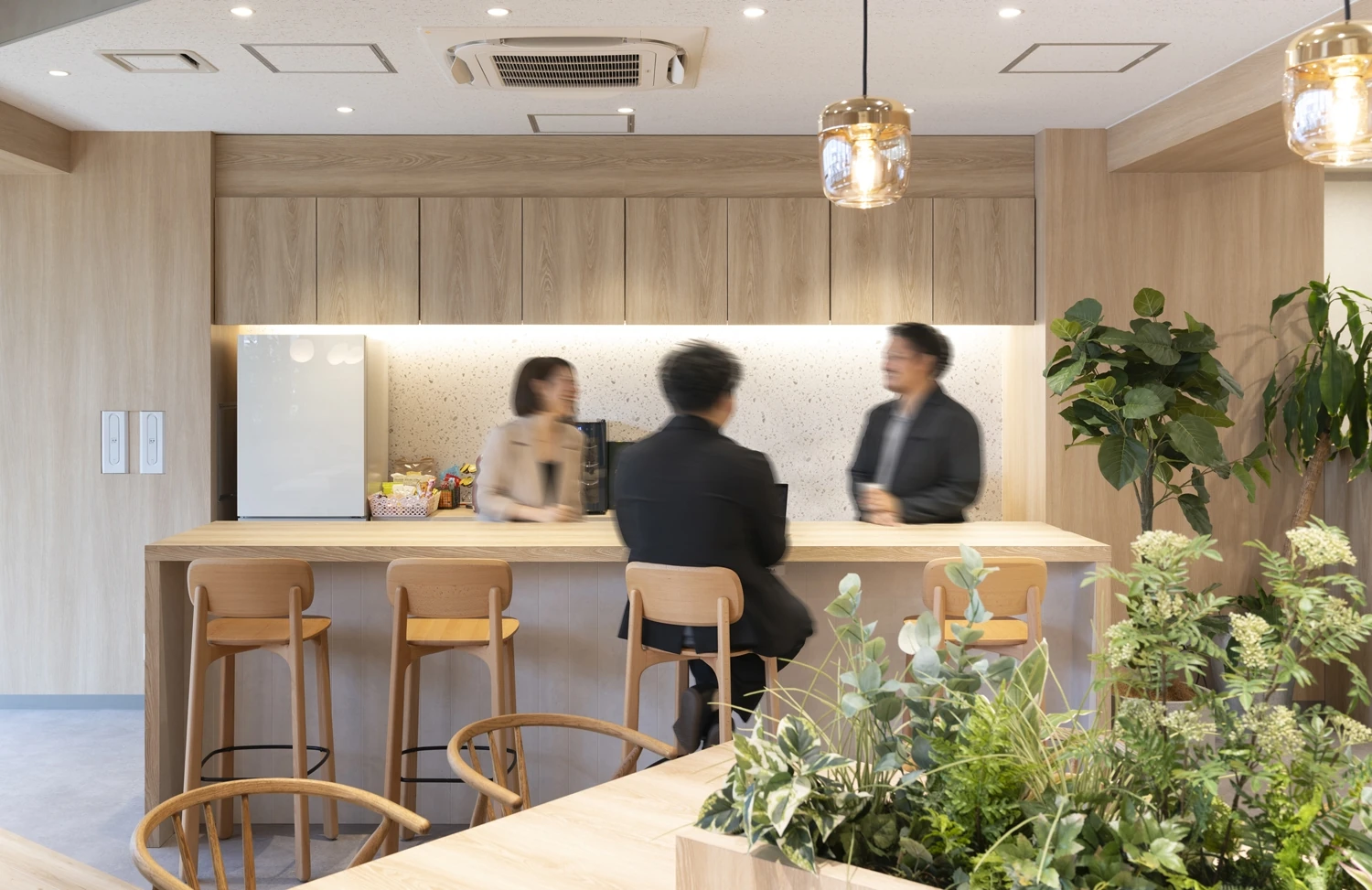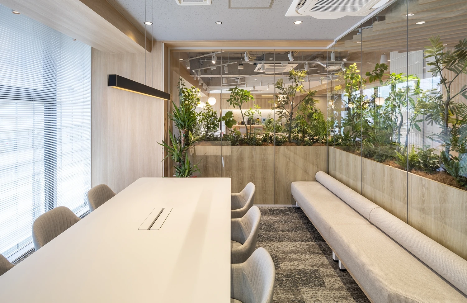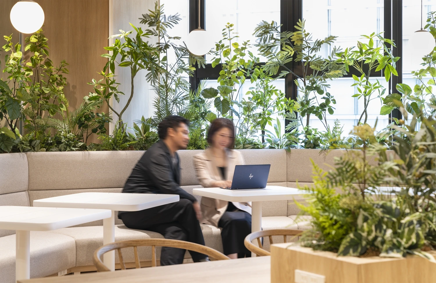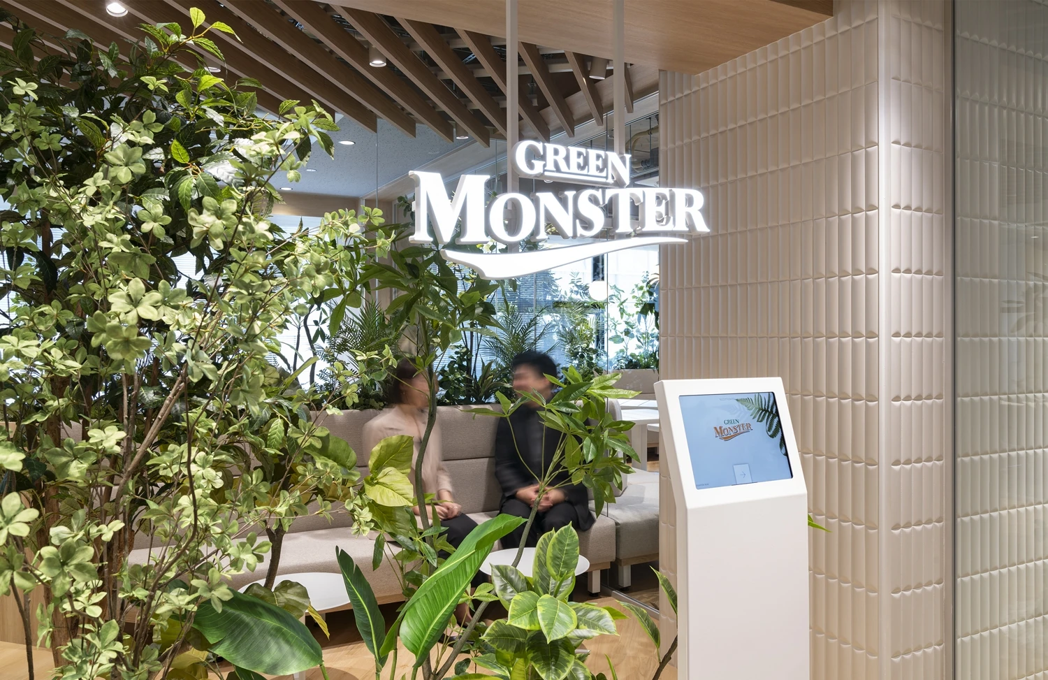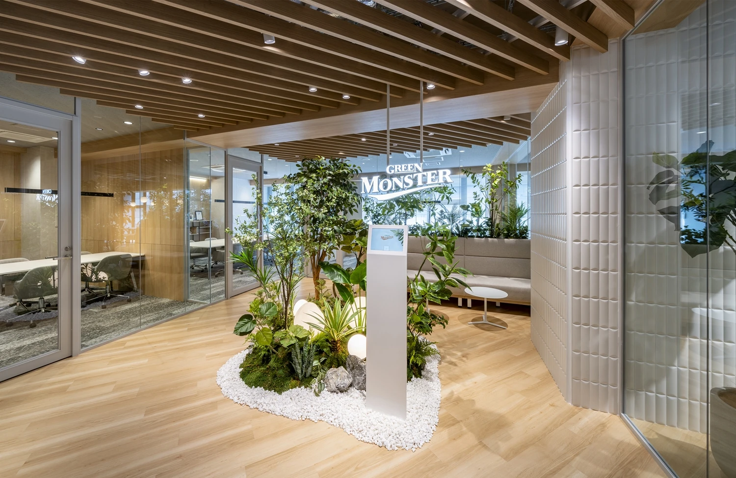 オフィスコンセプトは『ツミタテ』。社員、そして来訪者がこのオフィスを通して自らに投資をしたくなり、そこから生まれる成果がツミタテられ、関わる人とグリーンモンスター様が成長する場となるよう設計しました。ワークスタイルはフリーアドレス運用を採用し、ワークデスク以外にもベンチソファやカウンターなど、業務内容によって働き方をフレキシブルに選択できるようにしました。デザインは、ガラスと植栽、木目をふんだんに取り入れ、解放感と抜け感をもたせ”外”感と生き生きとした温かみを演出しました。