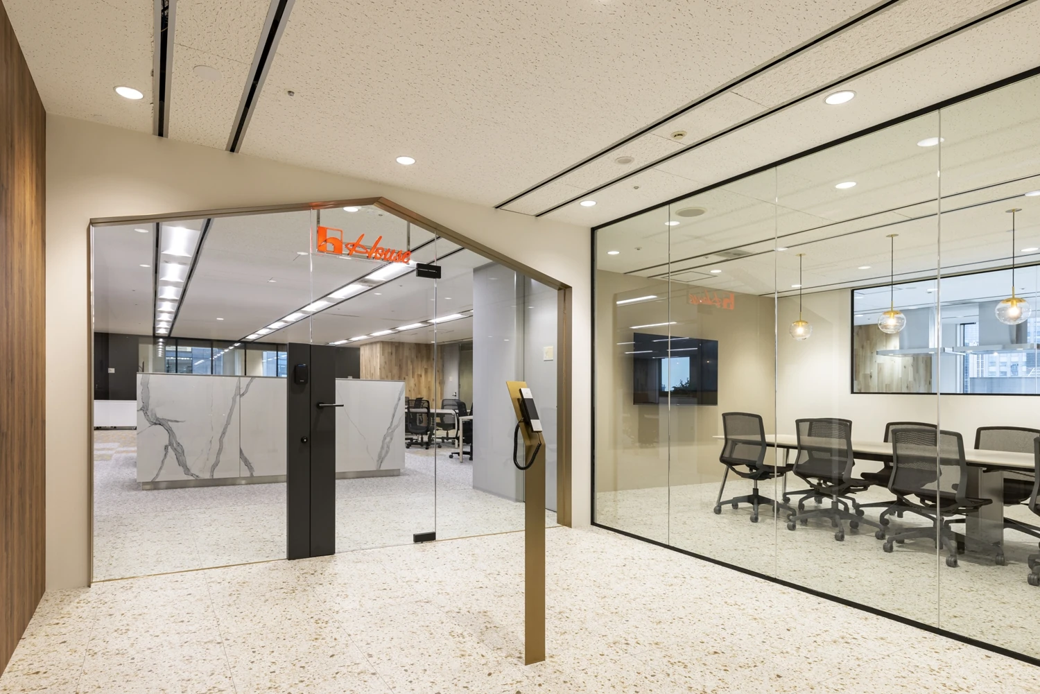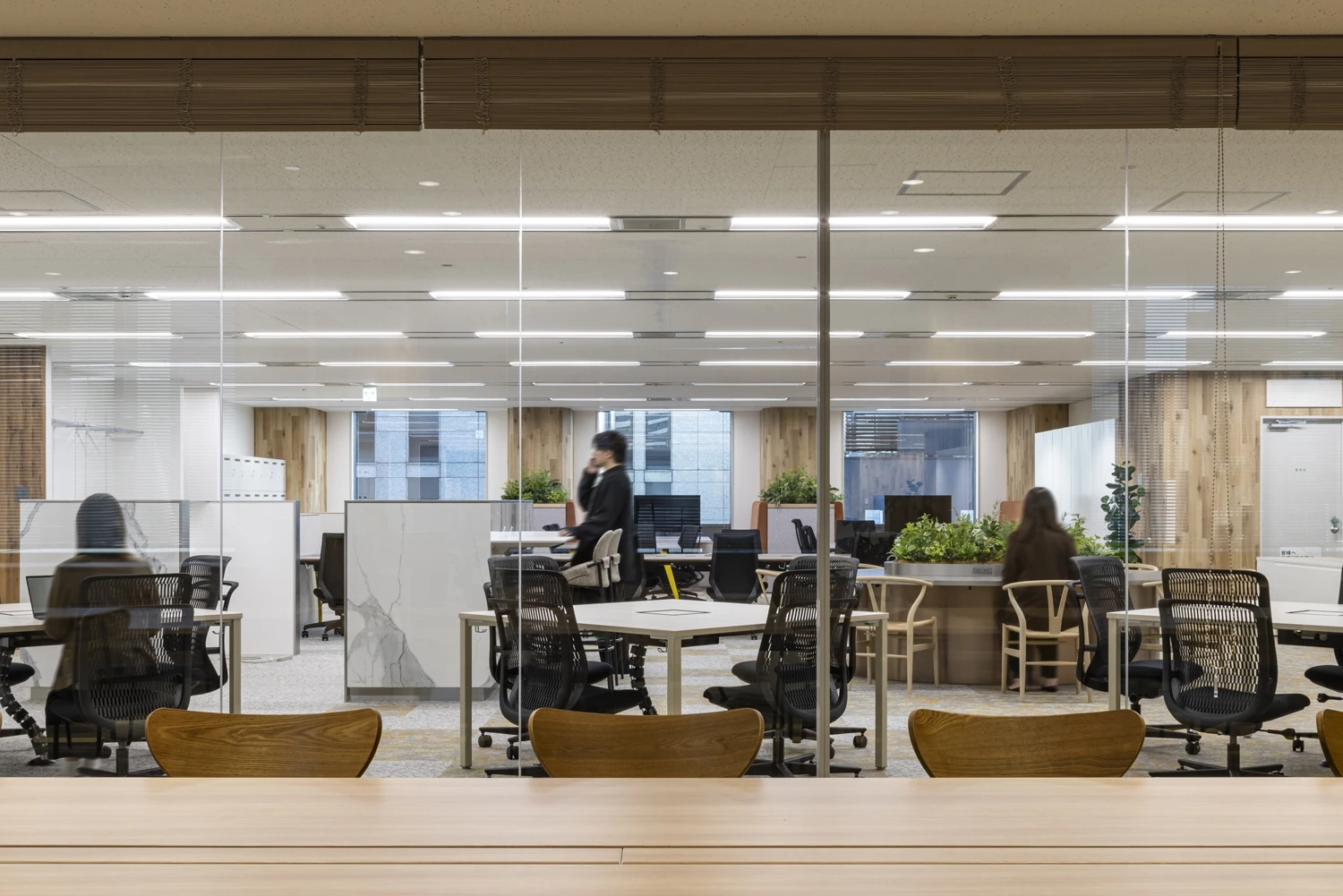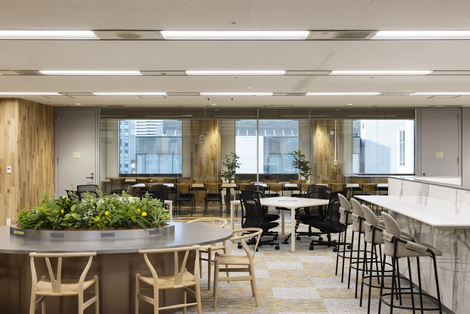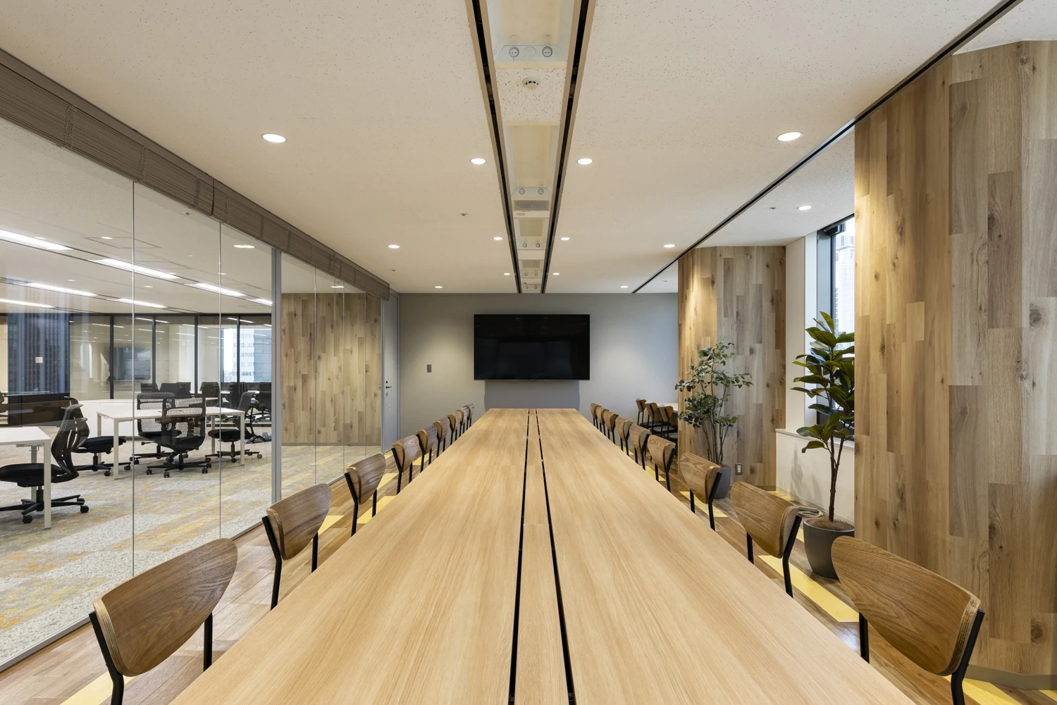 会議室越しには、テストキッチンを見えるよう配置する等、ハウス食品様ならではのエリアを見せることで『らしさ』が伝わるようゾーニング設計しています。