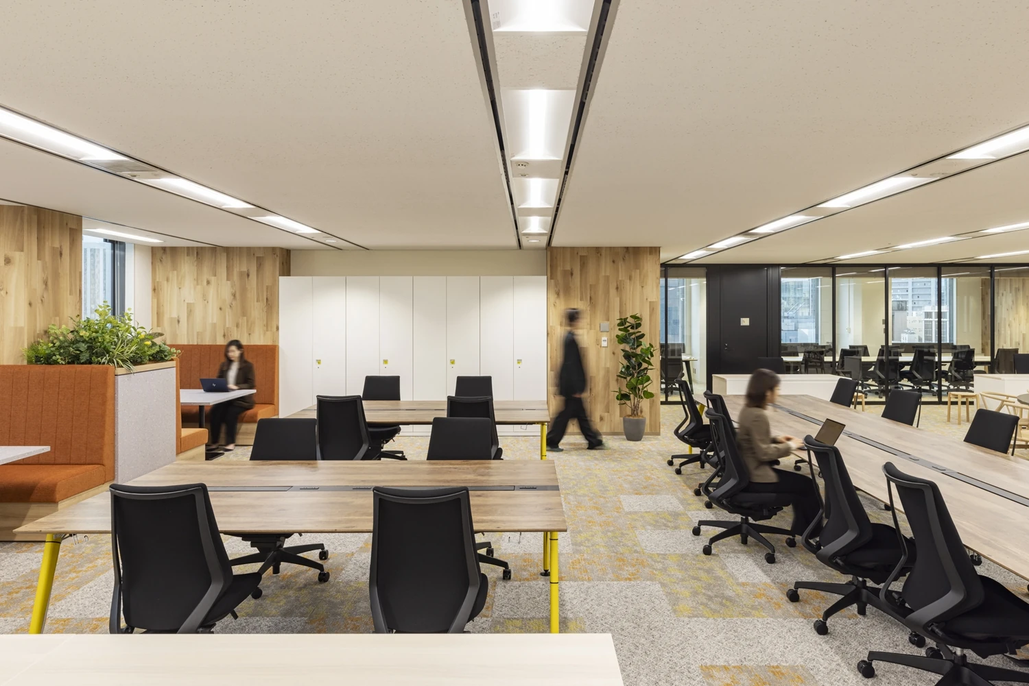 デザインは、木目をベースとしながらもゴールドを使用することでカジュアル過ぎず、落ち着きと品格を感じさるようにしています。什器や張地にカラーを取り入れ、温かみがありメリハリの効いた明るい空間となるようコーディネートしました。