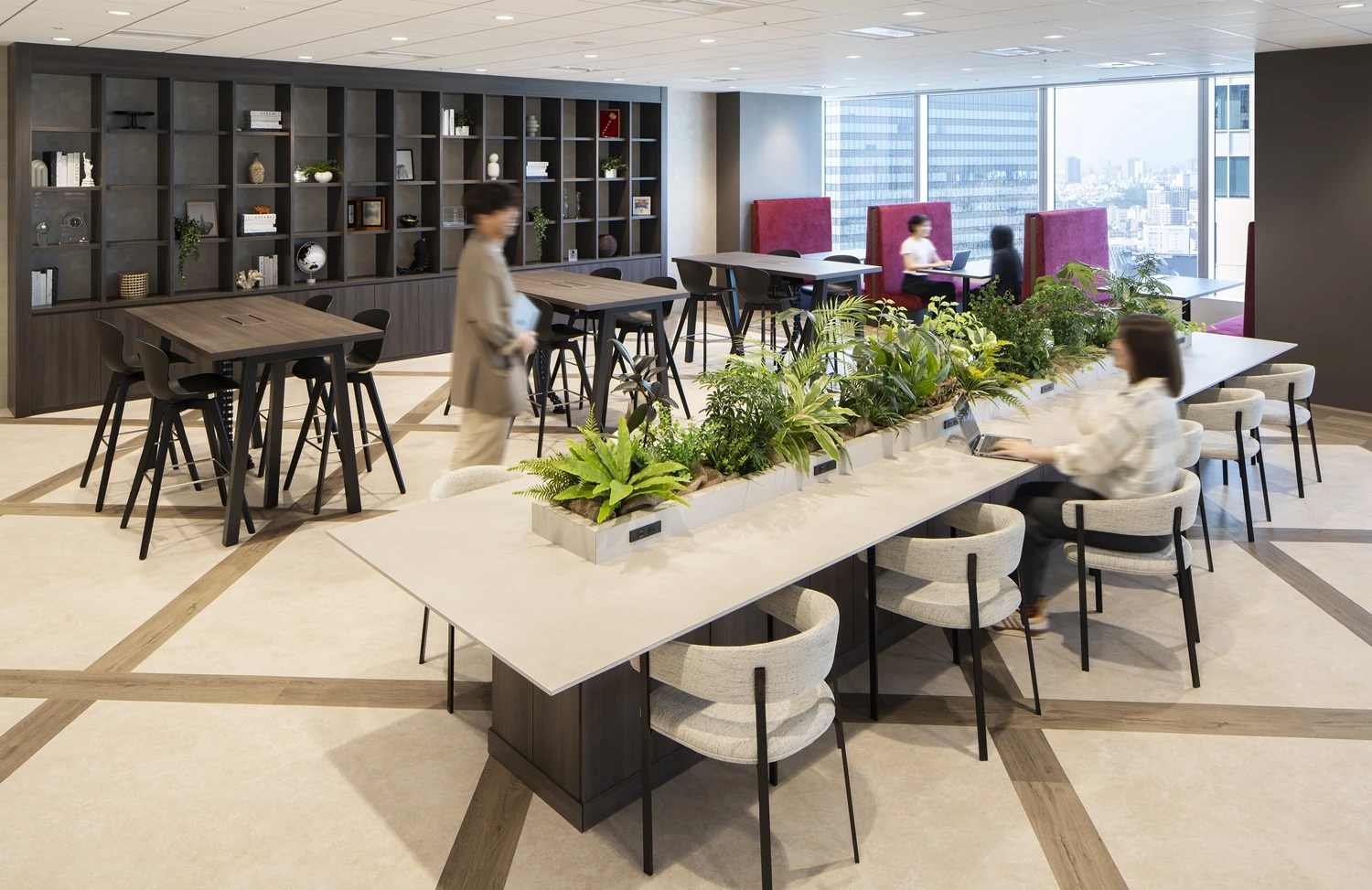 ワークスタイルはフリーアドレス運用を採用。オンラインブース、社内会議室を設けており、業務内容によって働く場所を選ぶことができます。ラウンジエリアにもハイテーブルやファミレスブースを設け、業務ができるだけでなく、オープンミーティングなどもフレキシブルに対応できるようになりました。
