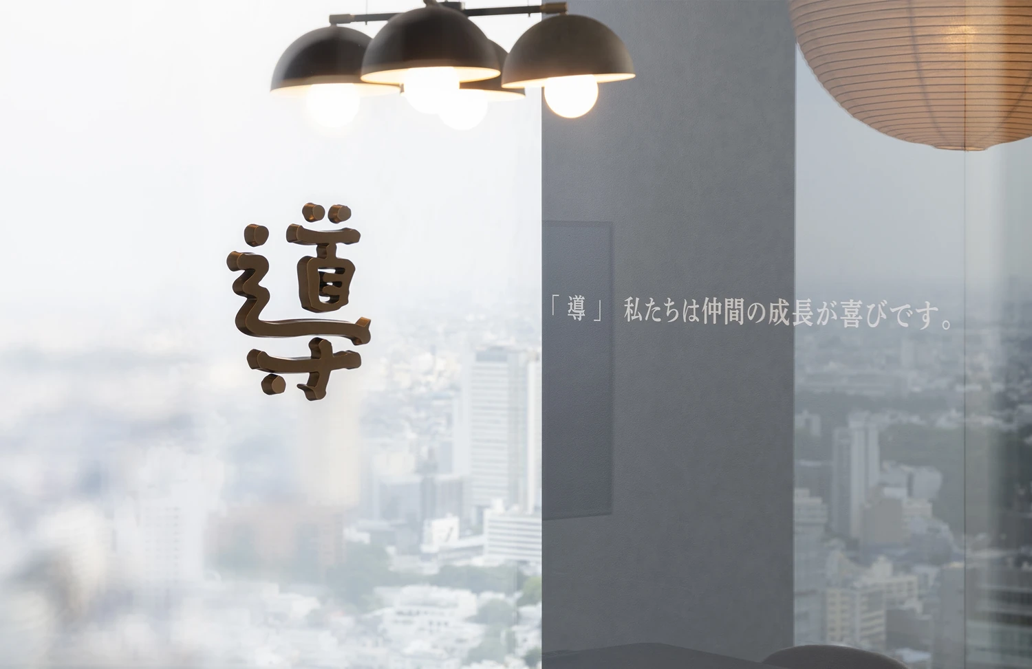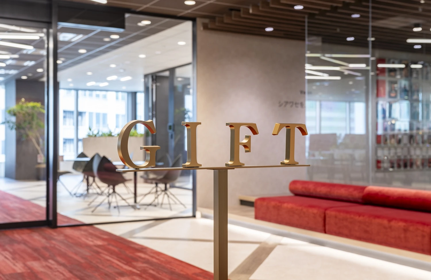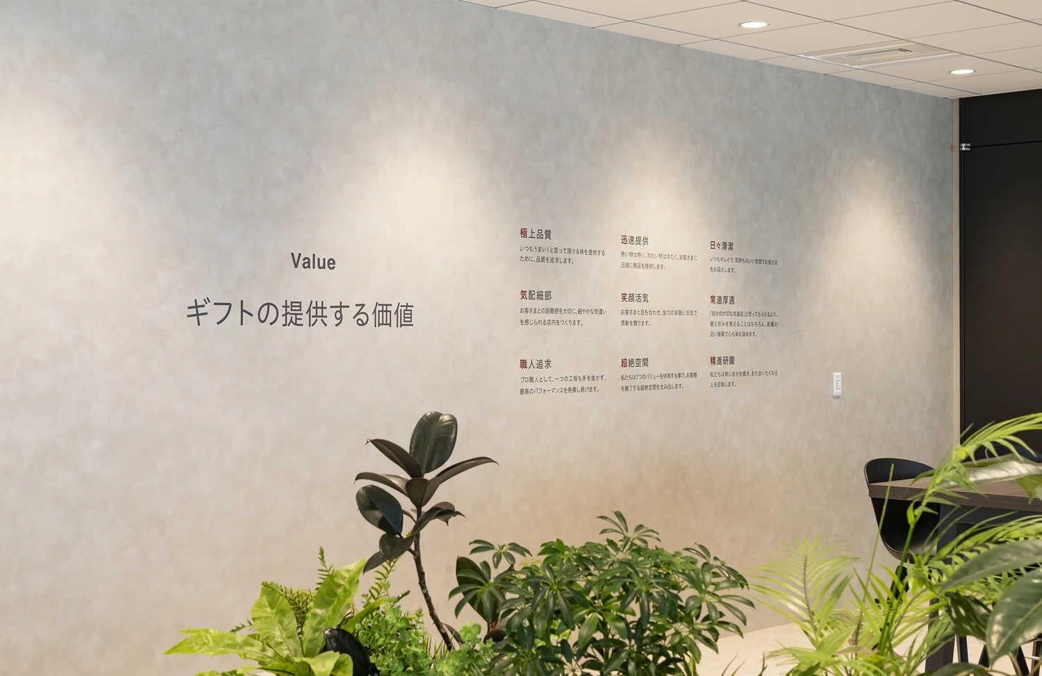 各所にはギフトホールディングス様の行動指針をグラフィックデザインとして設置。メンバーがいつでも企業の方向性を認識できるようにしています。