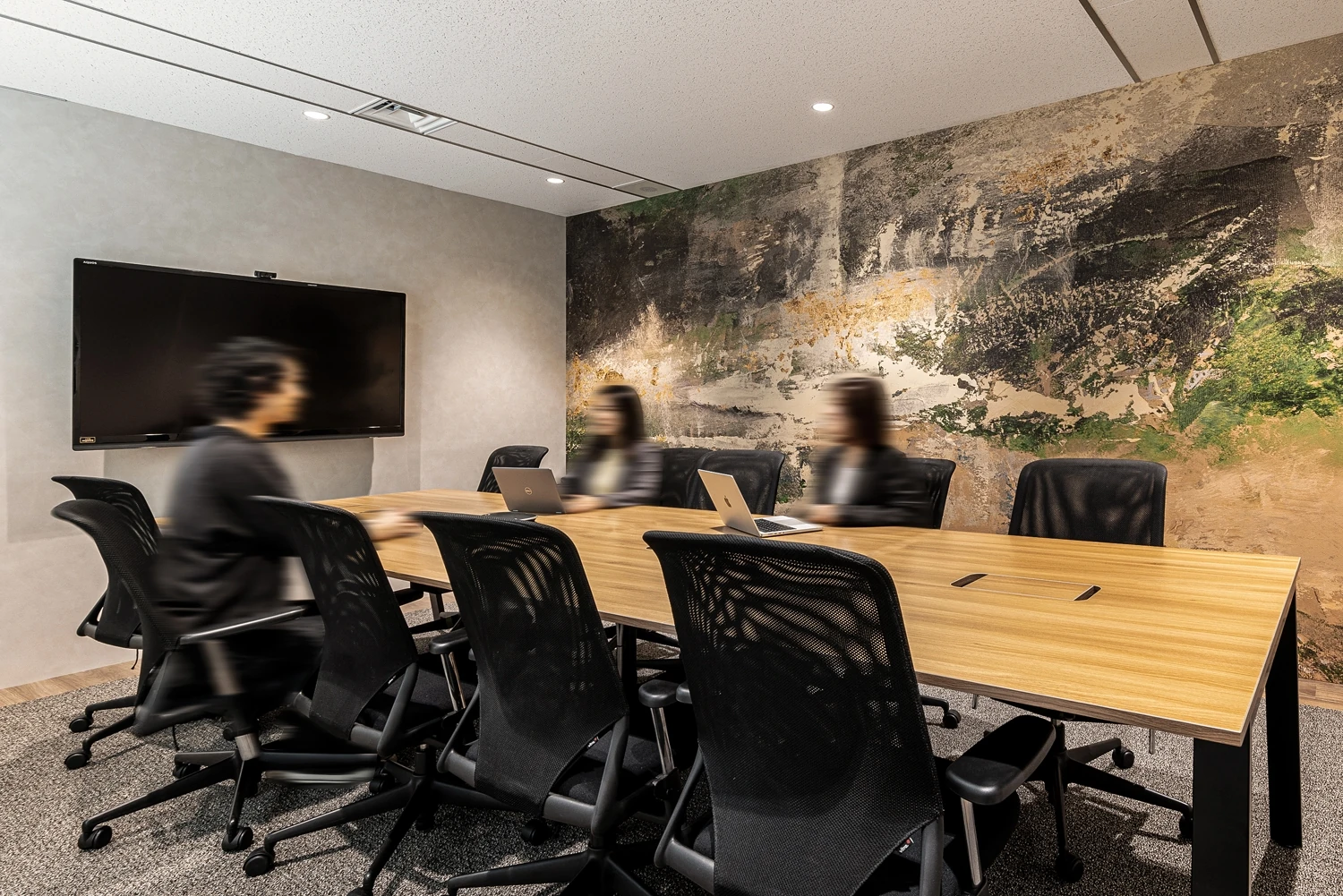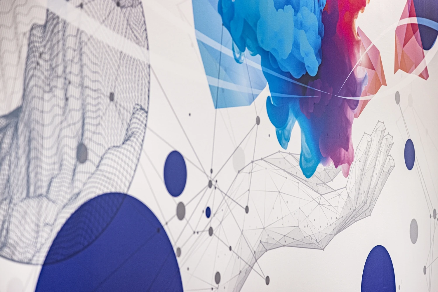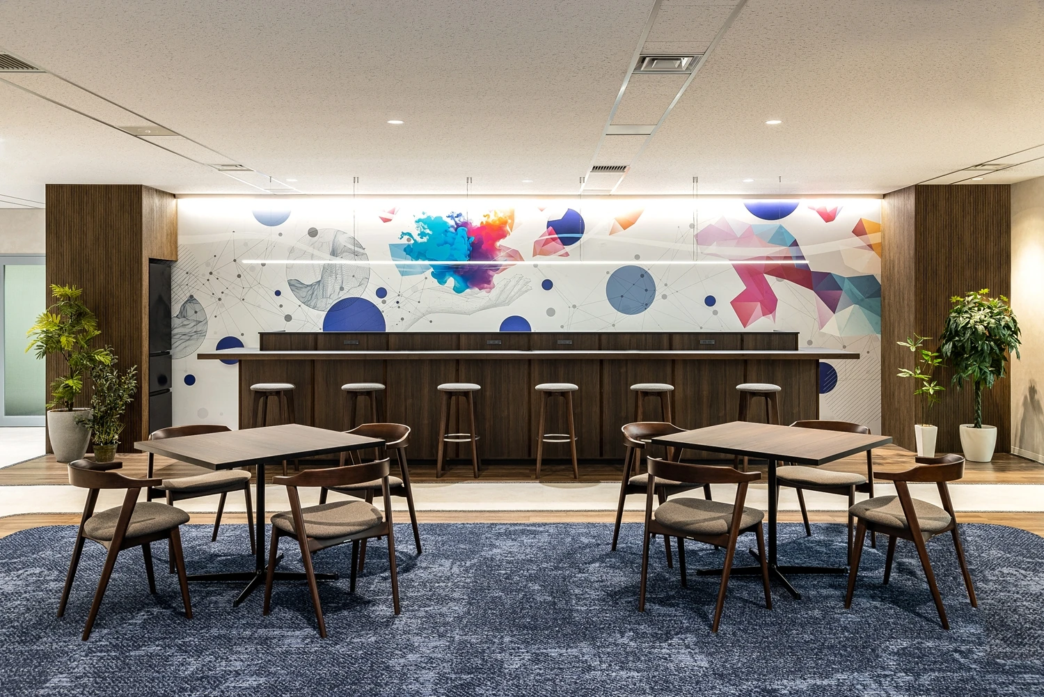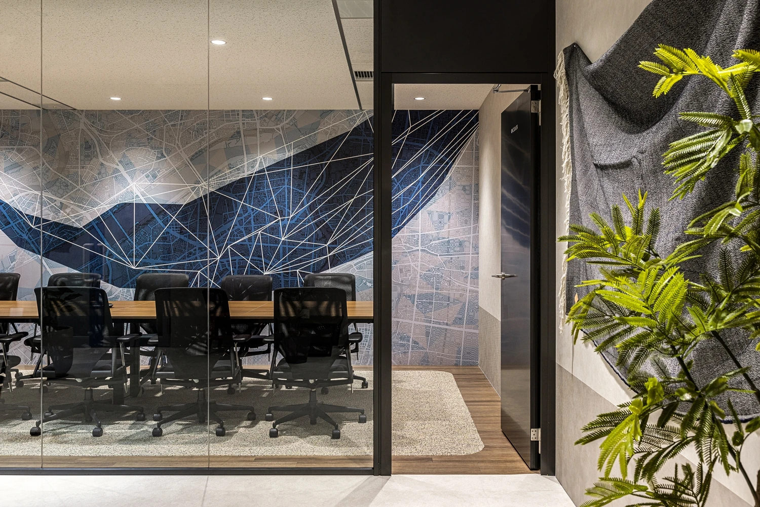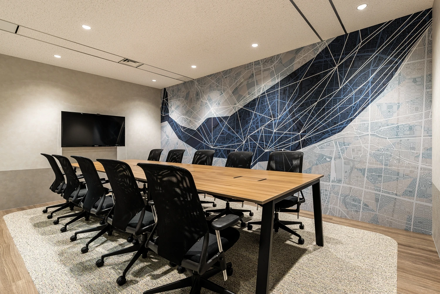 今回のデザインのポイントとして、グラフィッククロスを制作しました。エントランス正面の10名用会議室には「時流適合」をモットーとするビーアンドピー様にちなみ、時代に合わせて海と陸へ生き方を変えたクジラをモチーフに。フリーエリアには、ビーアンドピー様の製品ができるまでの過程をドットで抽象的に表現したグラフィッククロスを作成し、社内外のブランディング発信力を向上させています。