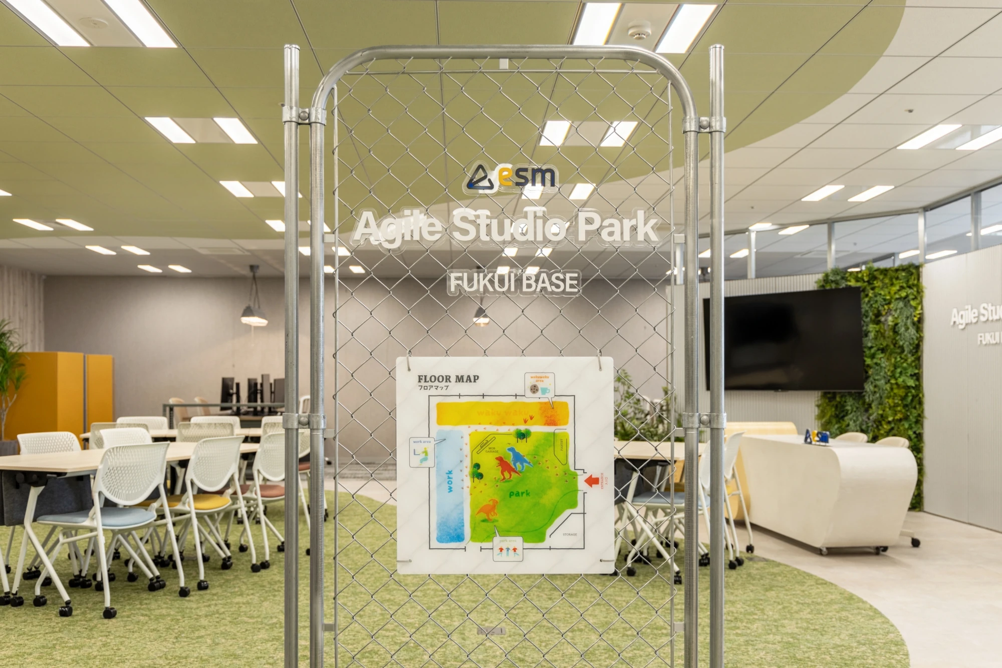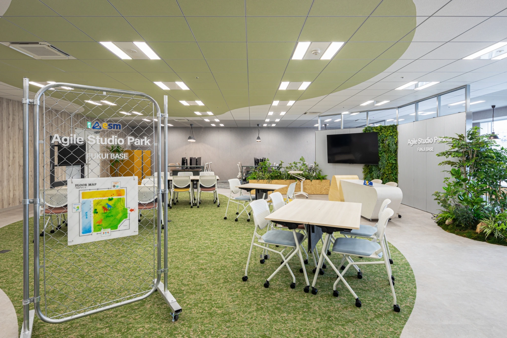 『Agile Studio Park FUKUI BASE』というコンセプトのもと、遊ぶように働くワークプレイスを目指し、公園のような要素と、会社の創業期に働いているようなガレージのイメージをデザイン。モルタルや躯体素材として使われるようなインダストリアルなマテリアルを空間にちりばめました。テナント中央を広場やセミナー、社内打合せとしても使用できるように、簡易的に間仕切を設けて、フリーで働ける席と執務席に分けています。またアジャイル開発をするうえで社内ミーティングも多いので複数箇所にモニターを配置してスピーディーに仕事ができるような仕掛けを施しています。実際に、セミナーやイベントが開催され、テレビや新聞の取材も舞い込むなど、永和システムマネジメントを広める活動が実施されています。