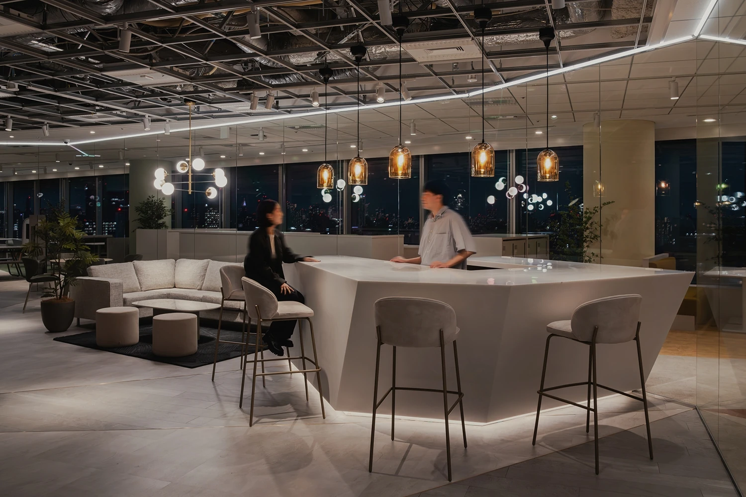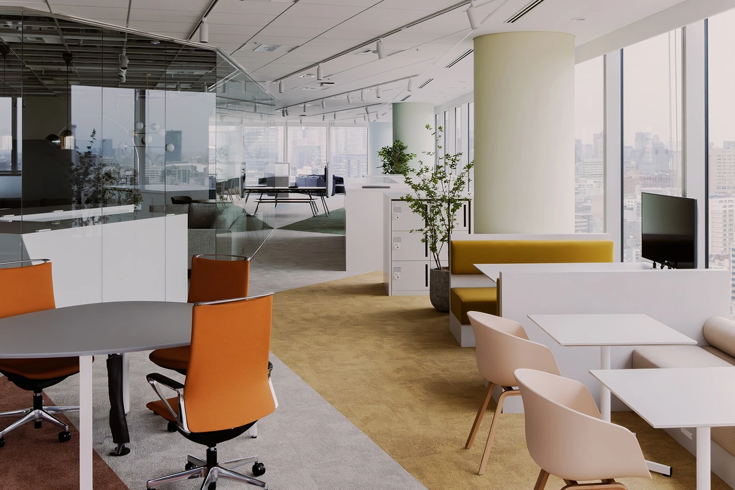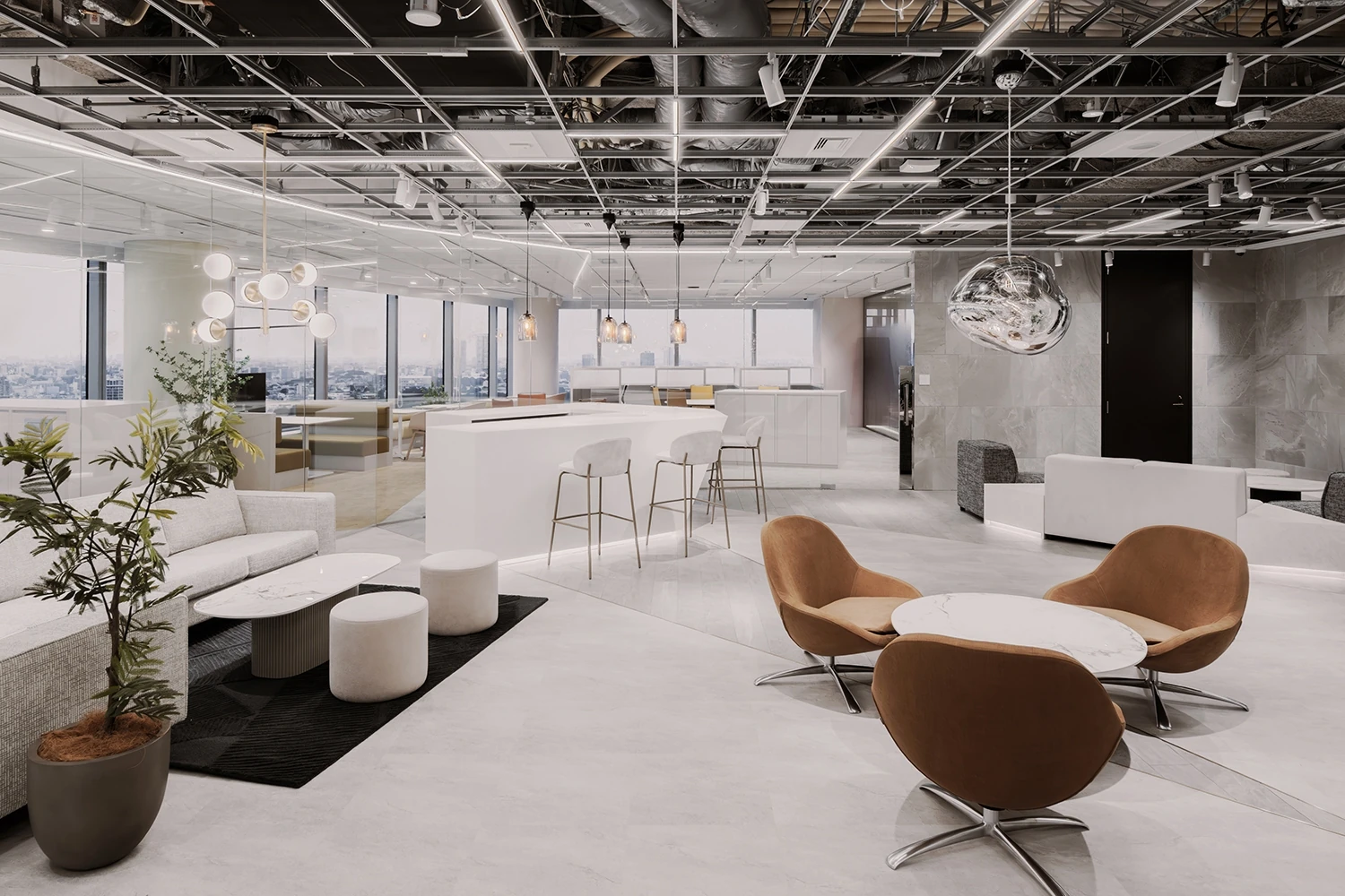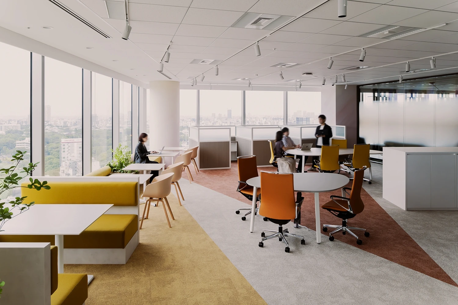 本社とは違った新たな働き方を積極的に取り入れていくオフィスとして「Expérience」というテーマを設定。フランス語で実験、英語で経験や体験という意味をもつ言葉として、固定概念にとらわれない働き方や今までにないオフィスの使い方に挑戦し、経験を積み重ねていくことを目指しました。大きな特徴として、来客エリアであるラウンジとワークエリアの境にガラス壁を設け、視線が抜けるように設計。来訪者に空間の広がりや、外の景色を楽しんでもらえるような空間を演出しています。また、同じオフィスでグループ会社も働くため、ワークエリアは完全にスペースを区切るのではなくフリーアドレス制度を取り入れつつも、共有部に交差するスペースを設け、ゆるく空間をつなげつつコミュニケーションが促進されるようなレイアウトにしています。全体のデザインは、ジュエリーを扱う企業としてのブランドが伝わるように、ダイヤモンドが放つ虹色の輝きを想起させるようなカラー・質感の建材を利用しています。