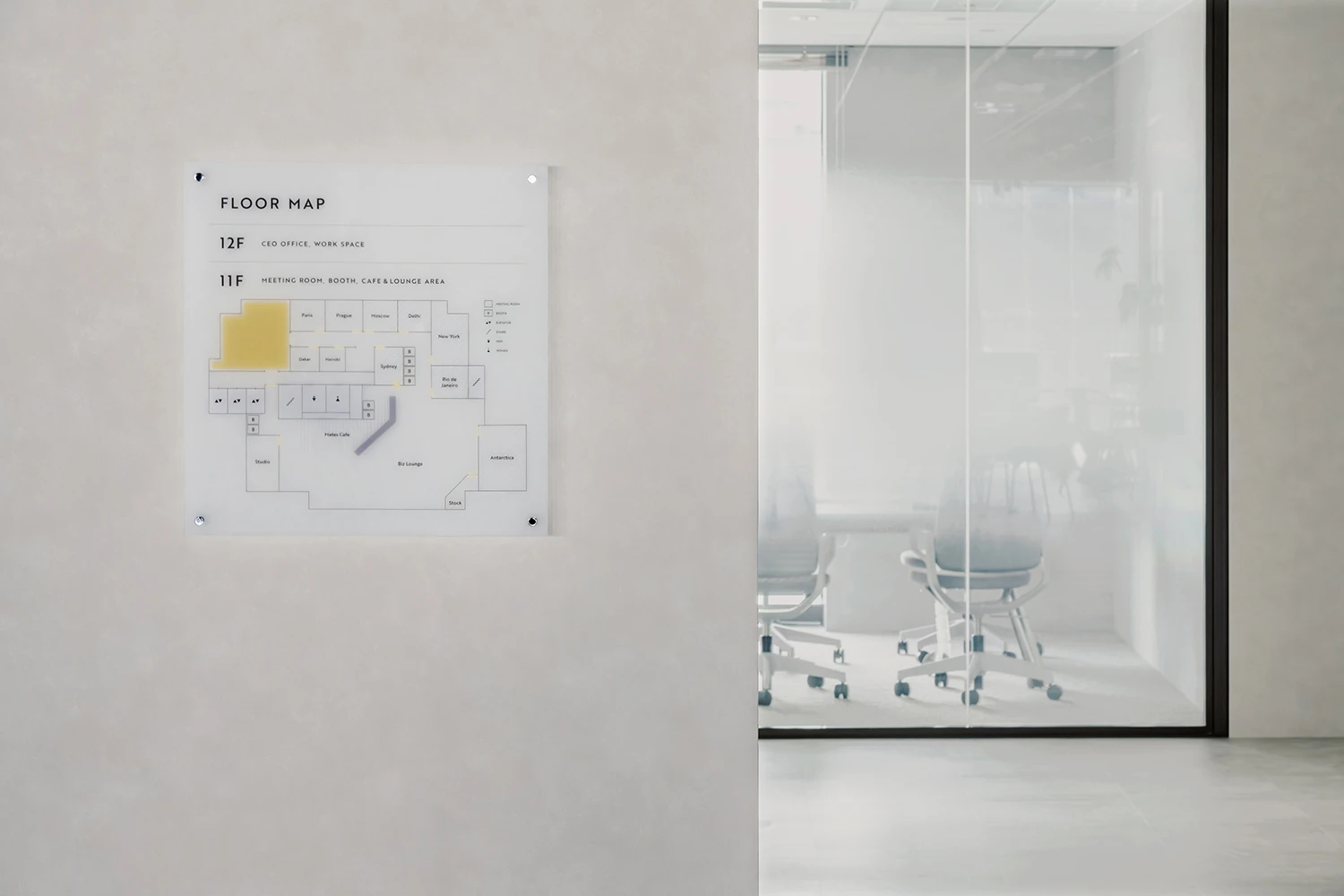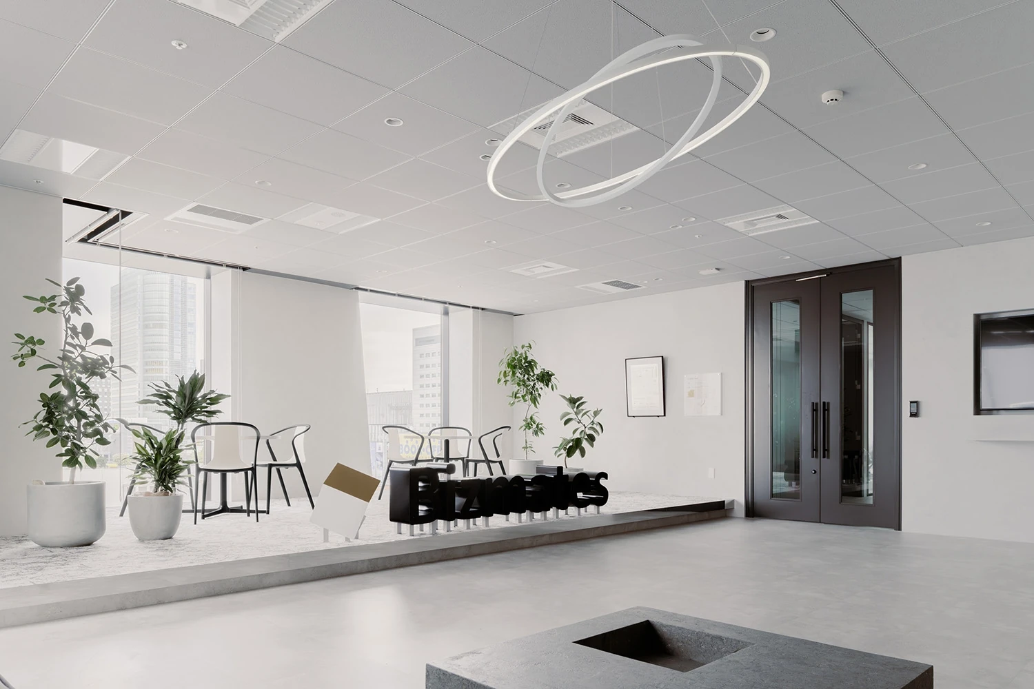 メインエントランスを構える11階には、ペアガラスで防音対策を施した会議室を配置。会議室の他にも社内・社外イベントが開催できる広々としたラウンジや、YouTube撮影などができる撮影スタジオも備えています。会議室とコミュニケーションスペースを同じフロアにつくることで、社員同士の偶発的な交流と情報共有の機会の増加を図りました。12階はメインのワークスペースとして、将来的な増員にも対応できるようにフロアを構成。壁をつくらずオープンなスペースとすることで、隣り合う部署同士で情報共有を円滑にし、事業間シナジーの創出を目指すとともに、企業文化や価値観の浸透、組織全体の一体感の醸成を目指しています。