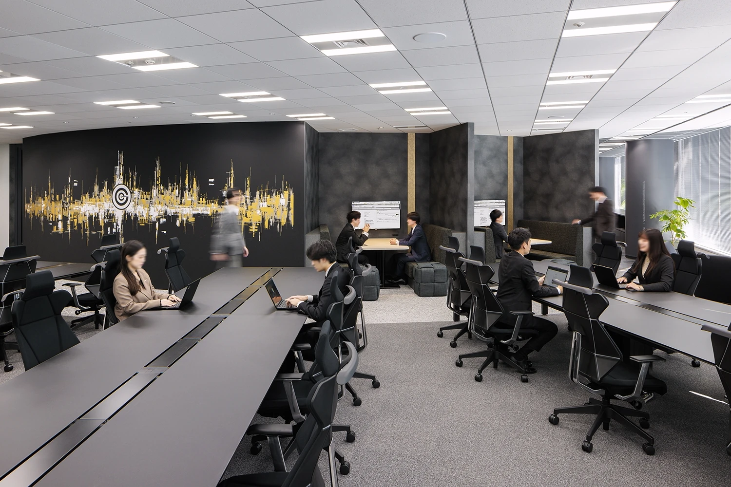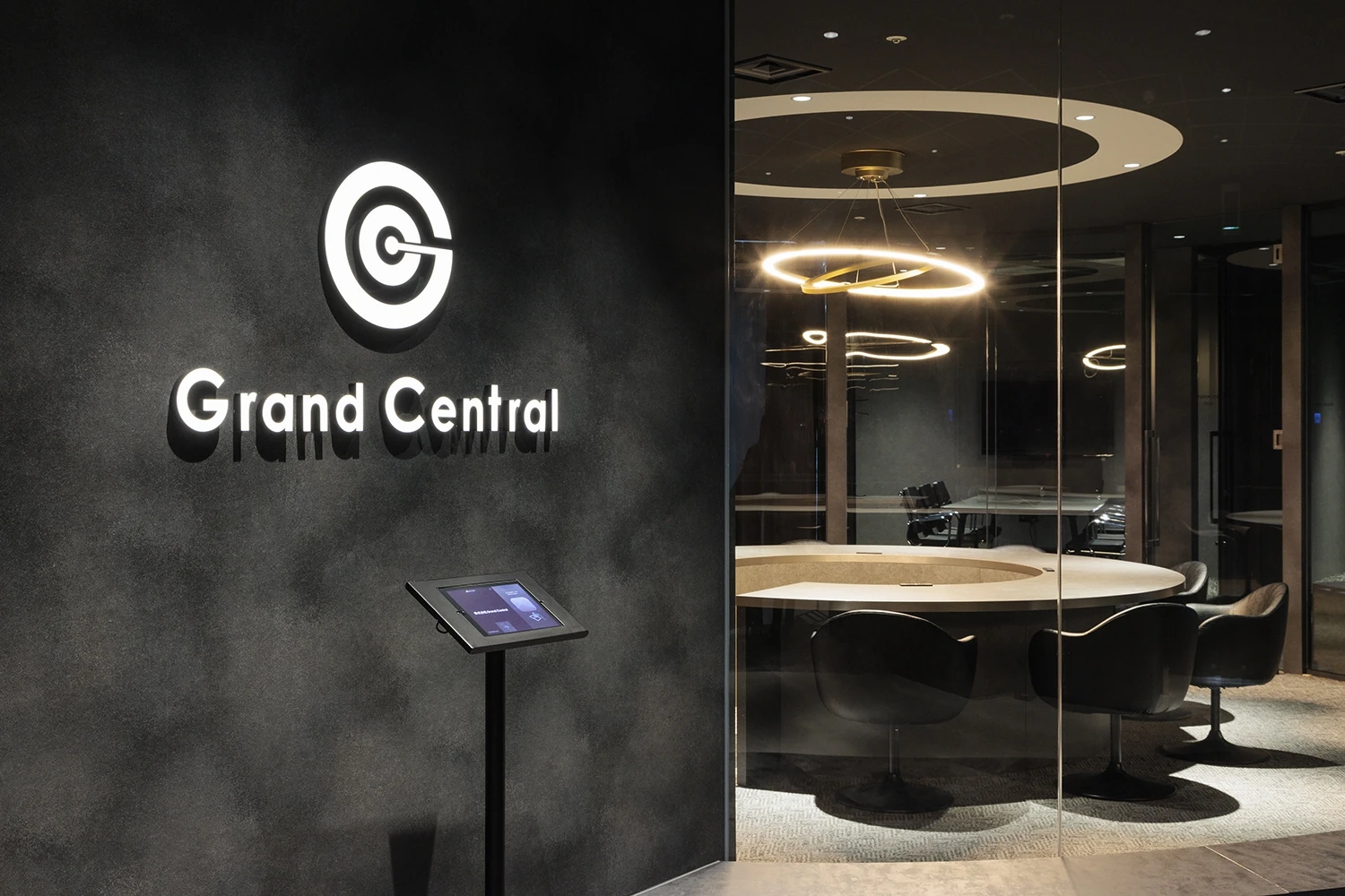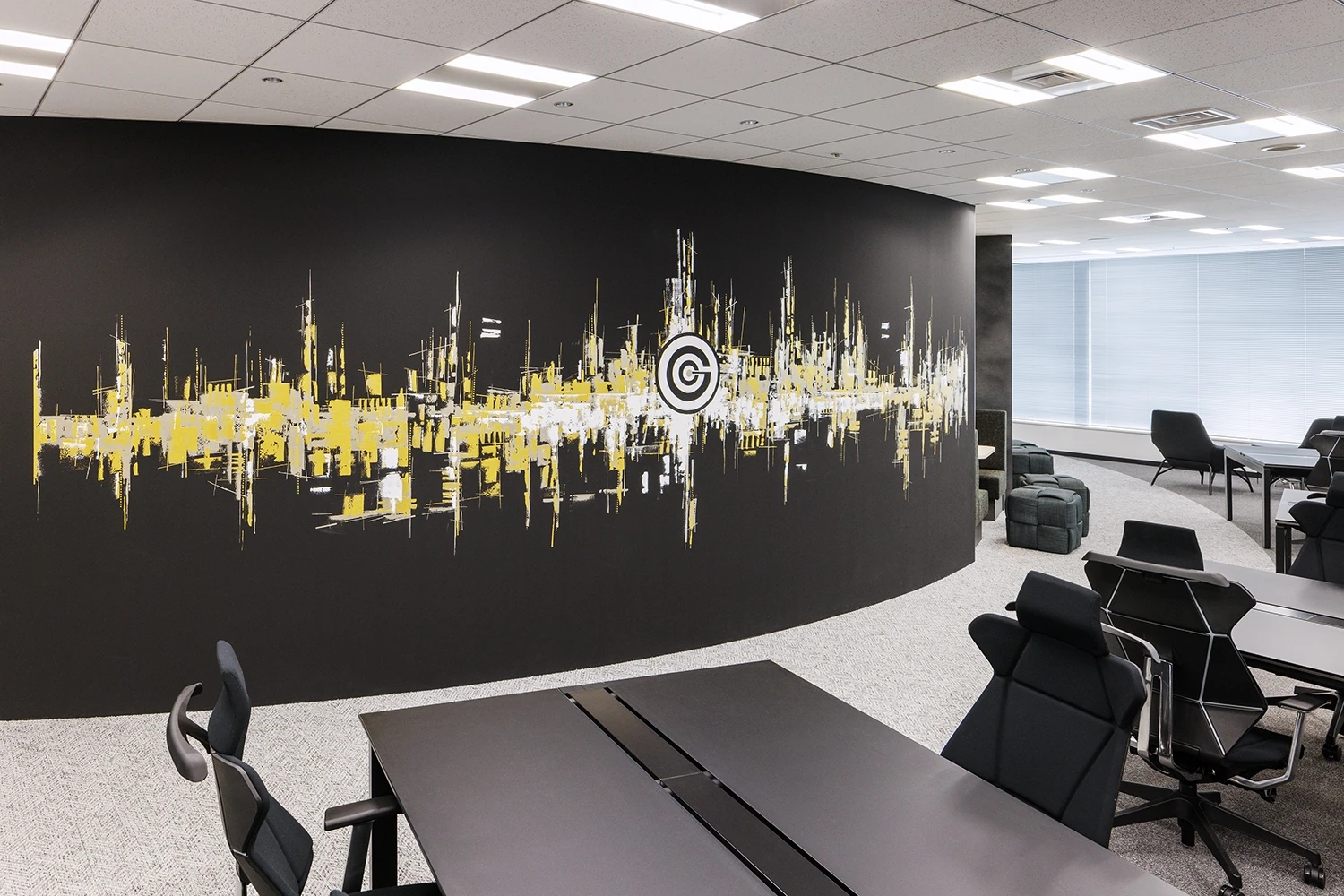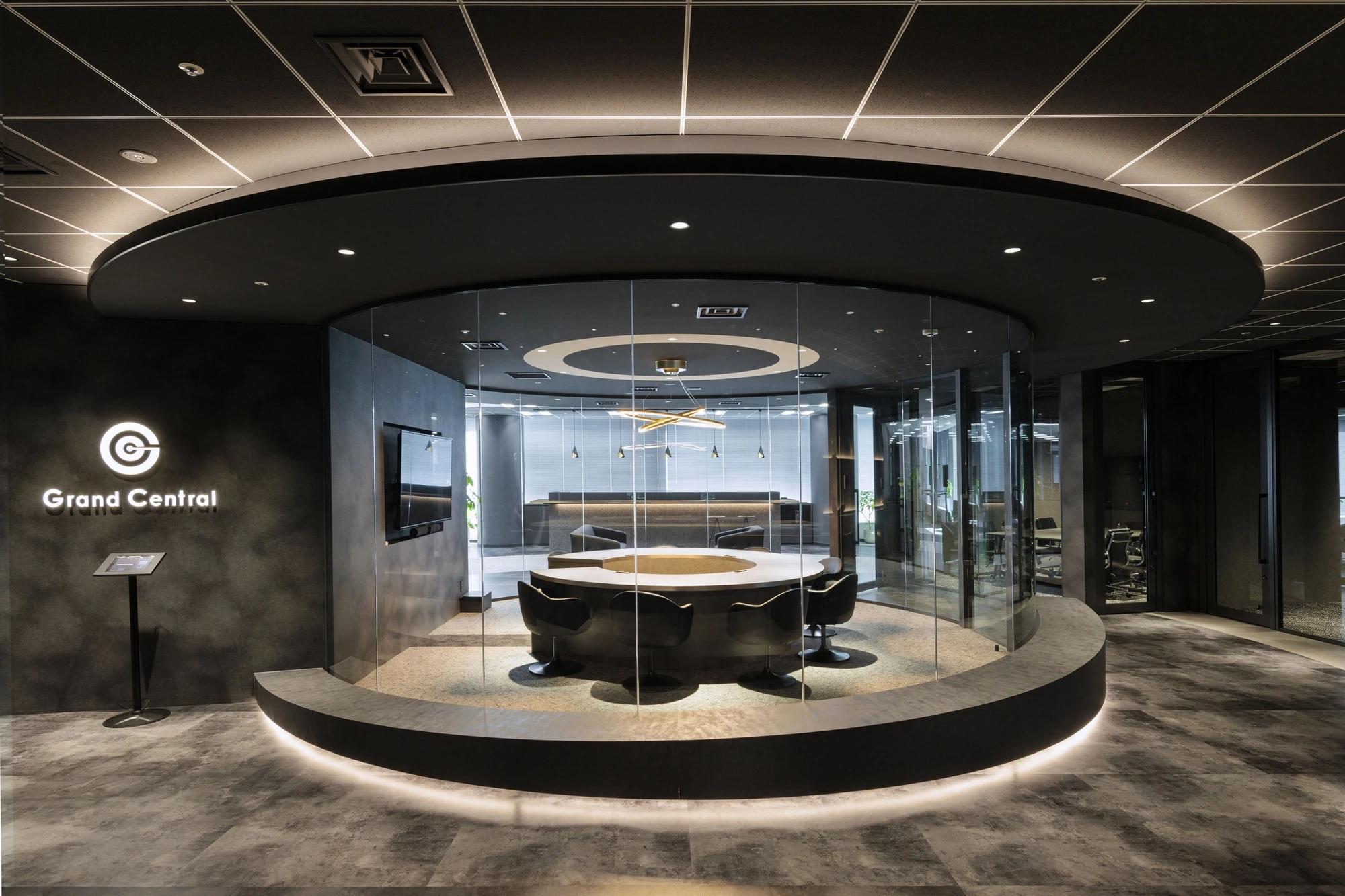 今回、Grand Central様らしさをオフィスで実現するために、ロゴマークの核(スタート地点)となる「ゴールデンポイント」をオフィス全体に落とし込んでいきました。エントランスに入ってすぐには、ロゴマークにちなんだガラスで囲われた円卓のような会議室を配置。来訪者へのブランド訴求を実現しています。ワークスペースも円形にレイアウトし、オフィス全体でロゴマークを表現。また、壁面には、今回のコンセプトを体現するアートを大きく施し、社員の帰属意識の向上につなげています。全体のカラーは、高級感や洗練された印象を与える黒を基調とし、空間に統一感をもたせながら、社内外へのブランディングを行っています。