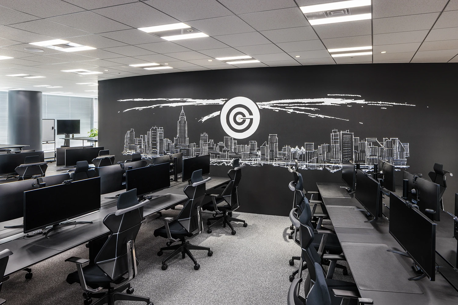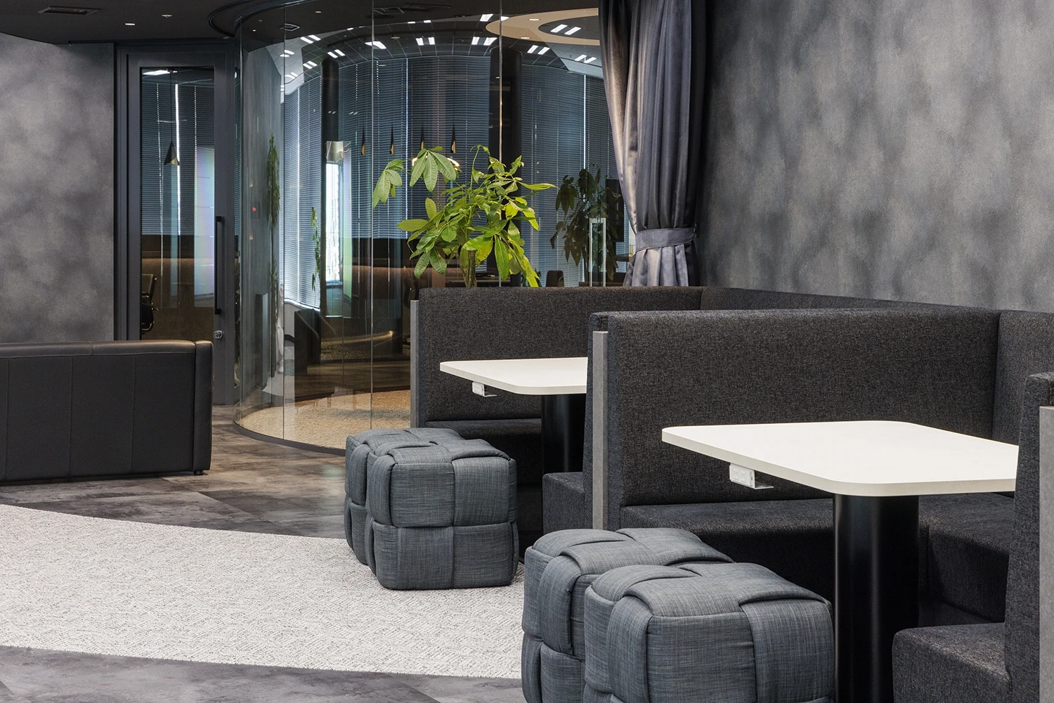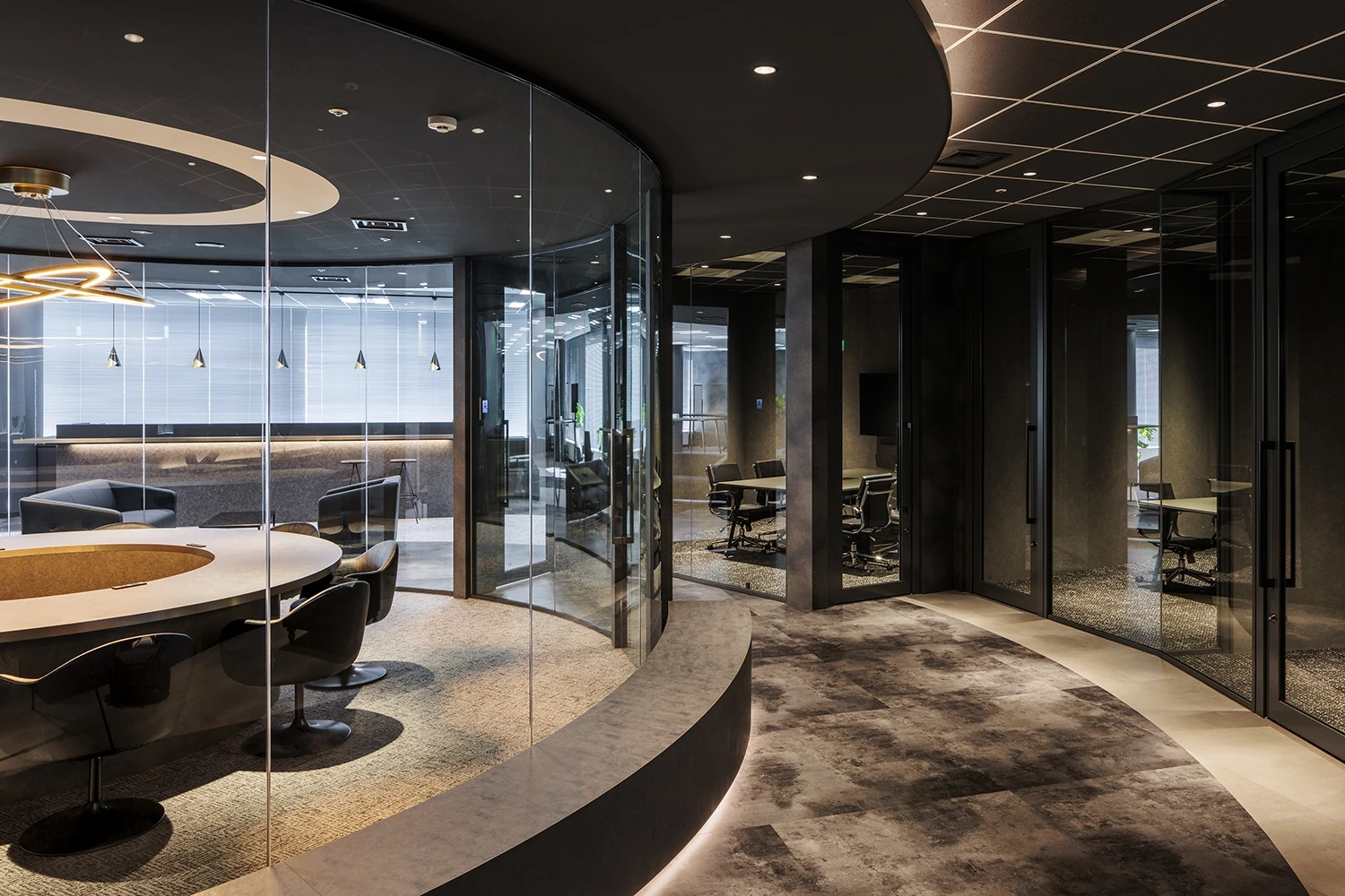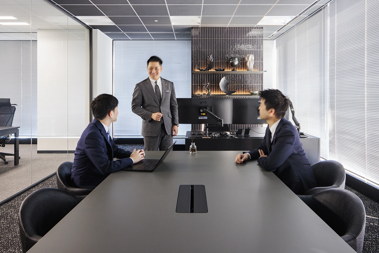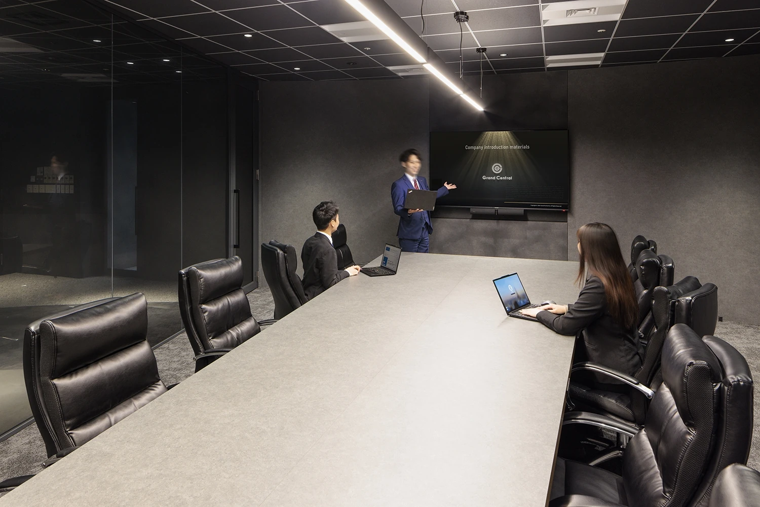 今回、Grand Central様らしさをオフィスで実現するために、ロゴマークの核(スタート地点)となる「ゴールデンポイント」をオフィス全体に落とし込んでいきました。エントランスに入ってすぐには、ロゴマークにちなんだガラスで囲われた円卓のような会議室を配置。来訪者へのブランド訴求を実現しています。ワークスペースも円形にレイアウトし、オフィス全体でロゴマークを表現。また、壁面には、今回のコンセプトを体現するアートを大きく施し、社員の帰属意識の向上につなげています。全体のカラーは、高級感や洗練された印象を与える黒を基調とし、空間に統一感をもたせながら、社内外へのブランディングを行っています。