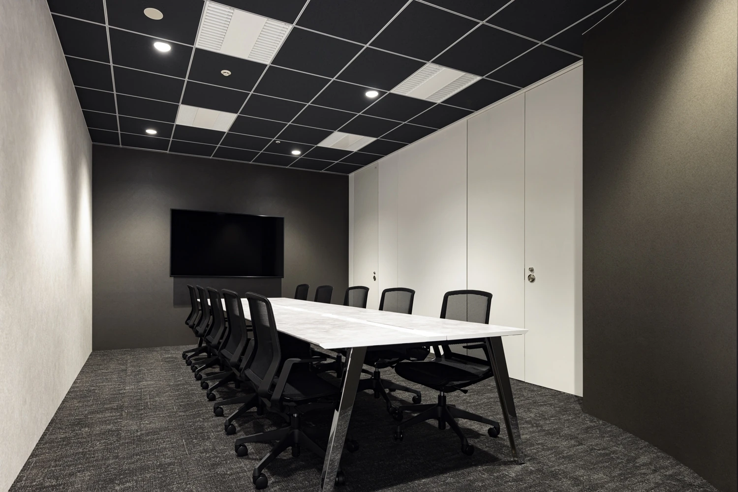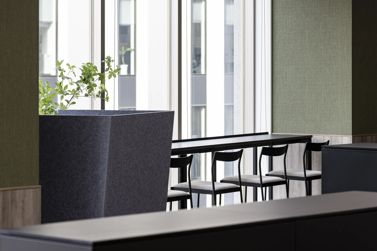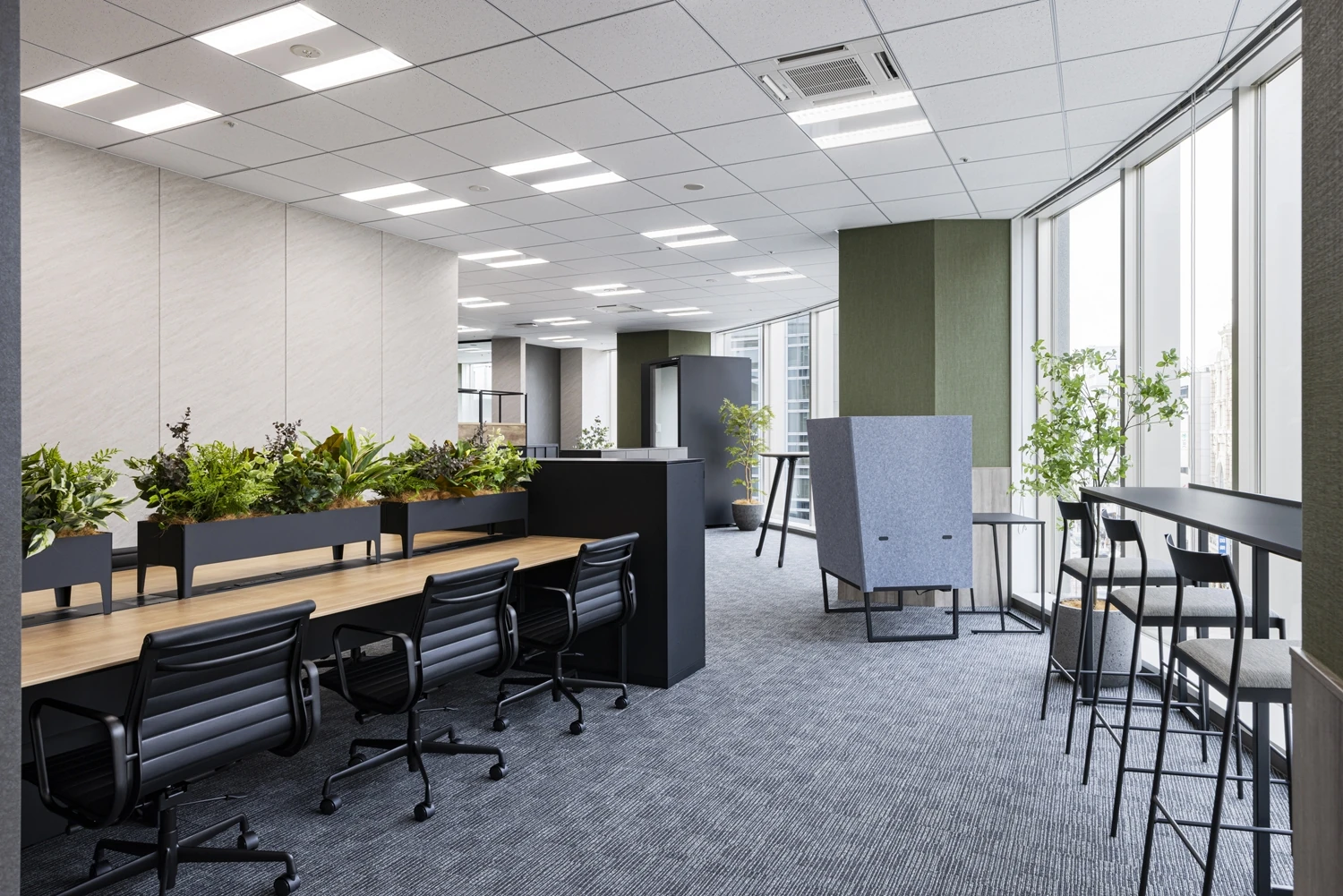 酒造りを起源とした企業であることから、ワークプレイスのコンセプトに発酵を意味する『Ferment』をコンセプトとして掲げ、拠点の中でオリジナルの文化や雰囲気、考え方を醸成していくことを目指しました。デザインは、落ち着いたイメージのダークトーンでまとめつつ、シャープな形状、グレード感の高い家具でオフィスを構成することで老舗企業ならではの厳格なイメージを演出。同時に、ブラケット照明の取り付けや底目地などでスタイリッシュさも表現しています。レイアウトに関しては会議室の追加だけでなく、シーンによって働く場所を選ぶことができるフリースペース・個室ブース・半個室ブースを完備することで、新たな働き方であるフリーアドレスと固定席の併用を実現しました。