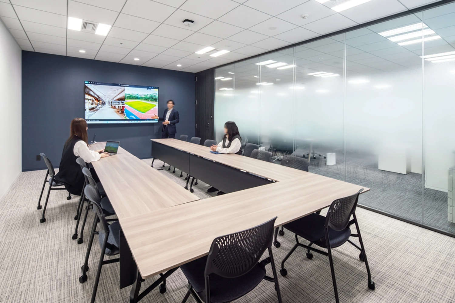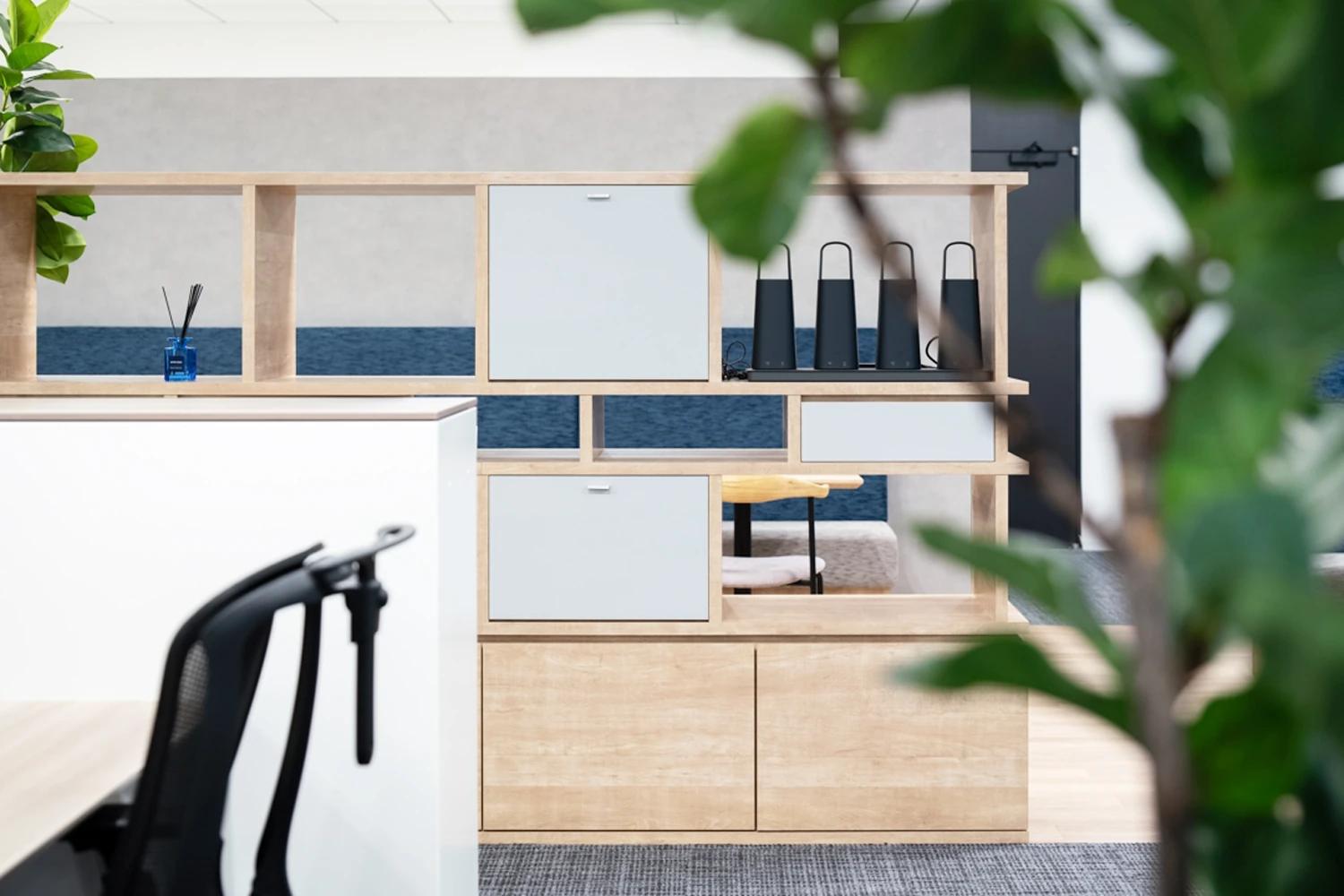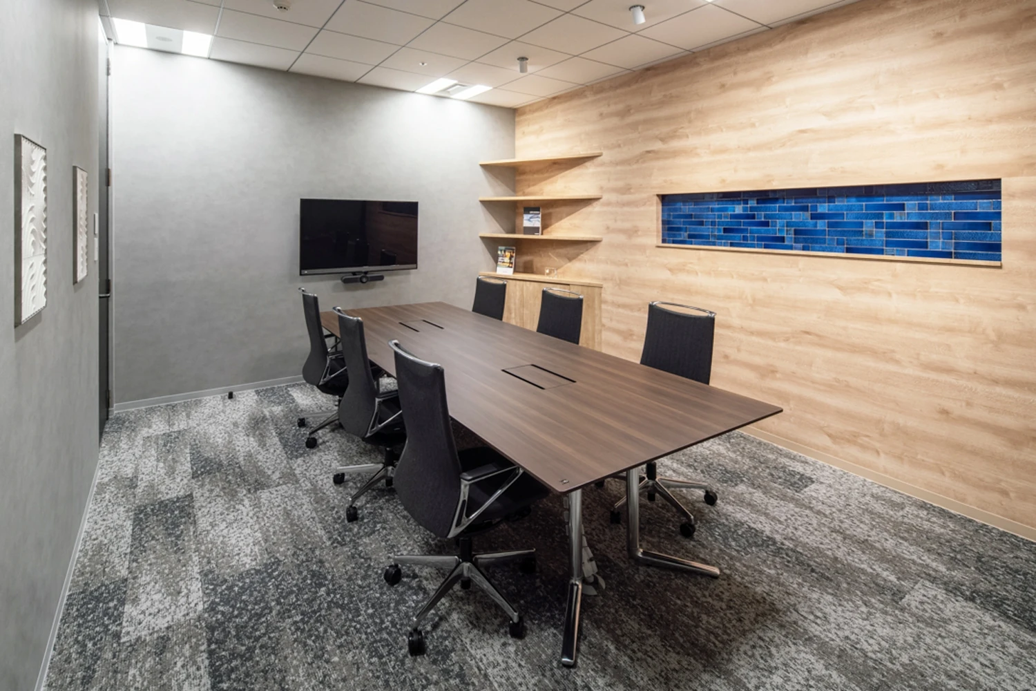 また、総合素材メーカーであるクリヤマジャパン様の自社製品であるタイルをデザインに落とし込み、来訪したお客様や面接に来た求職者に向けて事業内容を語ることができるオフィスを構築しました。
