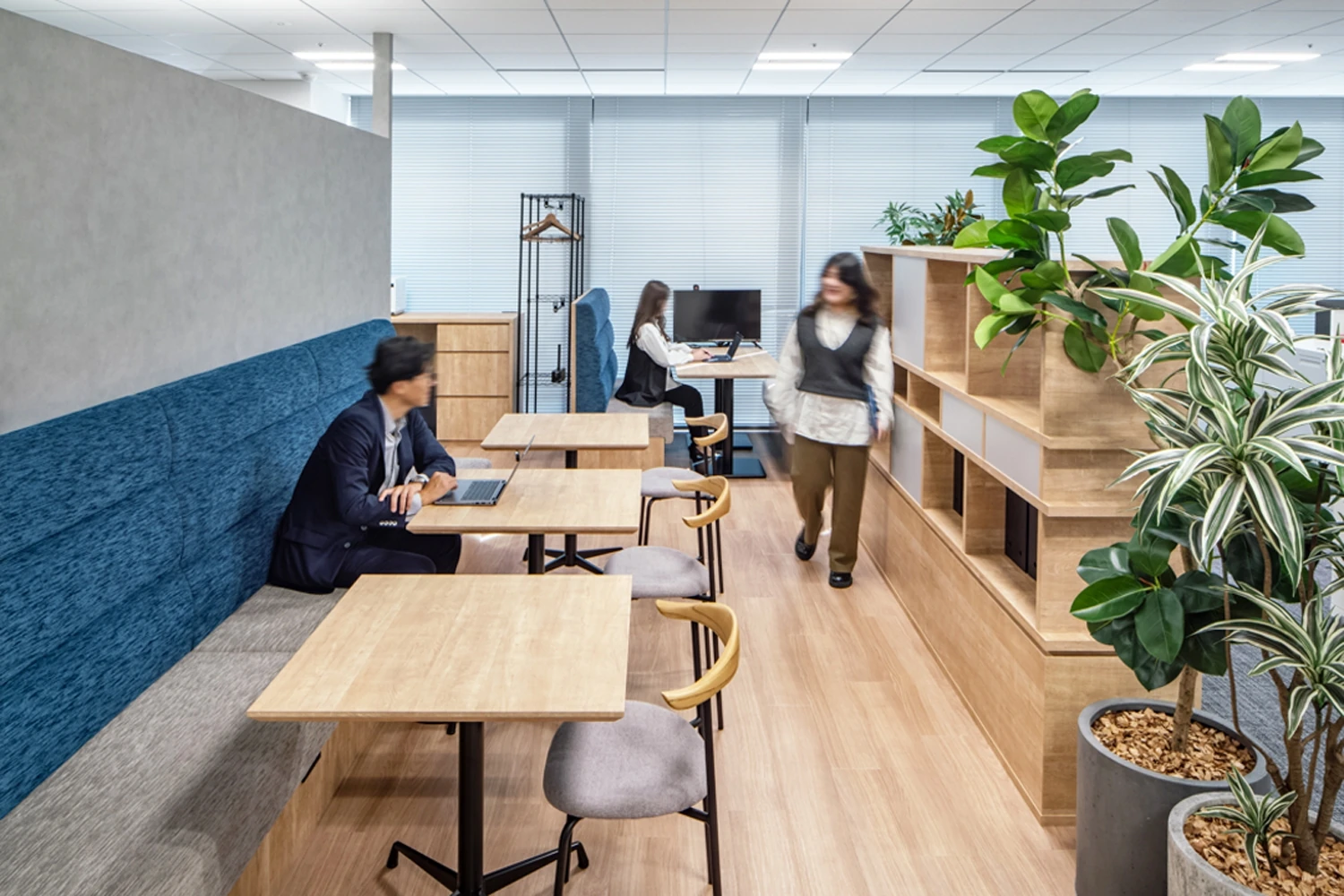 従来の働き方から脱却し、個々の成長と一体感を実現するために一部のエリアでフリーアドレスを導入。バックオフィスのメンバーはこれまで通り固定席にて運用する事で、情報管理の観点でも安全性を高く保ちつつ、自由なコミュニケーションを図る事ができるレイアウトを設計しました。加えて、移転前のオフィスにはなかった多目的エリアを作ることでそこには、さまざまな場所から人が集まり、部署の垣根を超えた新しい交流を促すことができました。