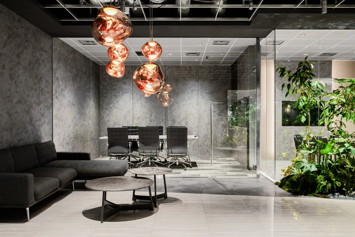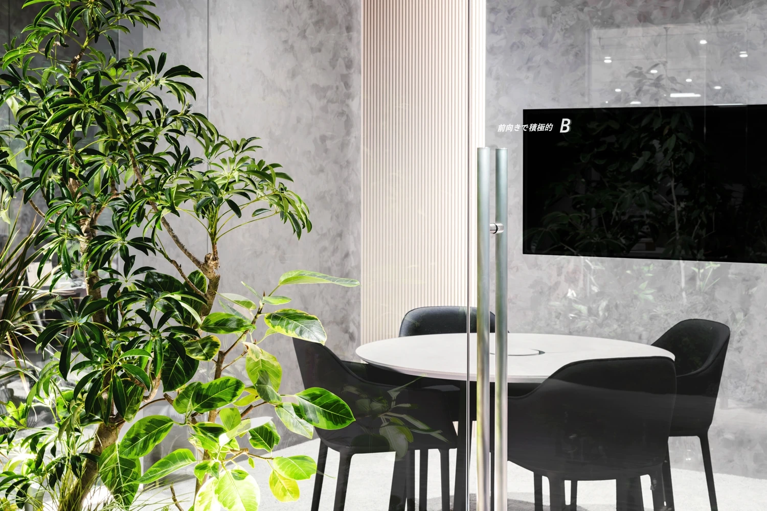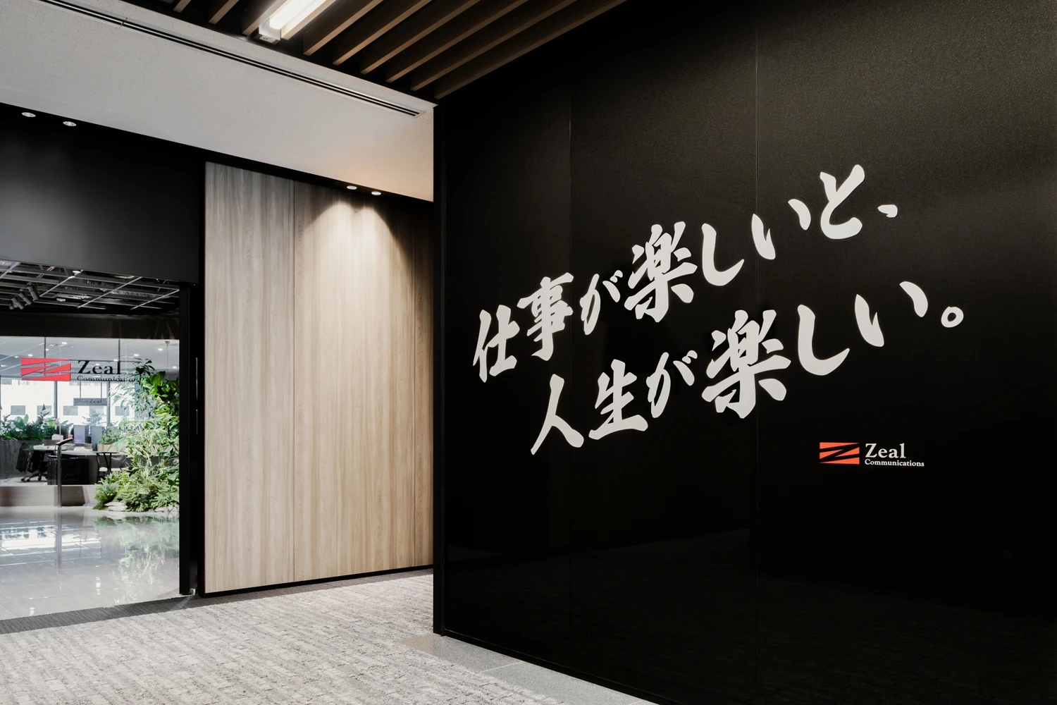 入口前の壁にはジールコミュニケーションズ様のスローガンを大きく掲げ、会議室のガラス扉にはクレドのフレーズを印字し、訪れた人に会社の特色が伝わるような仕様に。これまで3フロアだったところから2フロアにすることで、社員がそろう空間が増え、これまでにない新たなコミュニケーションが生まれることを目的としたレイアウトにしました。エントランスとリフレッシュスペース、執務室をつないで回遊性のある導線にしながらも、作業する場所とリフレッシュスペースはエリアを明確に分けることで、メリハリのある空間に。EVホールから奥のテラスまで続く広々としたエントランスは、マテリアルや家具の選定まで実物を見ながら丁寧にデザインを実現していき、上質で洗練された印象に仕上げました。全体的にソリッドな空間にグレーを基調としながら、アクセントにジールコミュニケーションズ様のコーポレートカラーであるレッドをあしらった、印象的なデザインとなっています。物件の特徴であるテラスをうまく活用できるよう、エントランスからテラスにかけての開放感も特徴的です。