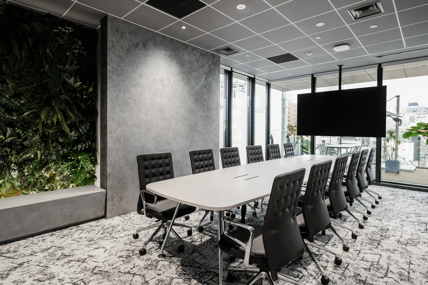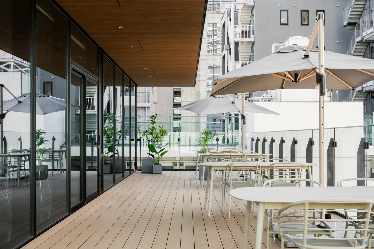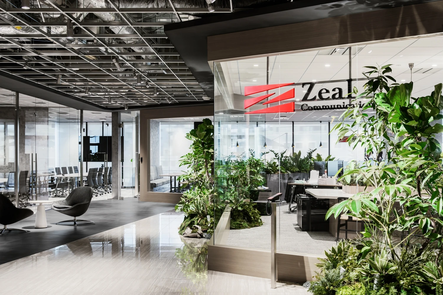 入口前の壁にはジールコミュニケーションズ様のスローガンを大きく掲げ、会議室のガラス扉にはクレドのフレーズを印字し、訪れた人に会社の特色が伝わるような仕様に。これまで3フロアだったところから2フロアにすることで、社員がそろう空間が増え、これまでにない新たなコミュニケーションが生まれることを目的としたレイアウトにしました。エントランスとリフレッシュスペース、執務室をつないで回遊性のある導線にしながらも、作業する場所とリフレッシュスペースはエリアを明確に分けることで、メリハリのある空間に。EVホールから奥のテラスまで続く広々としたエントランスは、マテリアルや家具の選定まで実物を見ながら丁寧にデザインを実現していき、上質で洗練された印象に仕上げました。全体的にソリッドな空間にグレーを基調としながら、アクセントにジールコミュニケーションズ様のコーポレートカラーであるレッドをあしらった、印象的なデザインとなっています。物件の特徴であるテラスをうまく活用できるよう、エントランスからテラスにかけての開放感も特徴的です。