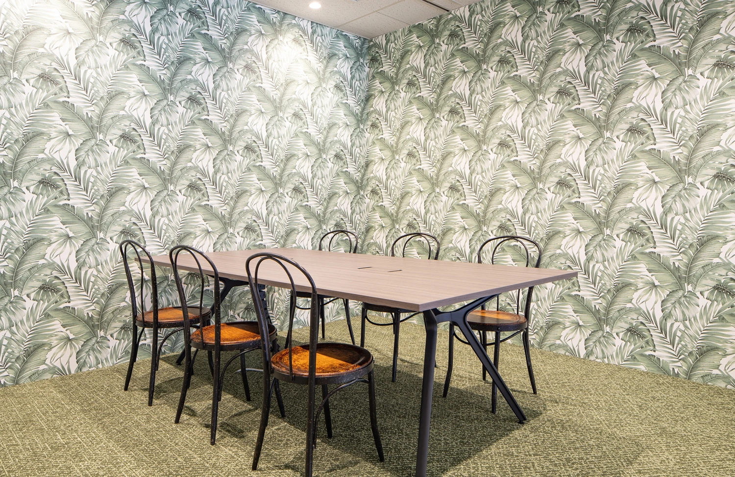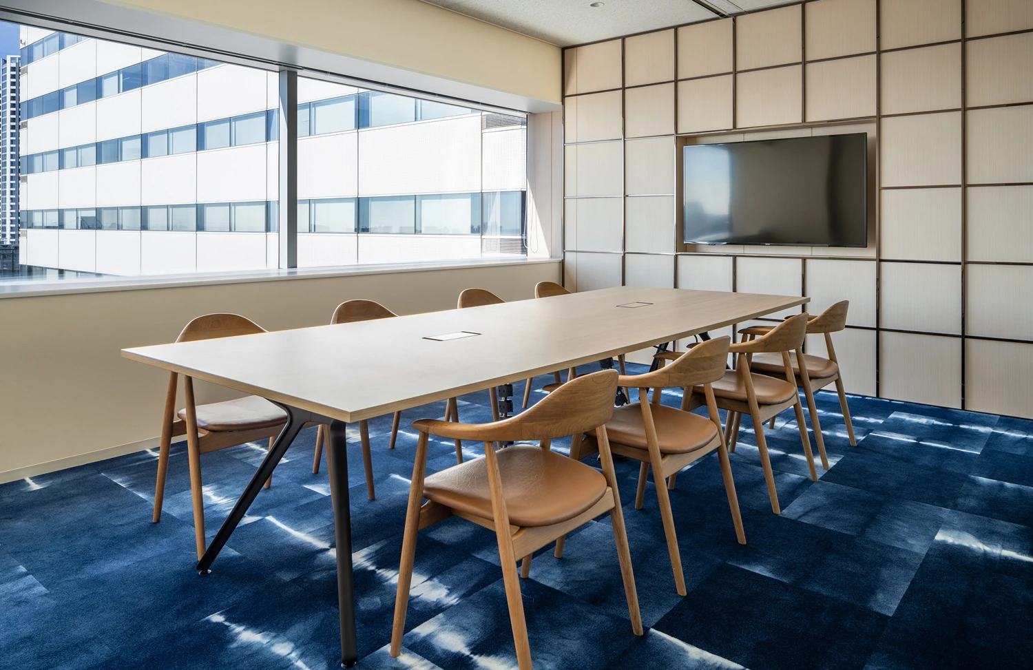 ワークエリアや会議室はテーマであるOCEAN/FORESTに合わせてブルーやアースカラーでまとめ、活気ある雰囲気を演出。また、グリーンを各所に取り入れることで明るくクリーンな印象を感じさせます。レイアウトに関しても、課題であるコミュニケーションと生産性・主体性を刺激するような開放感を意識して設計しました。