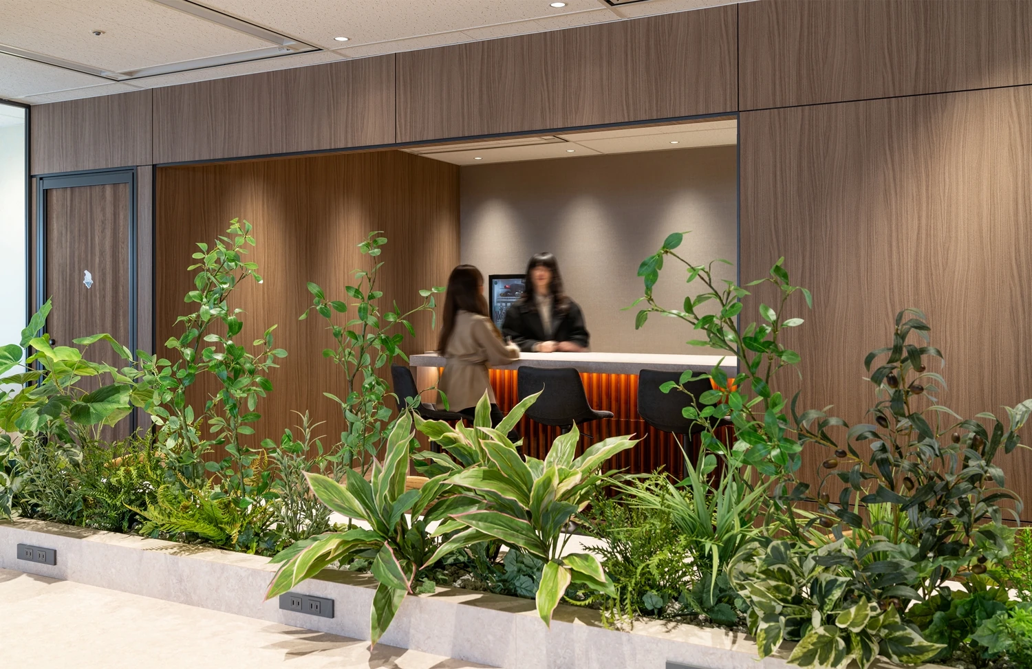 創業60周年を迎えた昭文社ホールディングス様にふさわしい雰囲気を表現できるよう、来客エリアはグレイッシュなトーンをベースに、シックで落ち着きのある空間に仕上げました。アクセントに木のテイストを取り入れることで、親しみやすく温かみを感じるホテルのラウンジのような空間を表現し、訪れた人の居心地の良さも重視しています。