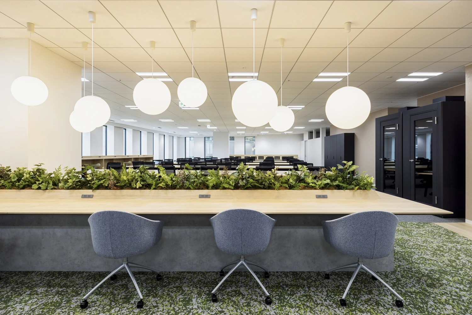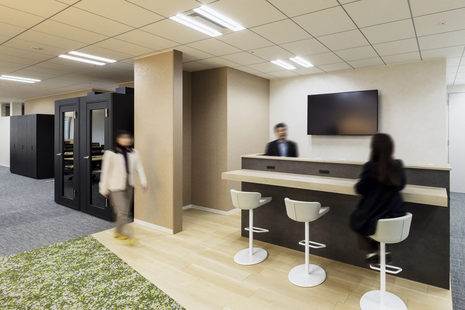 移転後に入居を決めた物件のビルは、”Well-being×ICTによる新しい働き方の発信地”を謳う新築ビル「アーバンネット御堂筋ビル」。ビル自体にコワーキングスペースや仮眠スペースなどの機能が充実しているため、テナント区画だけでなく、ビル全体を使ったフレキシブルな計画のもとプロジェクトを進行しました。エントランスは最小限の広さでインパクトを与え、ワークスペースに重きを置く設計に。3拠点のメンバーが円滑なコミュニケーションが行えるようワークスペースの壁は最小限にし、見通しの良い一体感のある空間にしました。また、パントリーやビックテーブルを中央に配置し、コミュニケーションが取りやすい雰囲気づくりを意識しました。窓際は眺望を活かし、集中ブースやカウンターを取り入れる事で1日の業務の中で気分転換ができるように工夫。キーウェア西日本様の初の取り組みとなるフリーアドレス導入にあたり、好きな場所で自由な働き方をしてもらう事で、「行きたくなるオフィス」の体現に努めました。