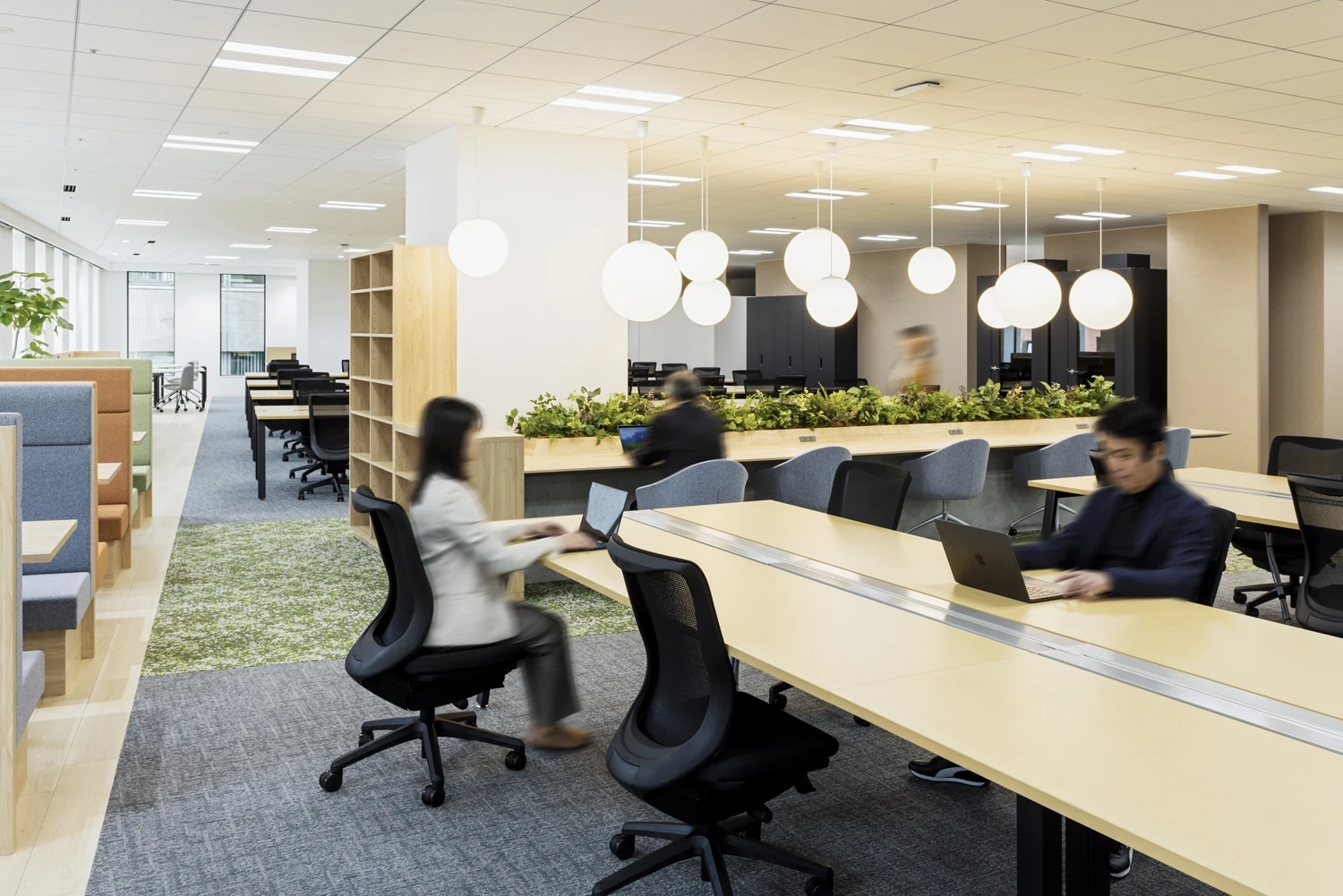 元々、分散していた3つの拠点の統合がきっかけで始まった今回のプロジェクト。メリハリをつけて働けるようリフレッシュスペースをつくったり、1日の業務内容に合わせて席を移動したりしながら働き方を選択できるようにすることで、オフィス以外の場所で働ける時代の中でもわざわざ行きたくなるようなオフィスにしたいという思いがありました。また、キーウェア西日本様を訪れた取引先の方々が「この会社と仕事がしたい!」と感じてもらえるような、仕事にも期待をしてもらうきっかけになるオフィスを目指しました。 -