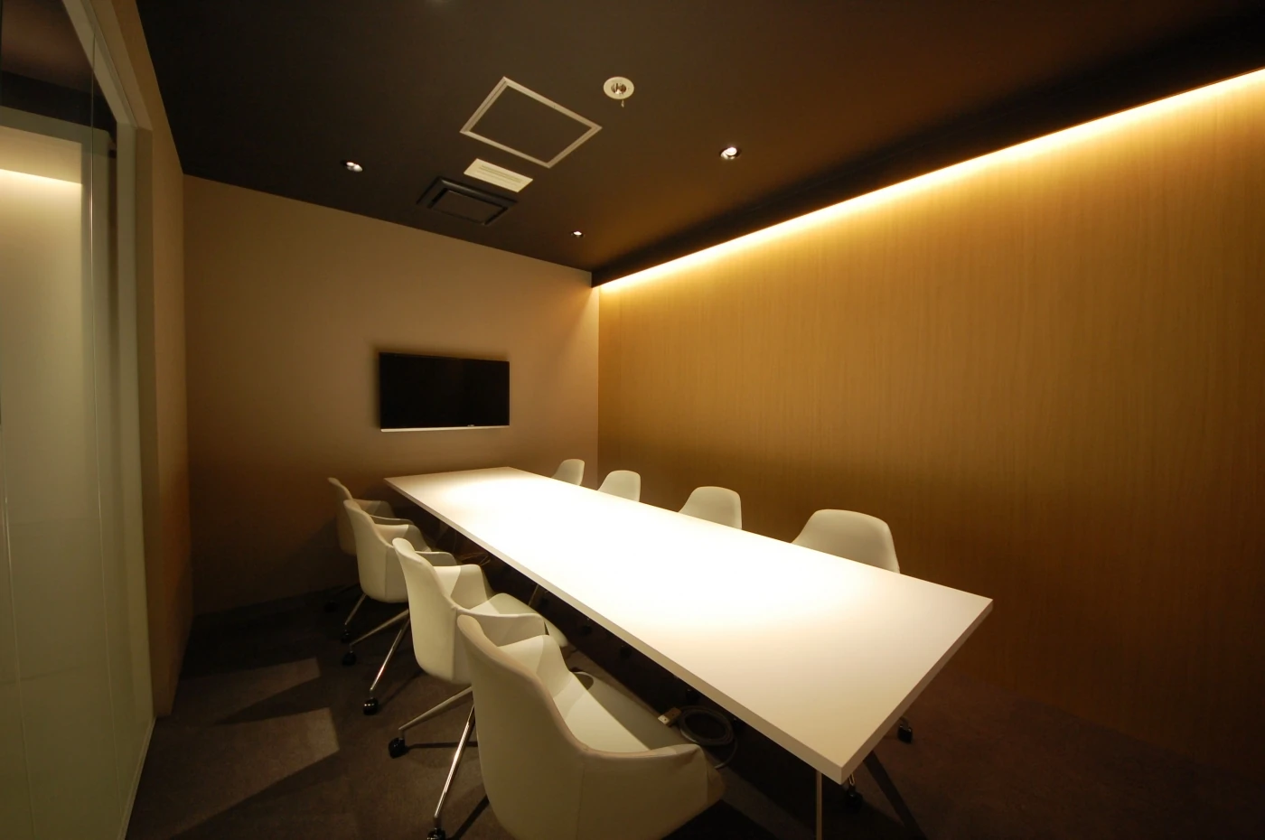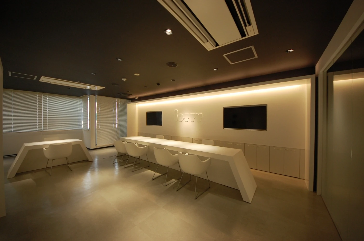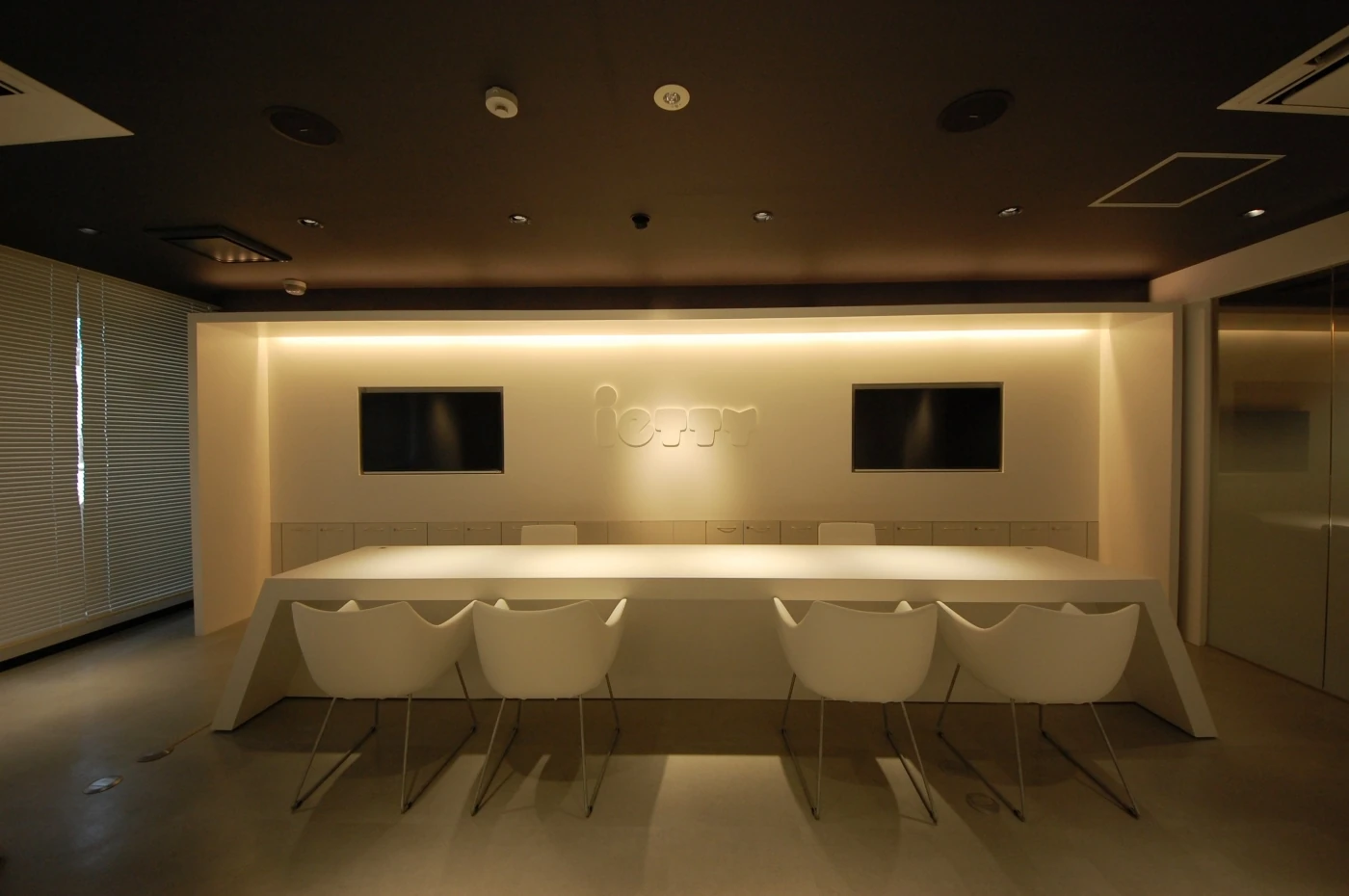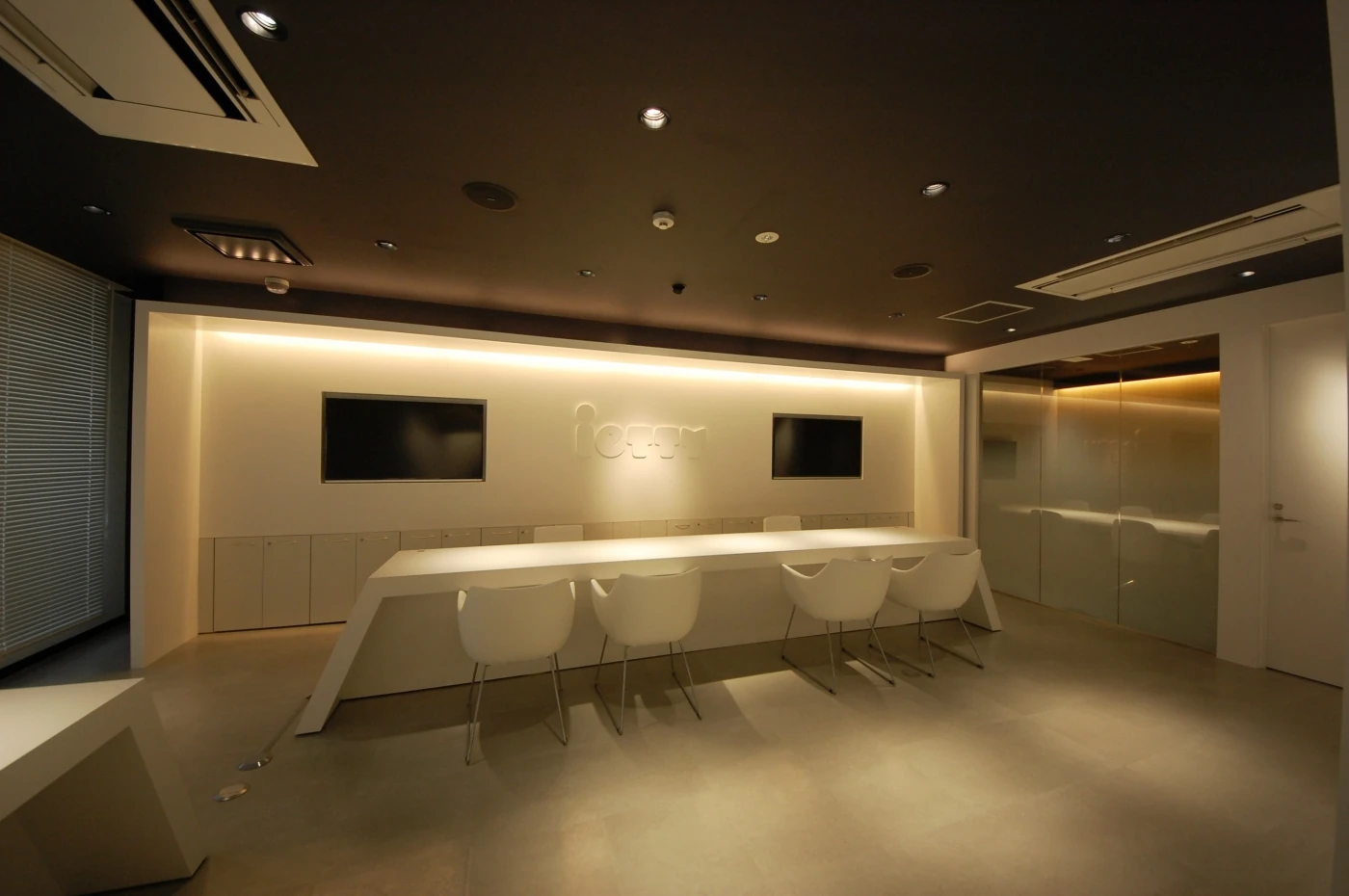 初の実店舗として求められたのは、お部屋探しに訪れたお客様に“安心”と“期待”を与える空間デザイン。エントランスのアーチを抜けると、真っ白なカウンターがお出迎え。一直線にのびる造作カウンターは脚の角度にもこだわり、不動産でありながらITベンチャーという顔を持つ同社らしく、近未来を感じさせるスマートなデザインに仕上げました。会議室も兼ねた個室は、間接照明のやわらかい光がほっと安らぐ、落ち着きのある空間に。お客様にとって、同社にとって、出発地点にふさわしい一号店になりました。この場所から、今日も新しい生活が始まります。