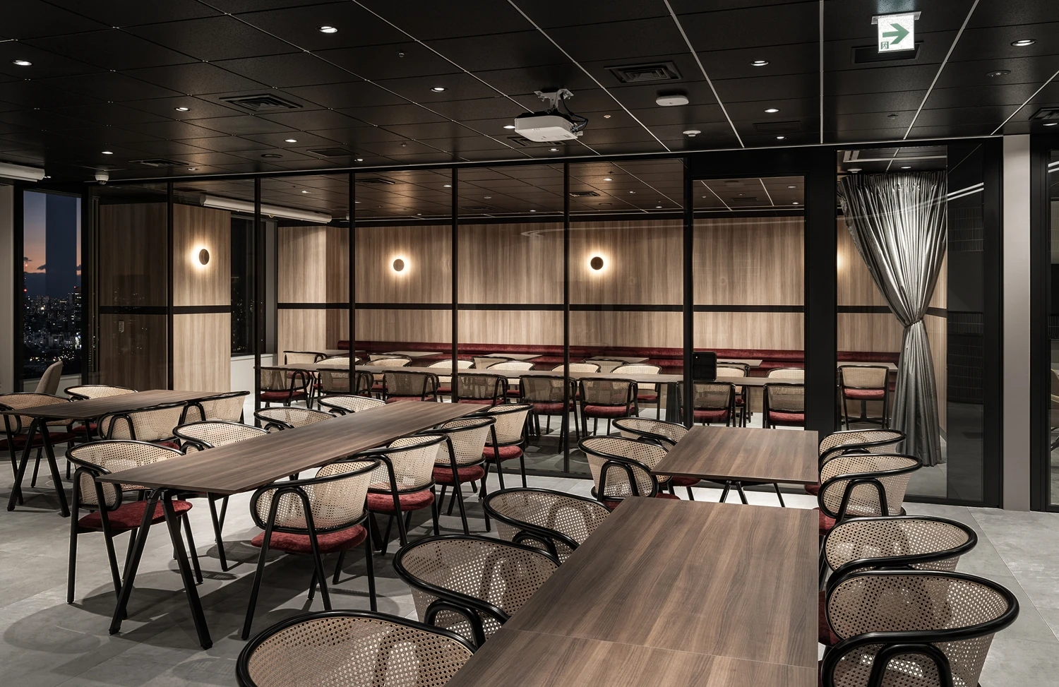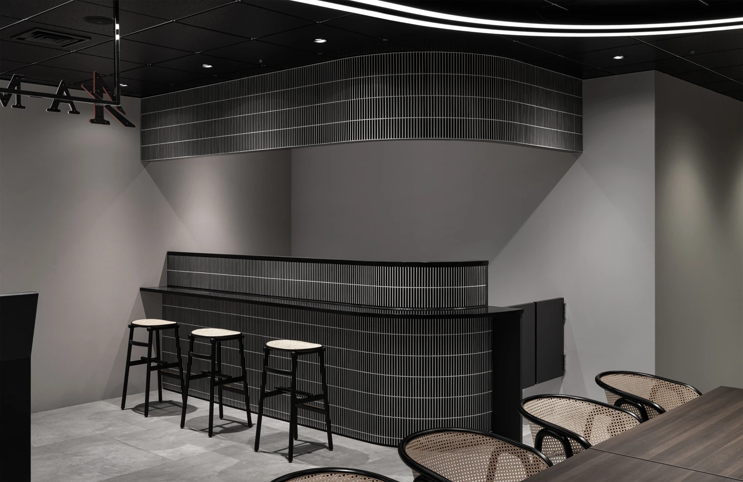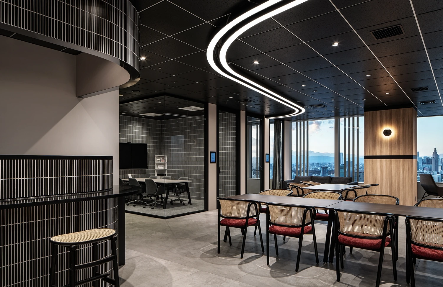デザインは黒を多用しスタイリッシュにまとめながらも、ポイントでコーポレートカラーや木目を使い、親しみやすさを演出。新しい人々の交流の場となるようデザインしました。
