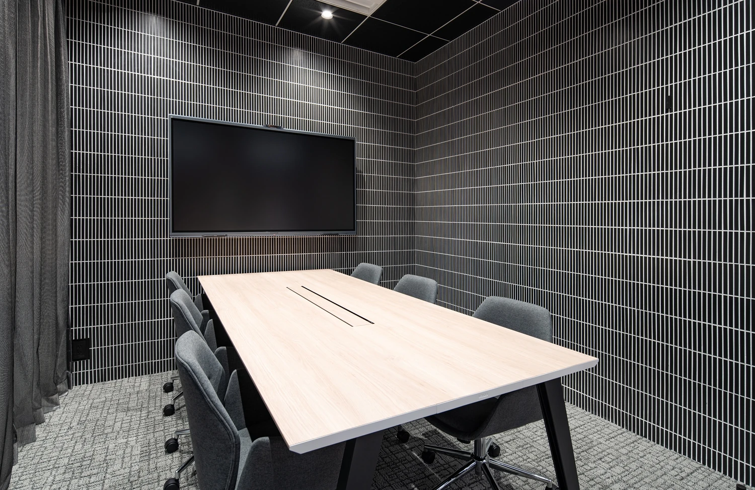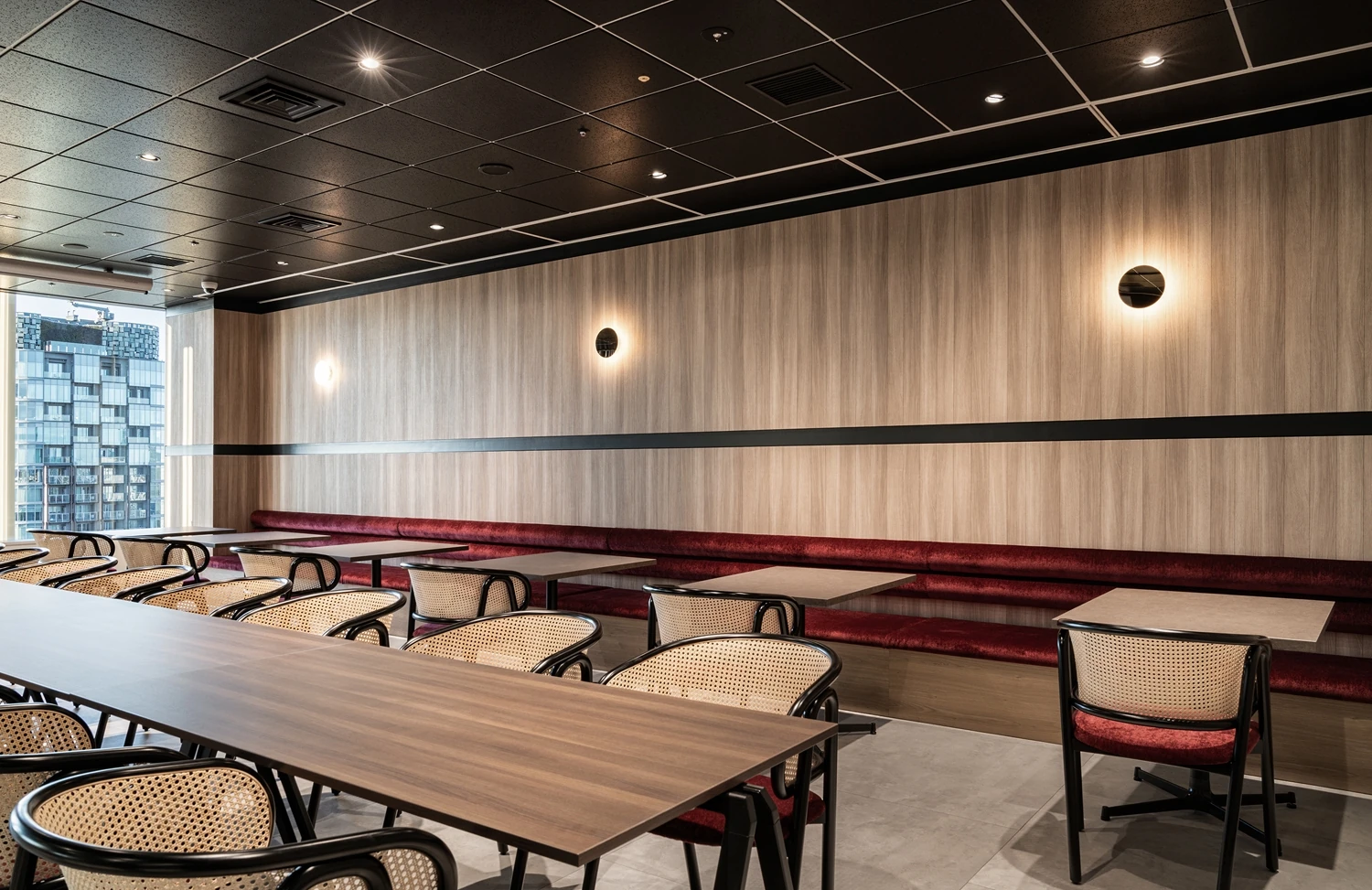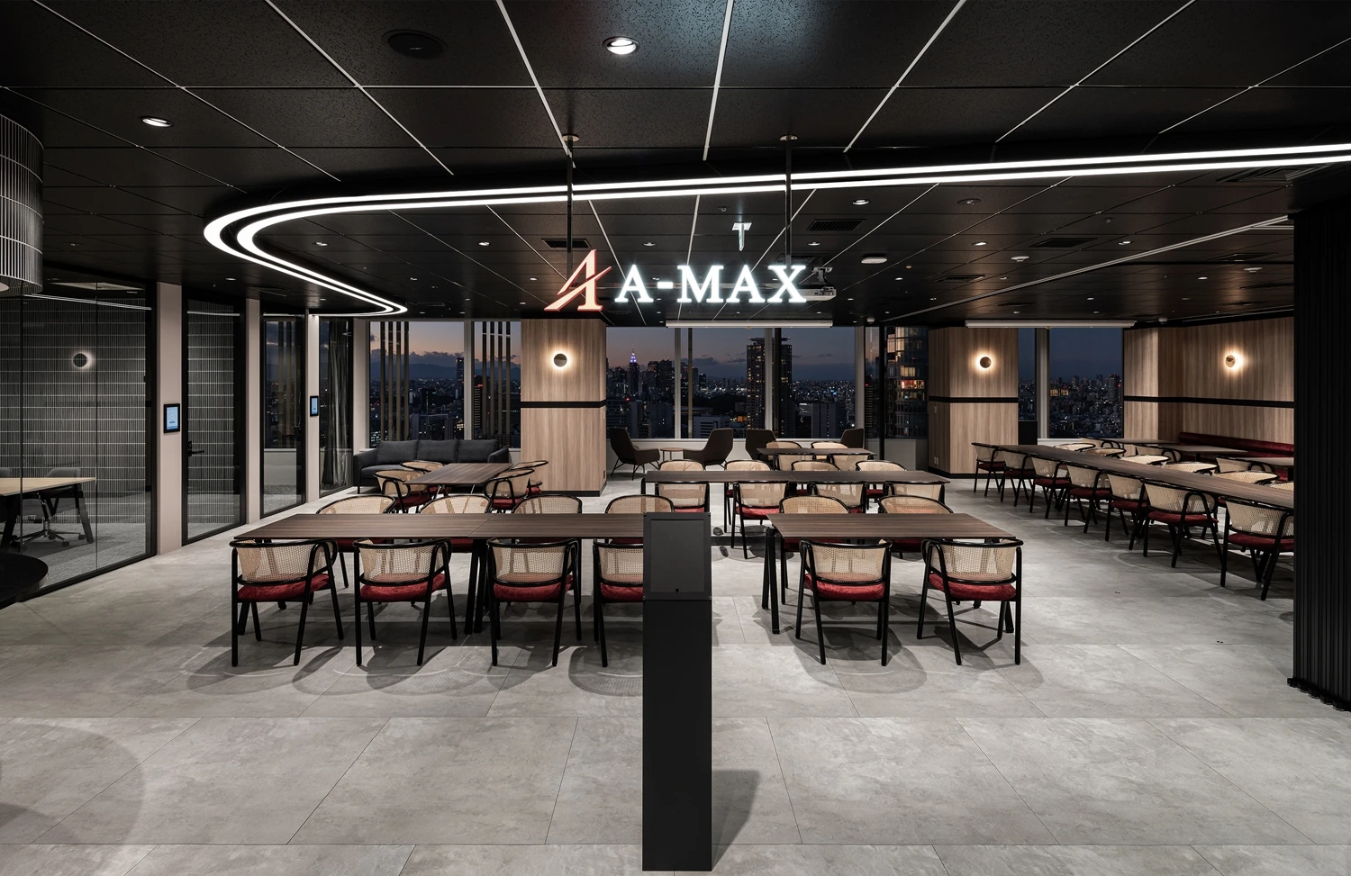 デザインは黒を多用しスタイリッシュにまとめながらも、ポイントでコーポレートカラーや木目を使い、親しみやすさを演出。新しい人々の交流の場となるようデザインしました。