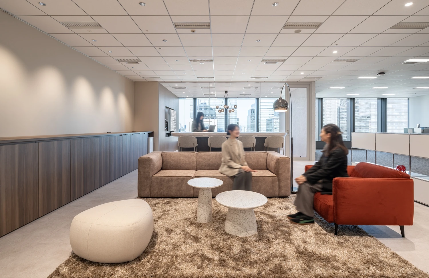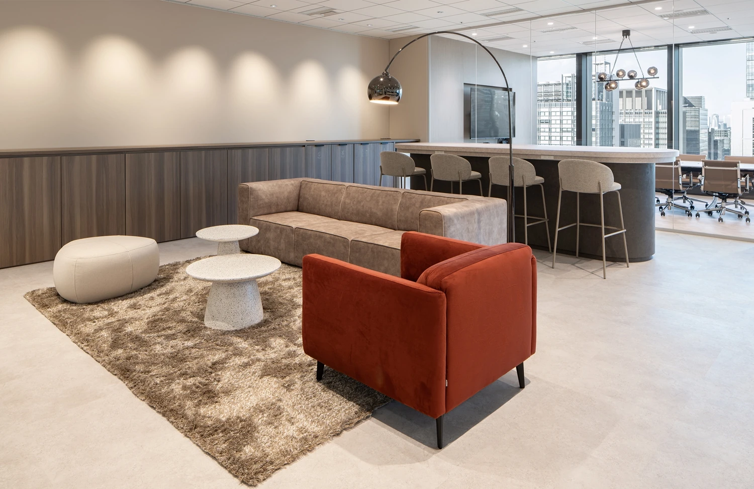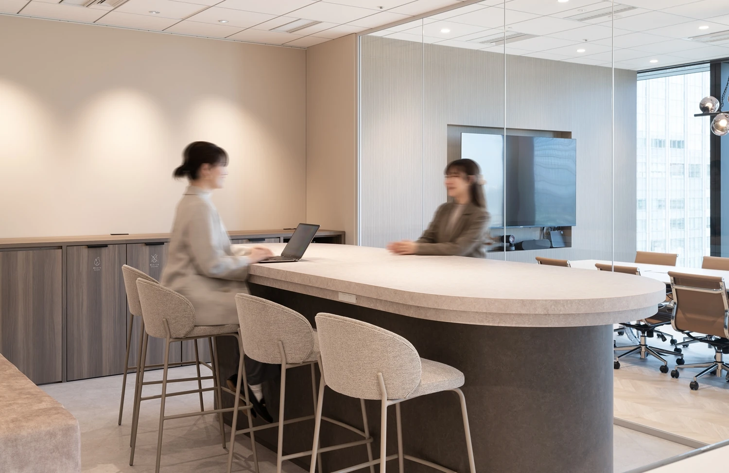 オフィスのコンセプトは『MUSUBI』。この場所がマーキュリア様とその先のお客様をつなぐ結び目になる大事な場所として長く機能し、さまざまな変化を受け入れることのできる空間であってほしいという意味が込められています。エントランスは透明感を感じるような抜け感のある広く明るい雰囲気のデザインに。世界企業の日本拠点として、信頼感やスケール感を表現できるような場を意識して設計しました。社内ミーティングやカジュアルな商談ができる多目的なラウンジエリアをエントランス正面に設置し、オープンでゆったりとした印象に仕上げています。また、パントリー機能を設けることで、マグネットスペースとして社内でのコミュニケーションの活性化も狙いました。