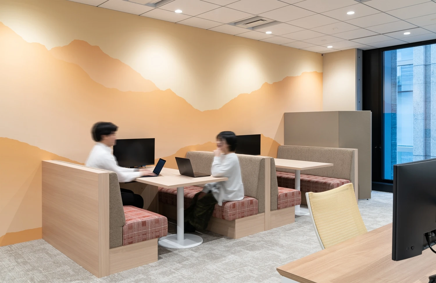 マテリアルは、トレンドの淡い色合いをベースに一部コーポレートカラーを想起させる配色をいれ、自然に全体のイメージがまとまるようデザイン。シンプルながら柄や色でアクセントも取り入れています。